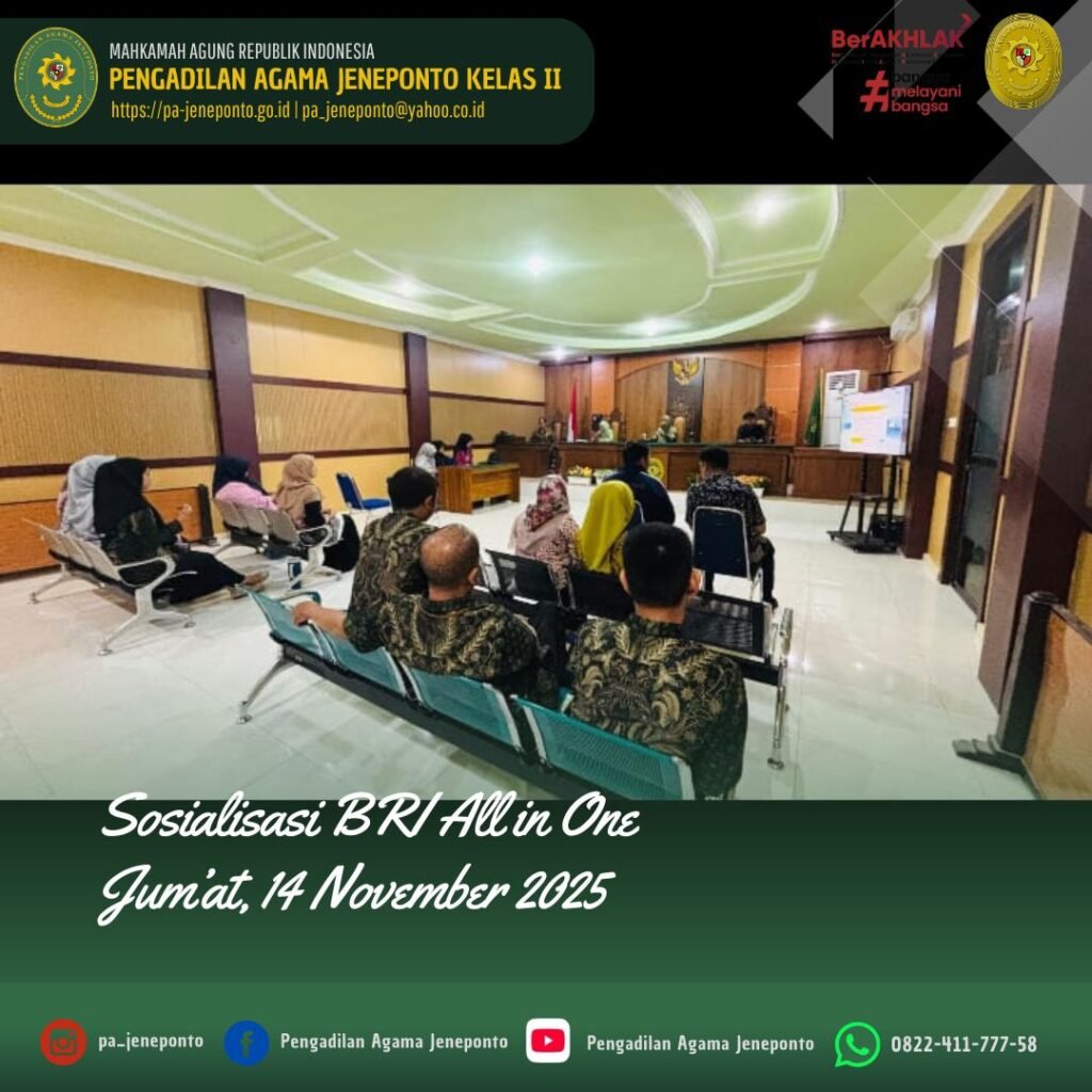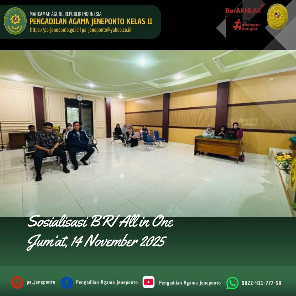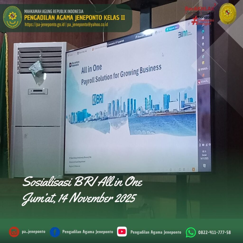 Jum’at pagi pukul 08.00 s.d. 10.00 Wita, Bertempat di Ruang Aula / Sidang Utama Pengadilan Agama Jeneponto, dilaksanakan Sosialisasi BRI All in One Payroll Solution for Growing Business, oleh Pimpinan Pengadilan Agama Jeneponto dihadiri unsur pimpinan yaitu Ketua, Wakil Ketua, Hakim, Panitera dan Sekretaris Pengadilan Agama Jeneponto, Pejabat Struktural, Fungsional serta PPPK dan CPNS Pengadilan Agama Jeneponto, serta karyawan BRI.