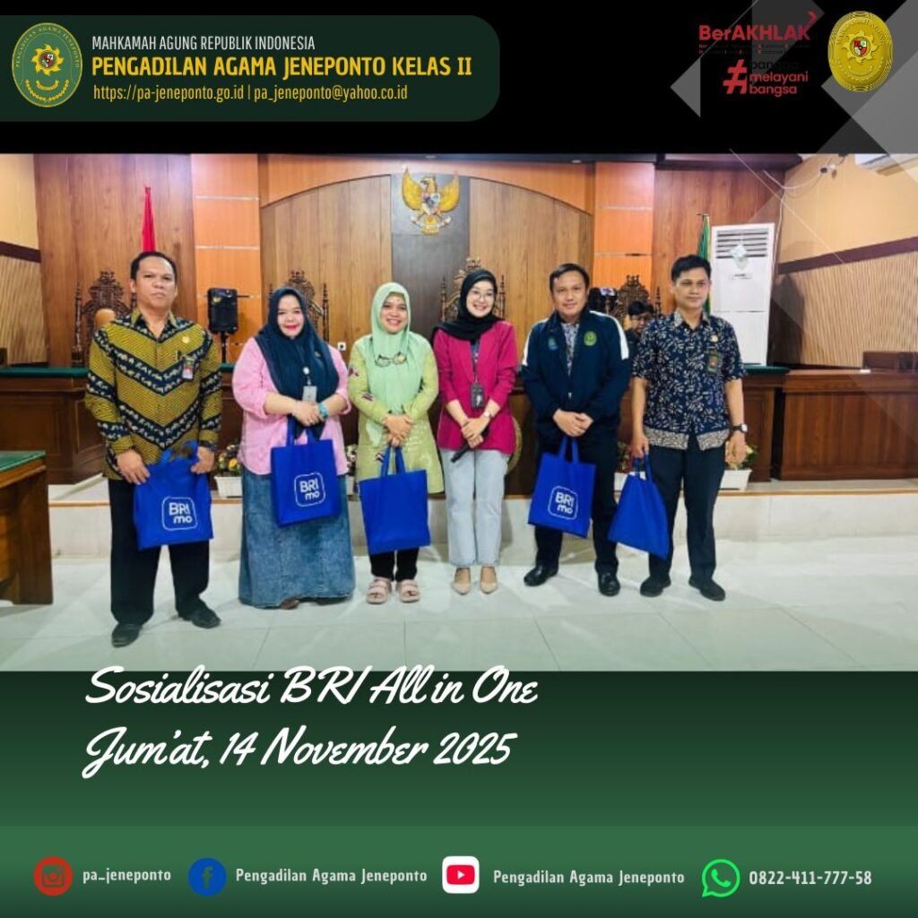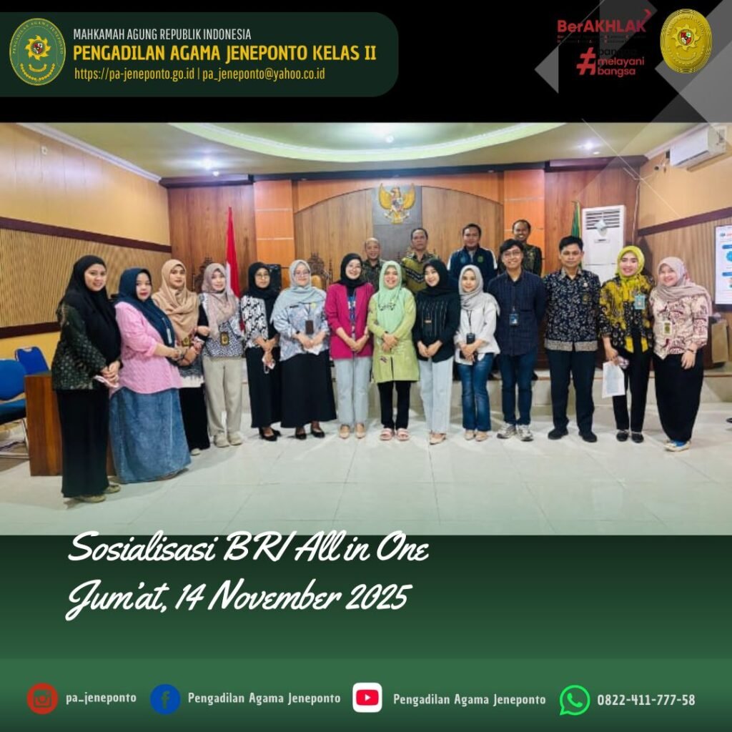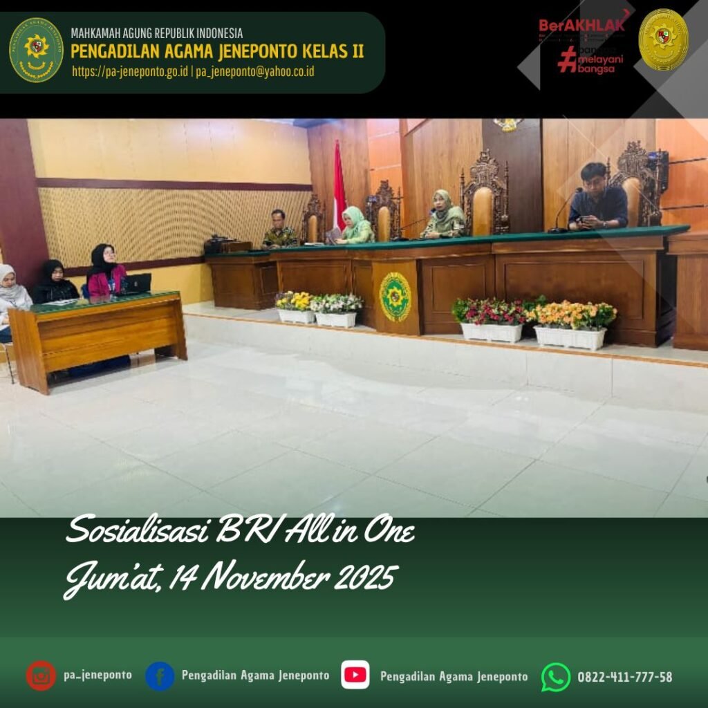 Jum’at pagi pukul 08.00 s.d. 10.00 Wita, Bertempat di Ruang Aula / Sidang Utama Pengadilan Agama Jeneponto, dilaksanakan Sosialisasi BRI All in One Payroll Solution for Growing Business, oleh Pimpinan Pengadilan Agama Jeneponto dihadiri unsur pimpinan yaitu Ketua, Wakil Ketua, Hakim, Panitera dan Sekretaris Pengadilan Agama Jeneponto, Pejabat Struktural, Fungsional serta PPPK dan CPNS Pengadilan Agama Jeneponto, serta karyawan BRI.