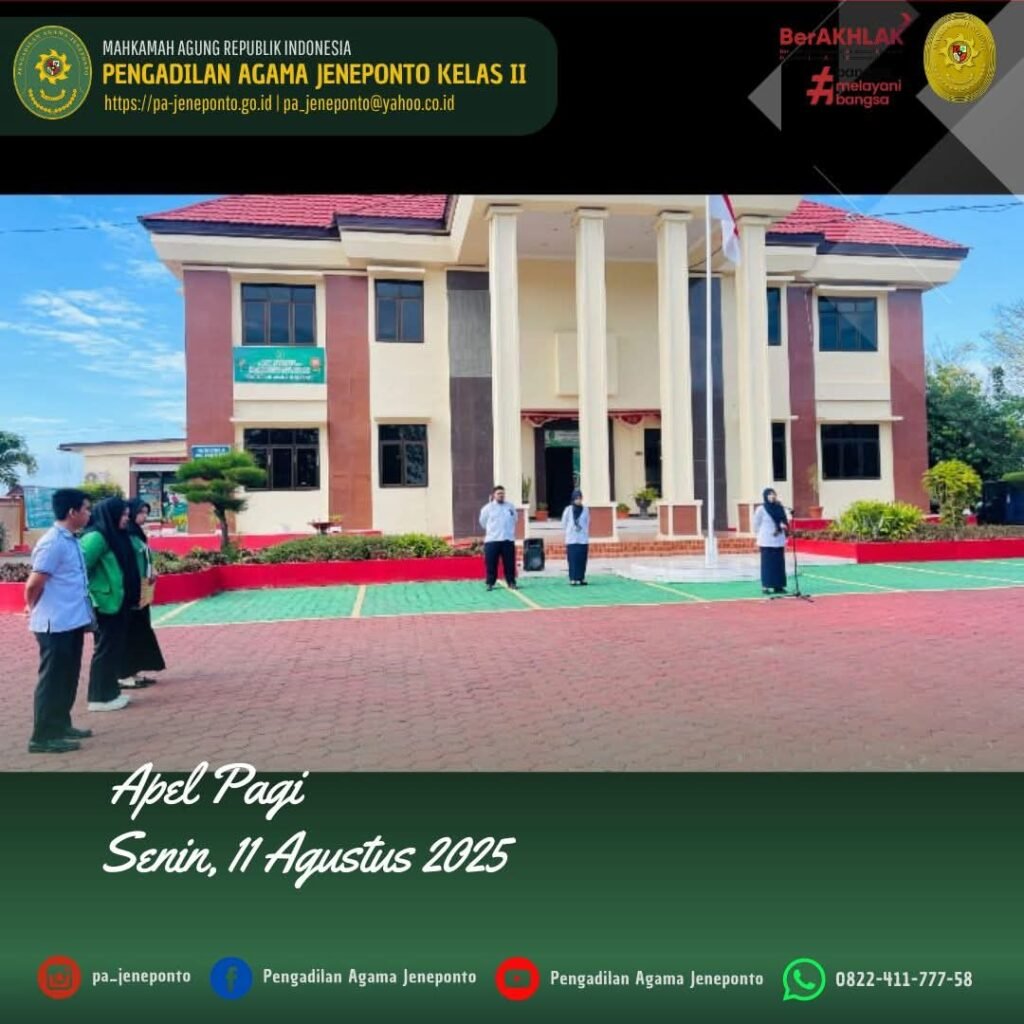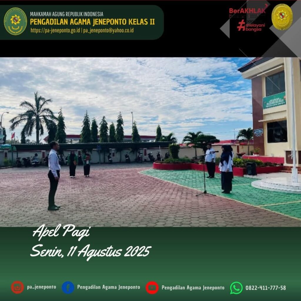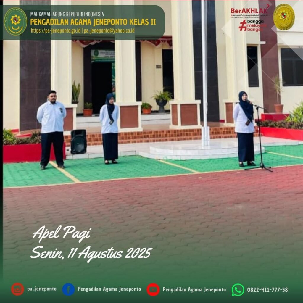 Apel Rutin setiap hari Senin Pagi yang diikuti oleh seluruh Aparatur Pengadilan Agama Jeneponto, dilaksanakan di Halaman Kantor Pengadilan Agama Jeneponto, yang bertindak sebagai Pembina Apel, Fadilah, S.Ag., M.H., Ketua Pengadilan Agama Jeneponto, Patta Jalo, Pemimpin Upacara, Peserta Upacara Wakil, Hakim, Panitera, Sekretaris, seluruh Pejabat Struktural dan Fungsional serta PPNPN, CPNS Pengadilan Agama Jeneponto, dan mahasiswa PPL dan siswa PKL, dalam kesempatan tersebut Beliau menyampaikan beberapa hal.