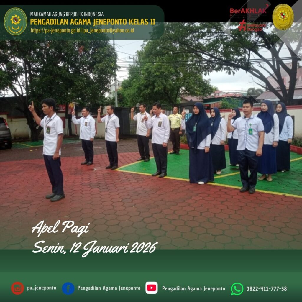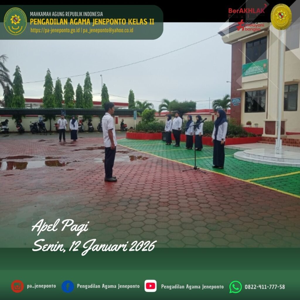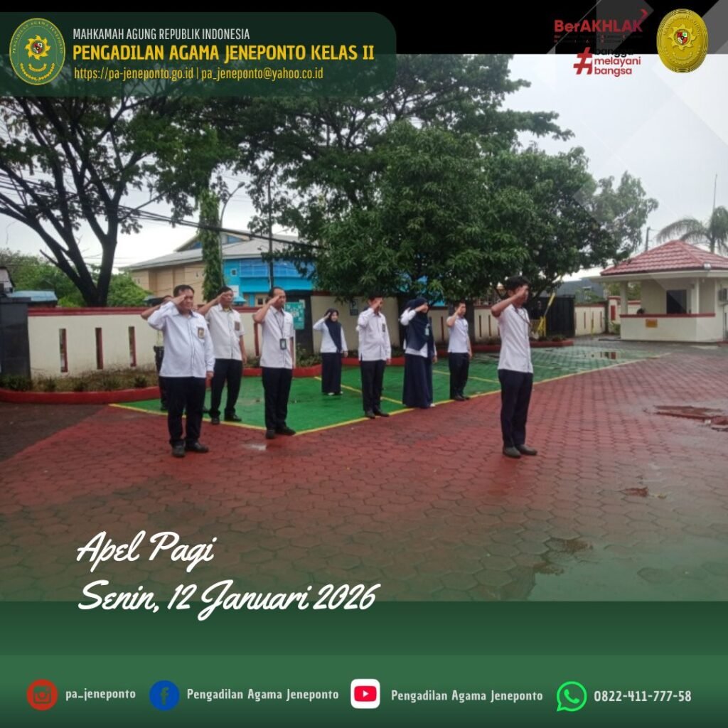 Apel Rutin setiap hari Senin Pagi yang diikuti oleh seluruh Aparatur Pengadilan Agama Jeneponto, dilaksanakan di Halaman Kantor Pengadilan Agama Jeneponto, yang bertindak sebagai Pembina Apel, Marwani R, S.H., Hakim Pengadilan Agama Jeneponto, Ahmad.B., S.H., Pemimpin Upacara, Peserta Upacara, Ketua, Wakil Ketua, Hakim, Panitera, seluruh Pejabat Struktural dan Fungsional serta PPPK, dan CPNS Pengadilan Agama Jeneponto, dalam kesempatan tersebut Beliau menyampaikan beberapa hal.