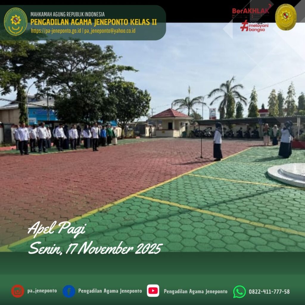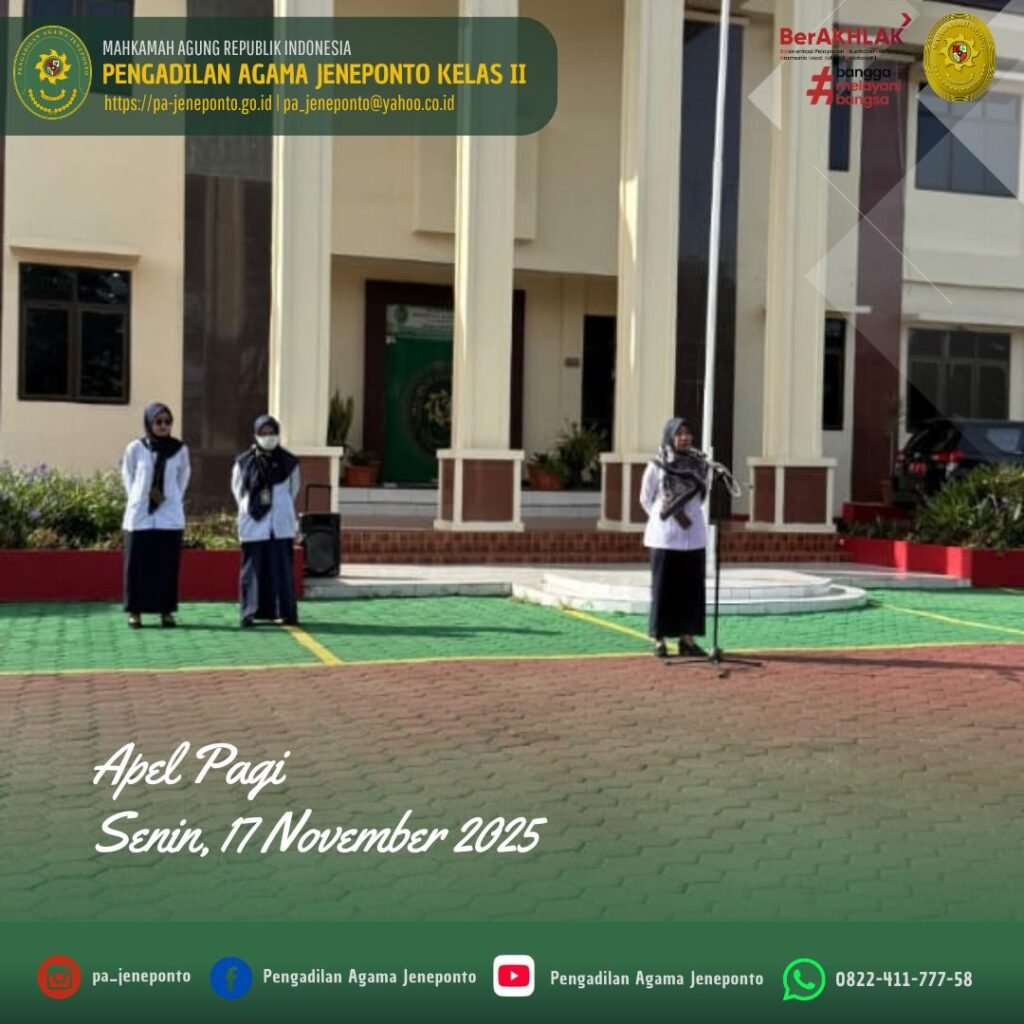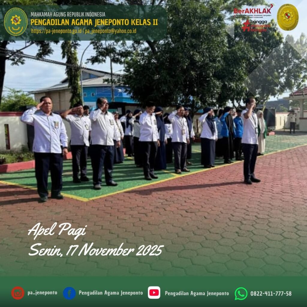 Apel Rutin setiap hari Senin Pagi yang diikuti oleh seluruh Aparatur Pengadilan Agama Jeneponto, dilaksanakan di Halaman Kantor Pengadilan Agama Jeneponto, yang bertindak sebagai Pembina Apel, Fadilah, S.H.,M.H., Ketua Pengadilan Agama Jeneponto, Ikhwan Triantoro, S.T., Pemimpin Upacara, Peserta Upacara Ketua, Hakim, Panitera, seluruh Pejabat Struktural dan Fungsional serta PPPK, CPNS Pengadilan Agama Jeneponto, dan siswa PKL dalam kesempatan tersebut Beliau menyampaikan beberapa hal.