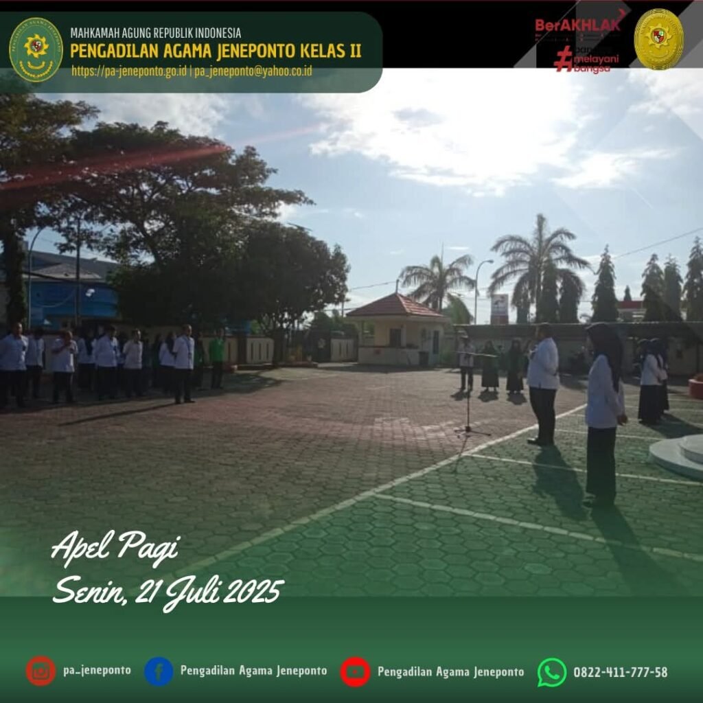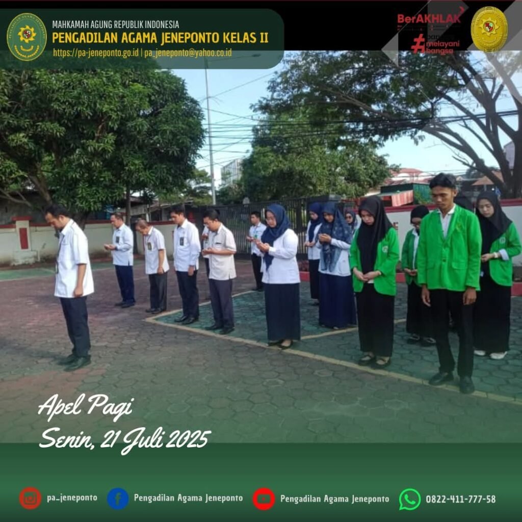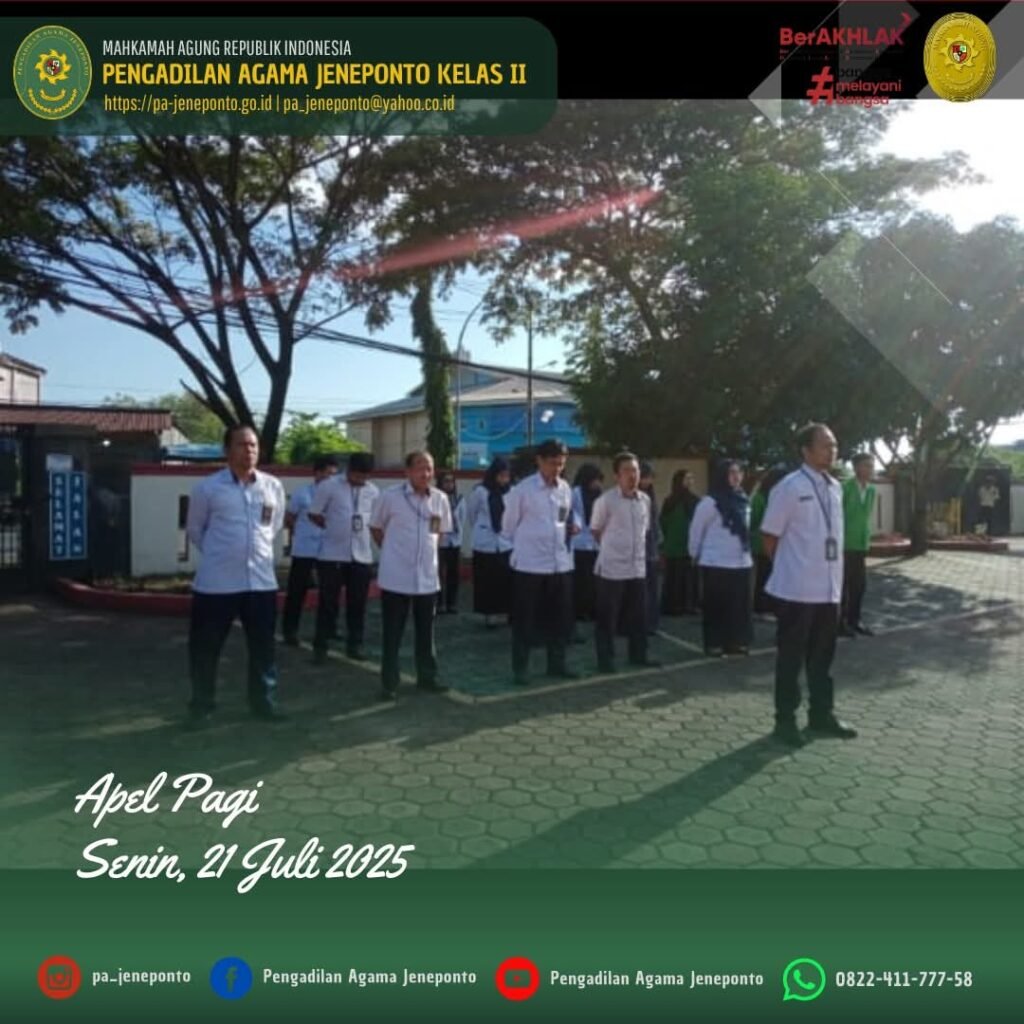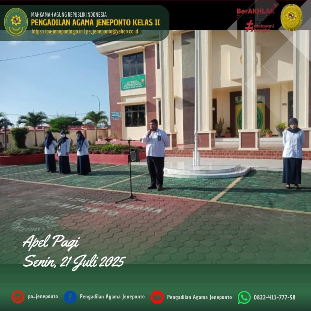 Apel Rutin setiap hari Senin Pagi yang diikuti oleh seluruh Aparatur Pengadilan Agama Jeneponto, dilaksanakan di Halaman Kantor Pengadilan Agama Jeneponto, yang bertindak sebagai Pembina Apel, Muhammad Arif, S.H., Hakim Ketua Pengadilan Agama Jeneponto, Muh. Ikhwan Triantoro, S.T., Pemimpin Upacara, Peserta Upacara Ketua, Wakil, Hakim, Panitera, Sekretaris, seluruh Pejabat Struktural dan Fungsional serta PPNPN dan CPNS Pengadilan Agama Jeneponto, beserta mahasiswa PPL, dalam kesempatan tersebut Beliau menyampaikan beberapa hal.