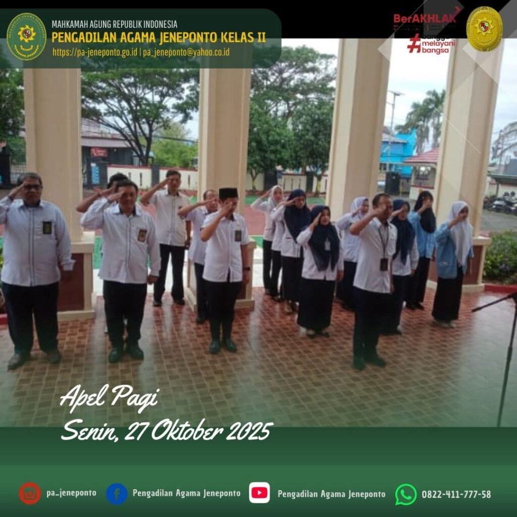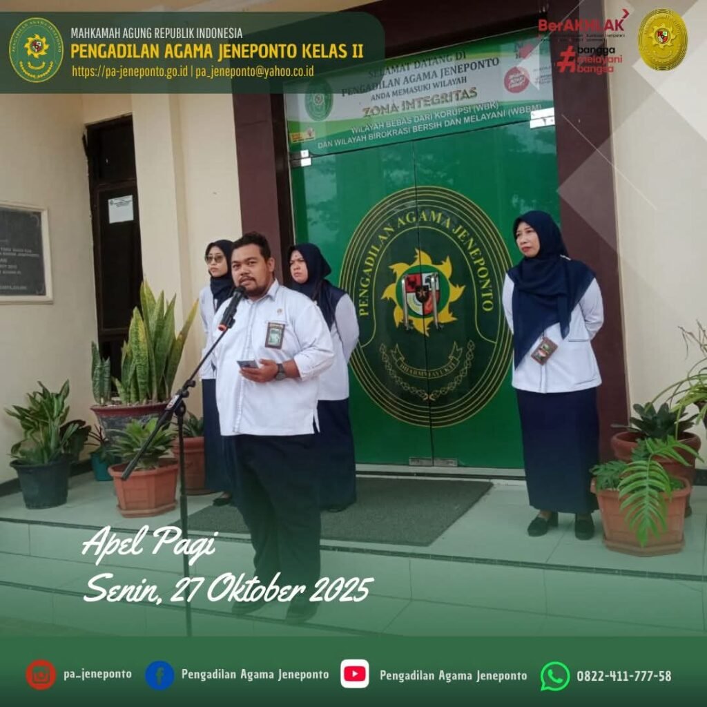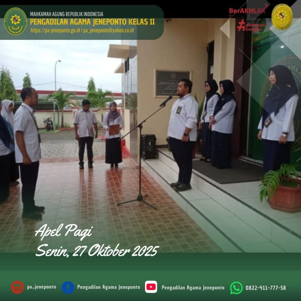 Apel Rutin setiap hari Senin Pagi yang diikuti oleh seluruh Aparatur Pengadilan Agama Jeneponto, dilaksanakan di Halaman Kantor Pengadilan Agama Jeneponto, yang bertindak sebagai Pembina Apel, Muhammad Arif, S.H., Hakim Pengadilan Agama Jeneponto, Ikhwan Triantoro, S.T.,, Pemimpin Upacara, Peserta Upacara Ketua, Hakim, Panitera, seluruh Pejabat Struktural dan Fungsional serta PPPK, CPNS Pengadilan Agama Jeneponto, dan siswa PKL dalam kesempatan tersebut Beliau menyampaikan beberapa hal.