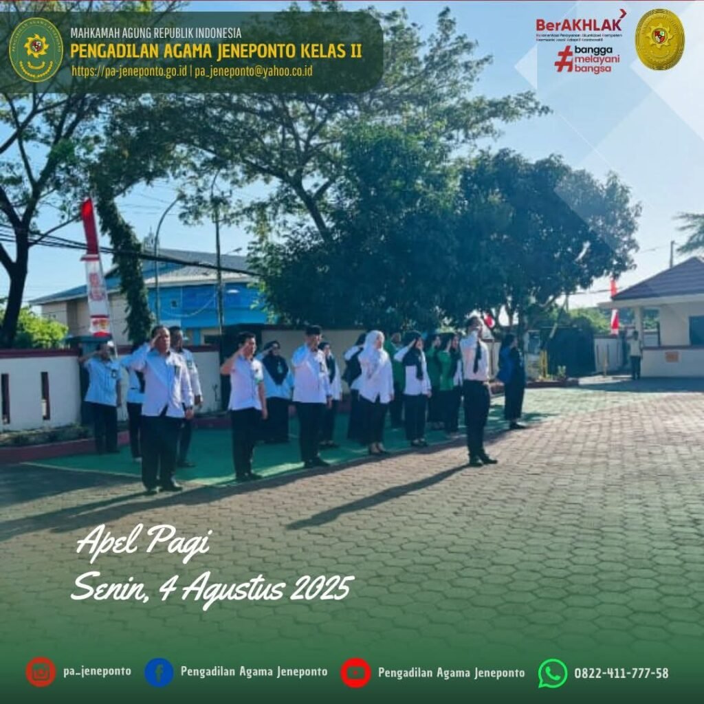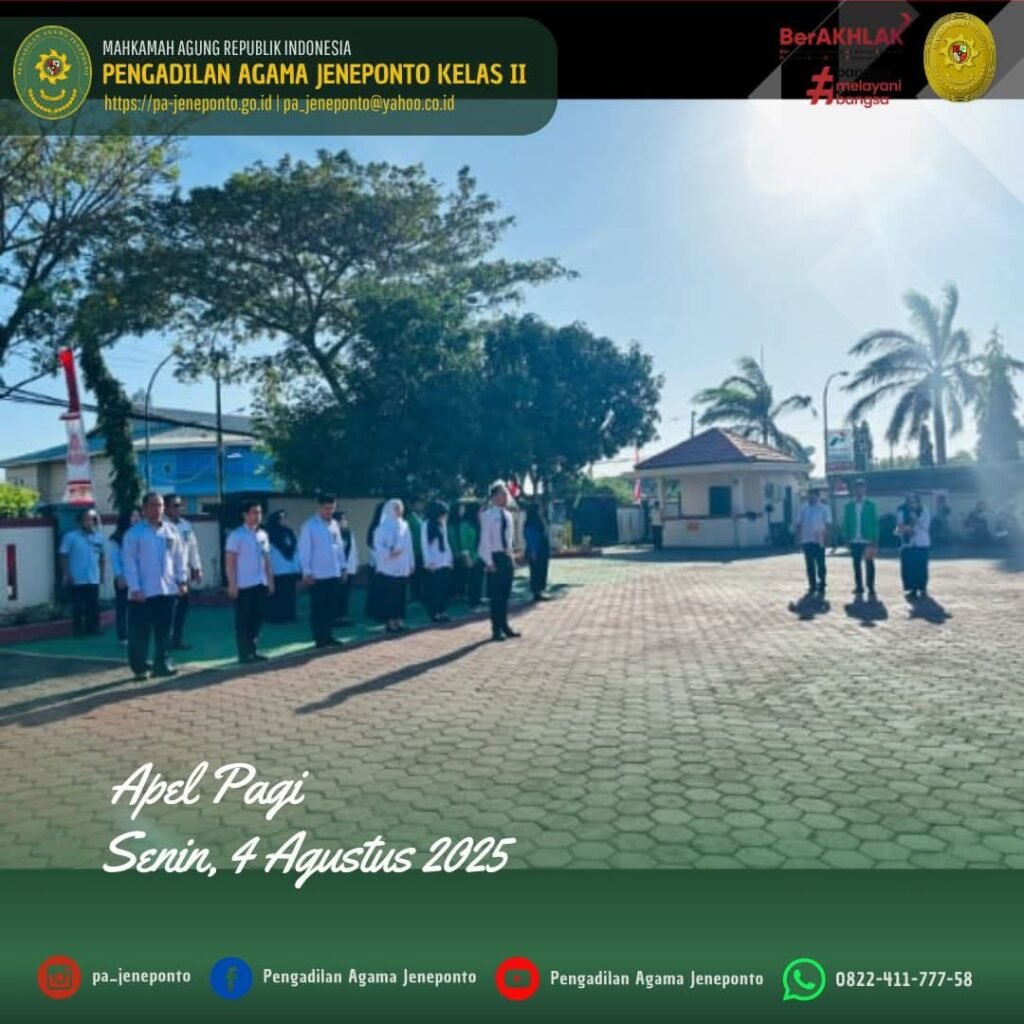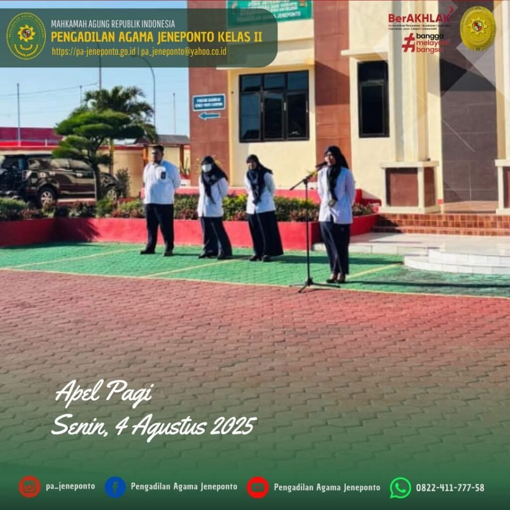 Apel Rutin setiap hari Senin Pagi yang diikuti oleh seluruh Aparatur Pengadilan Agama Jeneponto, dilaksanakan di Halaman Kantor Pengadilan Agama Jeneponto, yang bertindak sebagai Pembina Apel, Ulin Nadya Rif’atur Rohmah, S.H., Hakim Ketua Pengadilan Agama Jeneponto, Muh. Ikhwan Triantoro, S.T., Pemimpin Upacara, Peserta Upacara Ketua, Wakil, Hakim, Panitera, Sekretaris, seluruh Pejabat Struktural dan Fungsional serta PPNPN dan CPNS Pengadilan Agama Jeneponto, beserta mahasiswa PPL dan siswa PKL, dalam kesempatan tersebut Beliau menyampaikan beberapa hal.