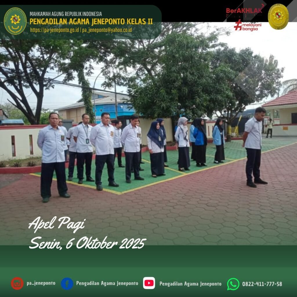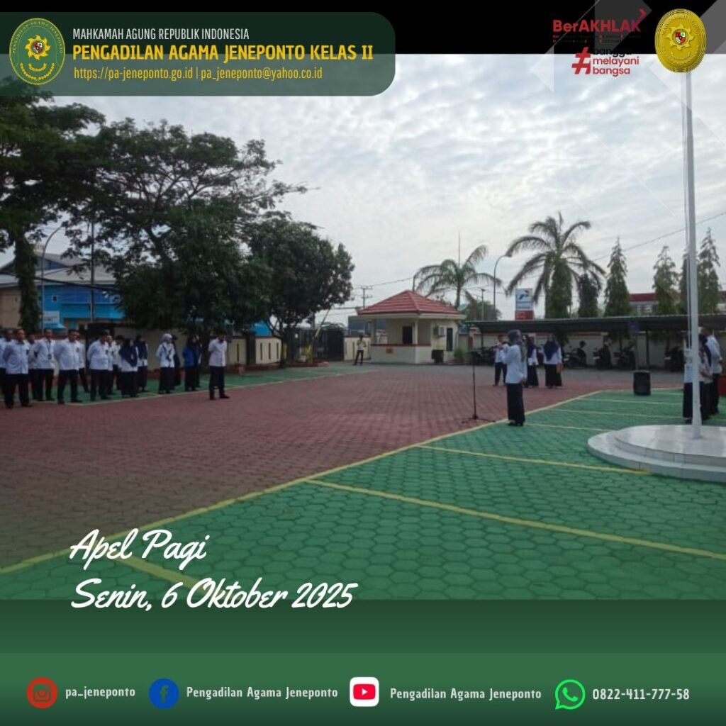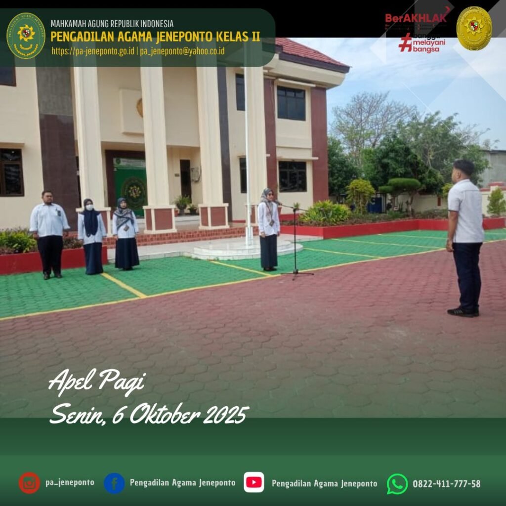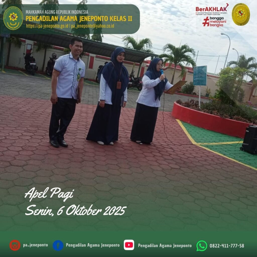Apel Rutin setiap hari Senin Pagi yang diikuti oleh seluruh Aparatur Pengadilan Agama Jeneponto, dilaksanakan di Halaman Kantor Pengadilan Agama Jeneponto, yang bertindak sebagai Pembina Apel, Ulin Nadya Rif’atur Rohmah, S.H., Hakim Pengadilan Agama Jeneponto, Muh. Fahrul Rozy, S.H., Pemimpin Upacara, Peserta Upacara Ketua, Wakil, Hakim, Panitera, Sekretaris, seluruh Pejabat Struktural dan Fungsional serta PPPK, CPNS Pengadilan Agama Jeneponto, dalam kesempatan tersebut Beliau menyampaikan beberapa hal.