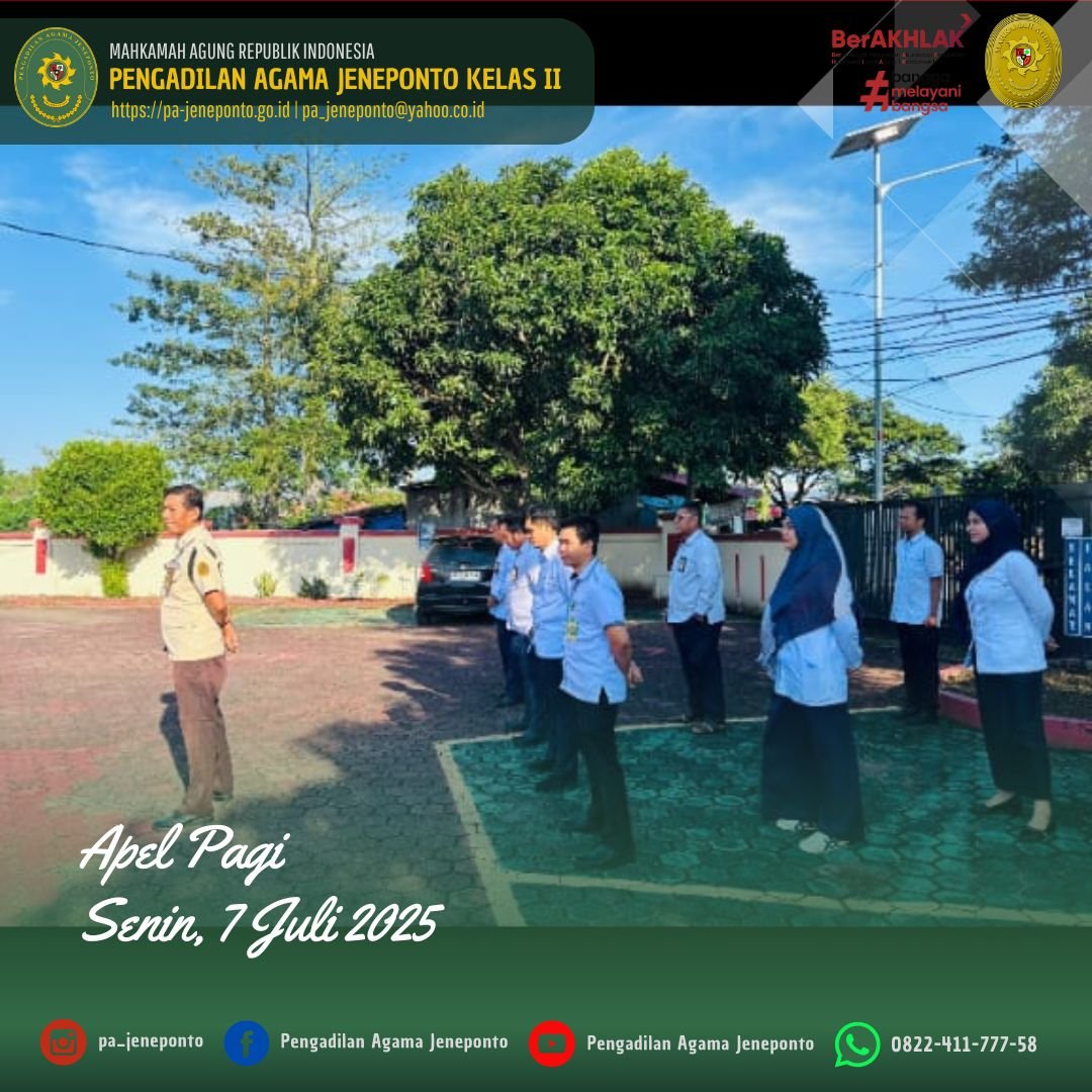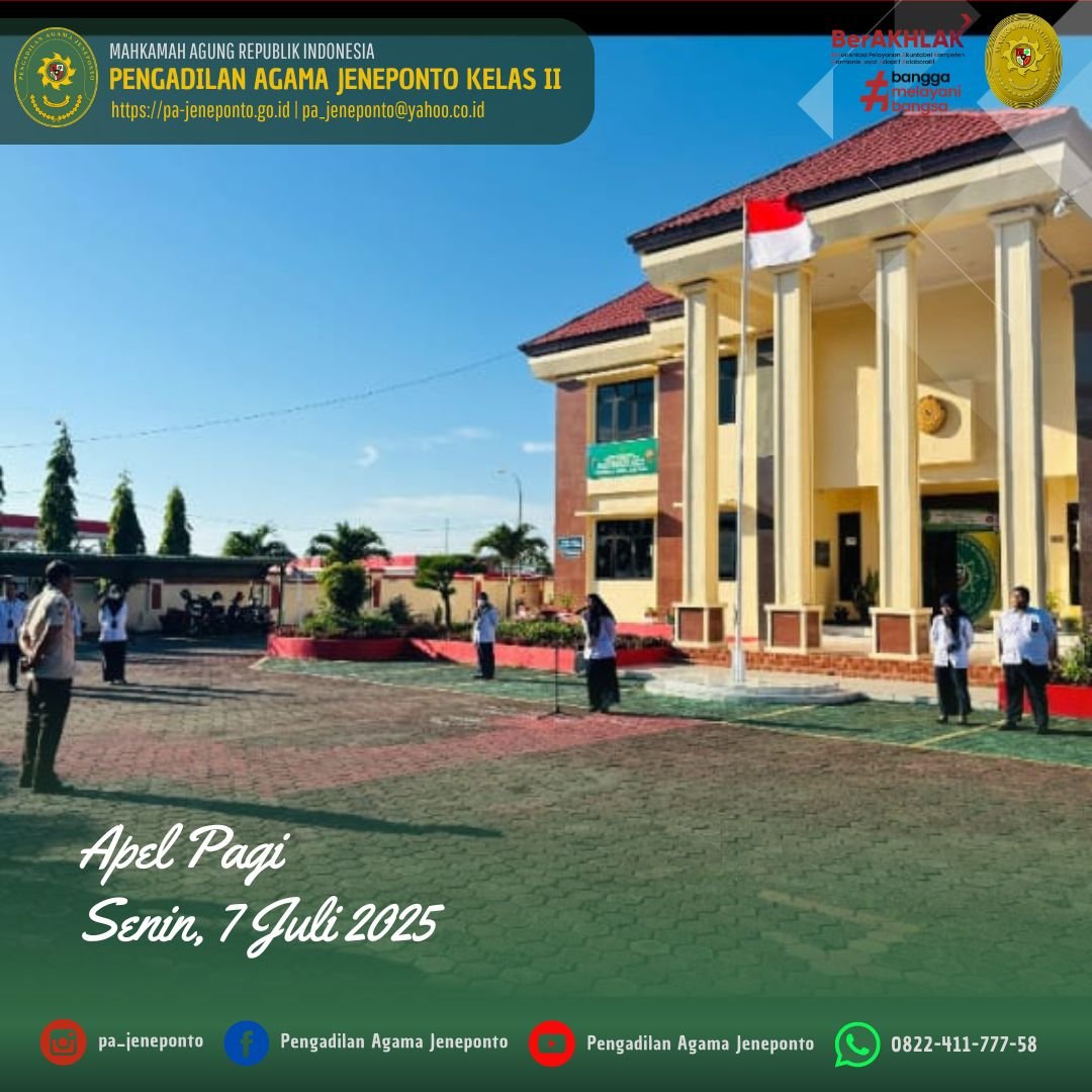 Apel Rutin setiap hari Senin Pagi yang diikuti oleh seluruh Aparatur Pengadilan Agama Jeneponto, dilaksanakan di Halaman Kantor Pengadilan Agama Jeneponto, yang bertindak sebagai Pembina Apel, Fadilah, S.Ag., M.H., Ketua Pengadilan Agama Jeneponto, Patta Jalo, Pemimpin Upacara, Peserta Upacara Wakil, Hakim, Panitera, Sekretaris, seluruh Pejabat Struktural dan Fungsional serta PPNPN dan CPNS Pengadilan Agama Jeneponto, dalam kesempatan tersebut Beliau menyampaikan beberapa hal.