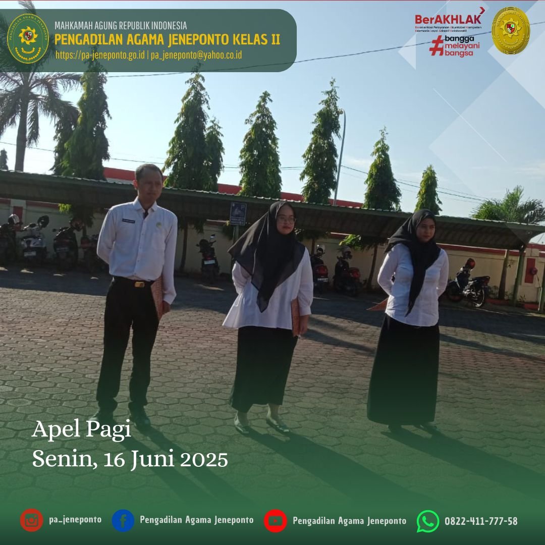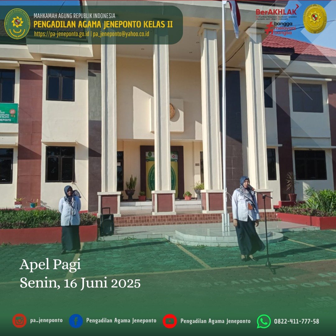 Apel Rutin setiap hari Senin Pagi yang diikuti oleh seluruh Aparatur Pengadilan Agama Jeneponto, dilaksanakan di Halaman Kantor Pengadilan Agama Jeneponto, yang bertindak sebagai Pembina Apel, Bahjah Zal Fitri, S.H.I.,M.H., Hakim Pengadilan Agama Jeneponto, Muh. Fahrul Rozy, Pemimpin Upacara, Peserta Upacara Wakil, Panitera, Sekretaris, seluruh Pejabat Struktural dan Fungsional serta PPNPN dan CPNS Pengadilan Agama Jeneponto, dalam kesempatan tersebut Beliau menyampaikan beberapa hal.