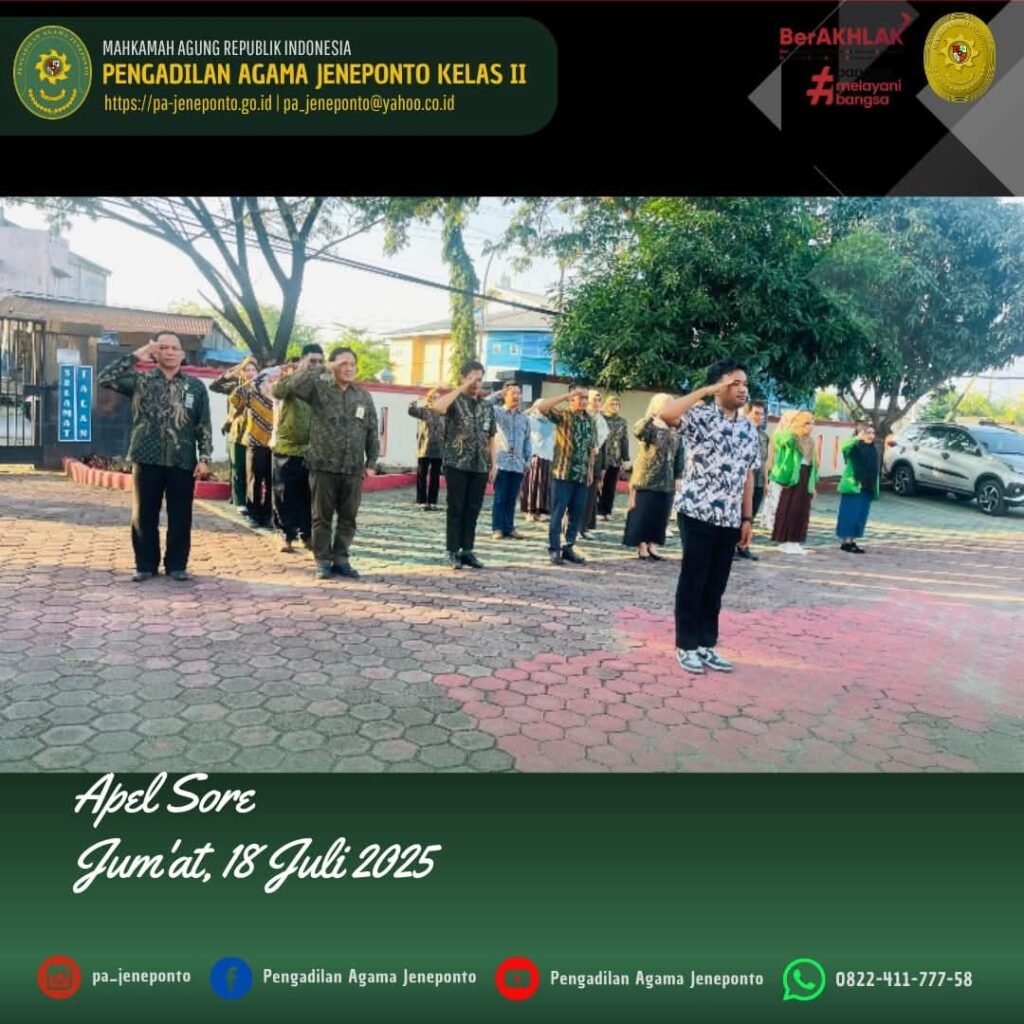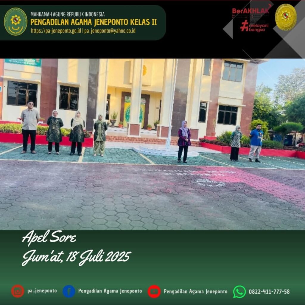 Apel Pulang hari Jumat Sore, dilaksanakan di Halaman Kantor Pengadilan Agama Jeneponto, yang bertindak sebagai pembina Apel, Ruhana Faried, S.H.I.M.H.I., Wakil Ketua Pengadilan Agama Jeneponto, serta Pemimpin Apel Fahrul Rozy, Peserta Apel sore Ketua, Hakim, Sekretaris, Panitera, seluruh Pejabat Struktural dan Fungsional serta PPNPN, dan CPNS Pengadilan Agama Jeneponto, dan mahasiswa(i) PPL, dalam kesempatan tersebut Beliau menyampaikan beberapa hal.