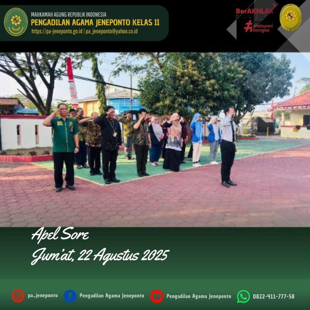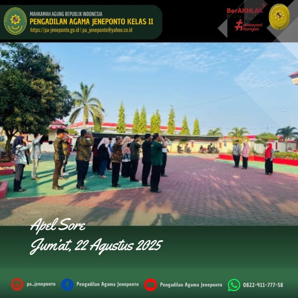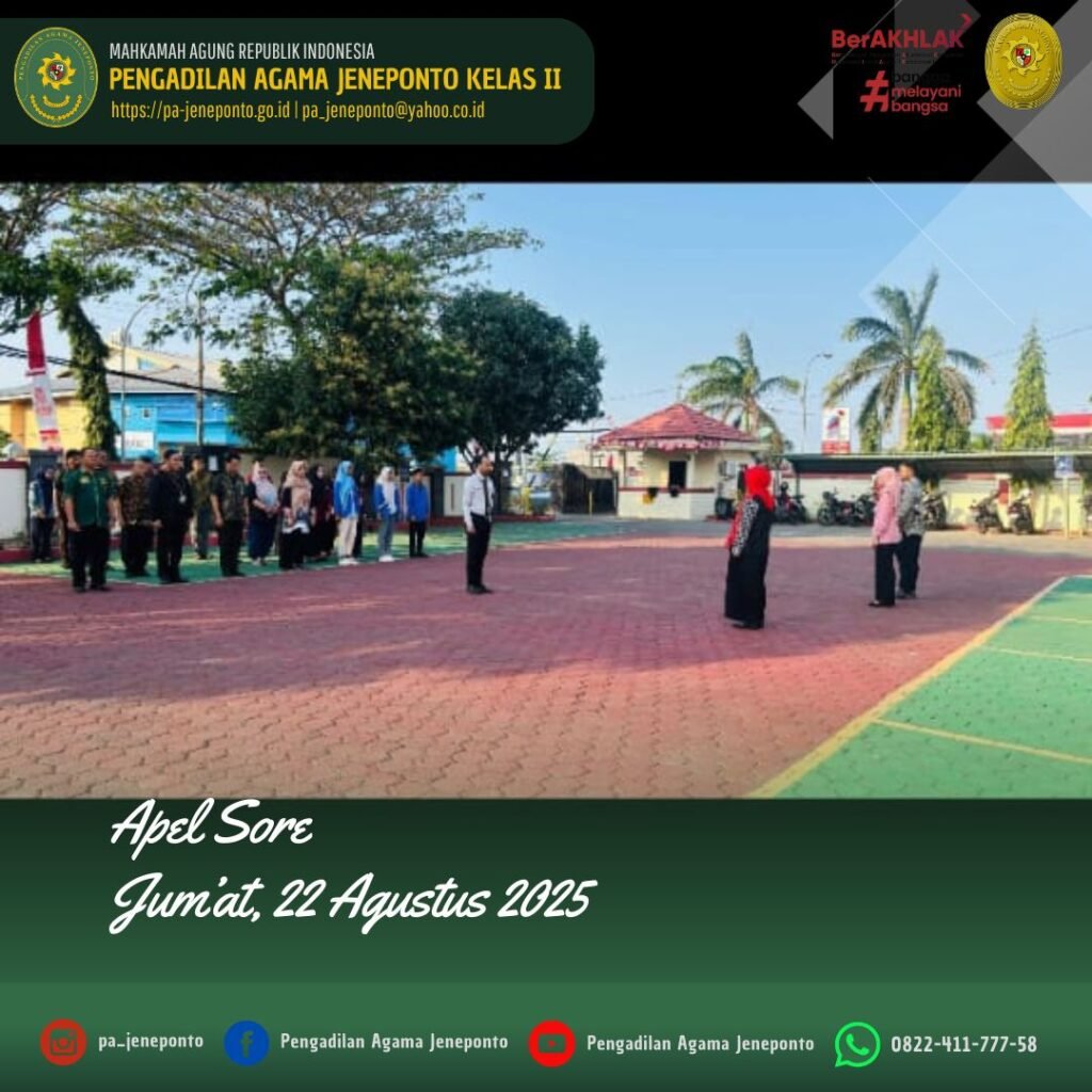 Apel Pulang hari Jum’at Sore, dilaksanakan di Halaman Kantor Pengadilan Agama Jeneponto, yang bertindak sebagai pembina Apel, Ruhana Faried, S.H.I.,M.H.I., Wakil Ketua Pengadilan Agama Jeneponto, serta Pemimpin Apel Muh. Ikhwan Triantoro, S.T., Peserta Apel sore Hakim, Panitera, Sekretaris, seluruh Pejabat Struktural dan Fungsional serta PPNPN, dan CPNS Pengadilan Agama Jeneponto, beserta mahasiswa PPL dan siswa PKL, dalam kesempatan tersebut Beliau menyampaikan beberapa hal.