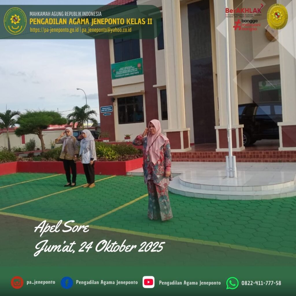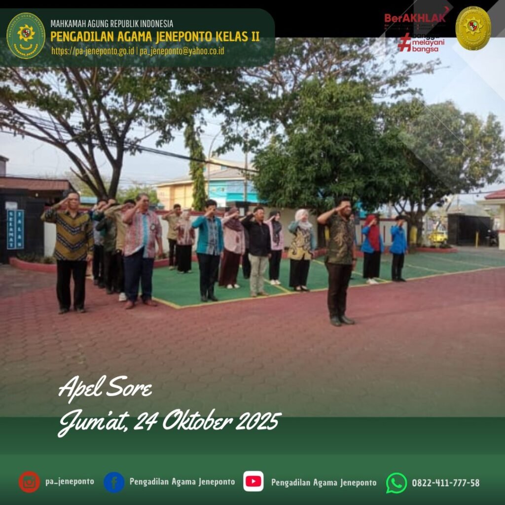Apel Pulang hari Jum’at Sore, dilaksanakan di Halaman Kantor Pengadilan Agama Jeneponto, yang bertindak sebagai pembina Apel, Ruhana Faried, S.H.I.,M.H.I., Wakil Ketua Pengadilan Agama Jeneponto, serta Pemimpin Apel Muh. Fahrul Rozy, Peserta Apel sore Ketua, Hakim, Panitera, Sekretaris, seluruh Pejabat Struktural dan Fungsional serta PPPK, dan CPNS Pengadilan Agama Jeneponto serta siswa PKL, dalam kesempatan tersebut Beliau menyampaikan selamat berakhir pekan dan berkumpul bersama keluarga.