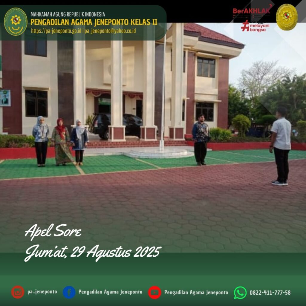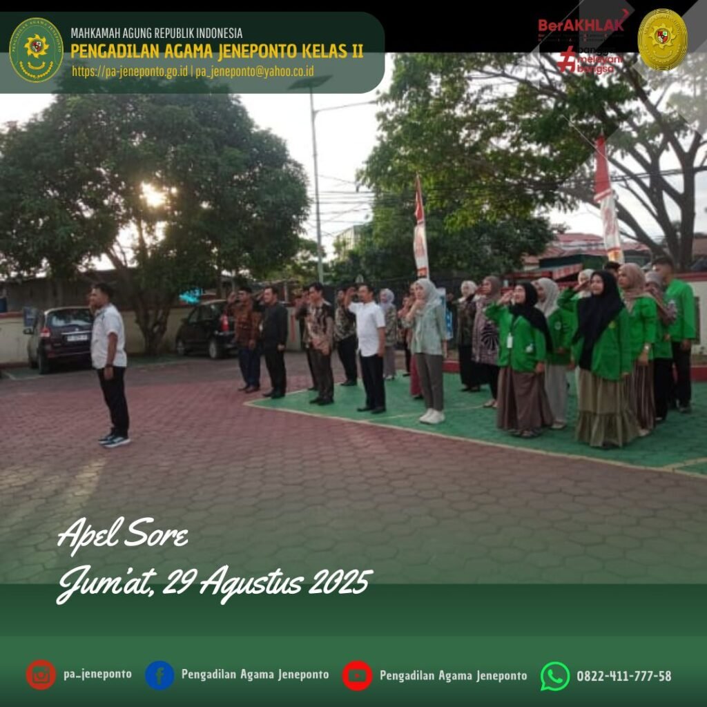 Apel Pulang hari Jum’at sore, dilaksanakan di Halaman Kantor Pengadilan Agama Jeneponto, yang bertindak sebagai pembina Apel, Muhammad Arif, S.H., Hakim Pengadilan Agama Jeneponto, serta Pemimpin Apel Muh. Fahrul Rozy, Peserta Apel sore Ketua, Wakil Ketua, Hakim, Panitera, seluruh Pejabat Struktural dan Fungsional serta PPNPN, dan CPNS Pengadilan Agama Jeneponto, beserta mahasiswa(i) PPL dan siswa PKL.