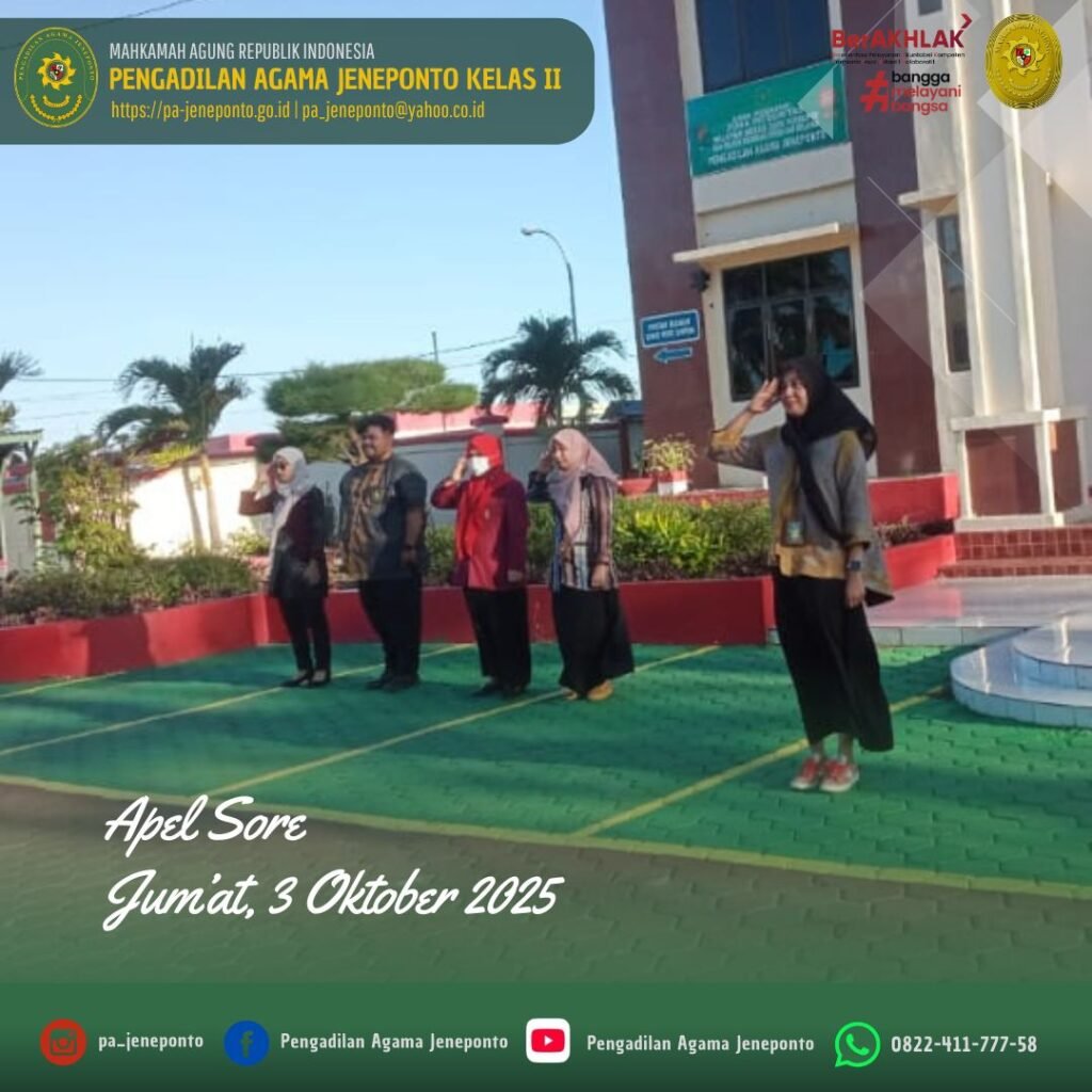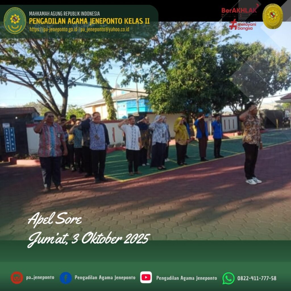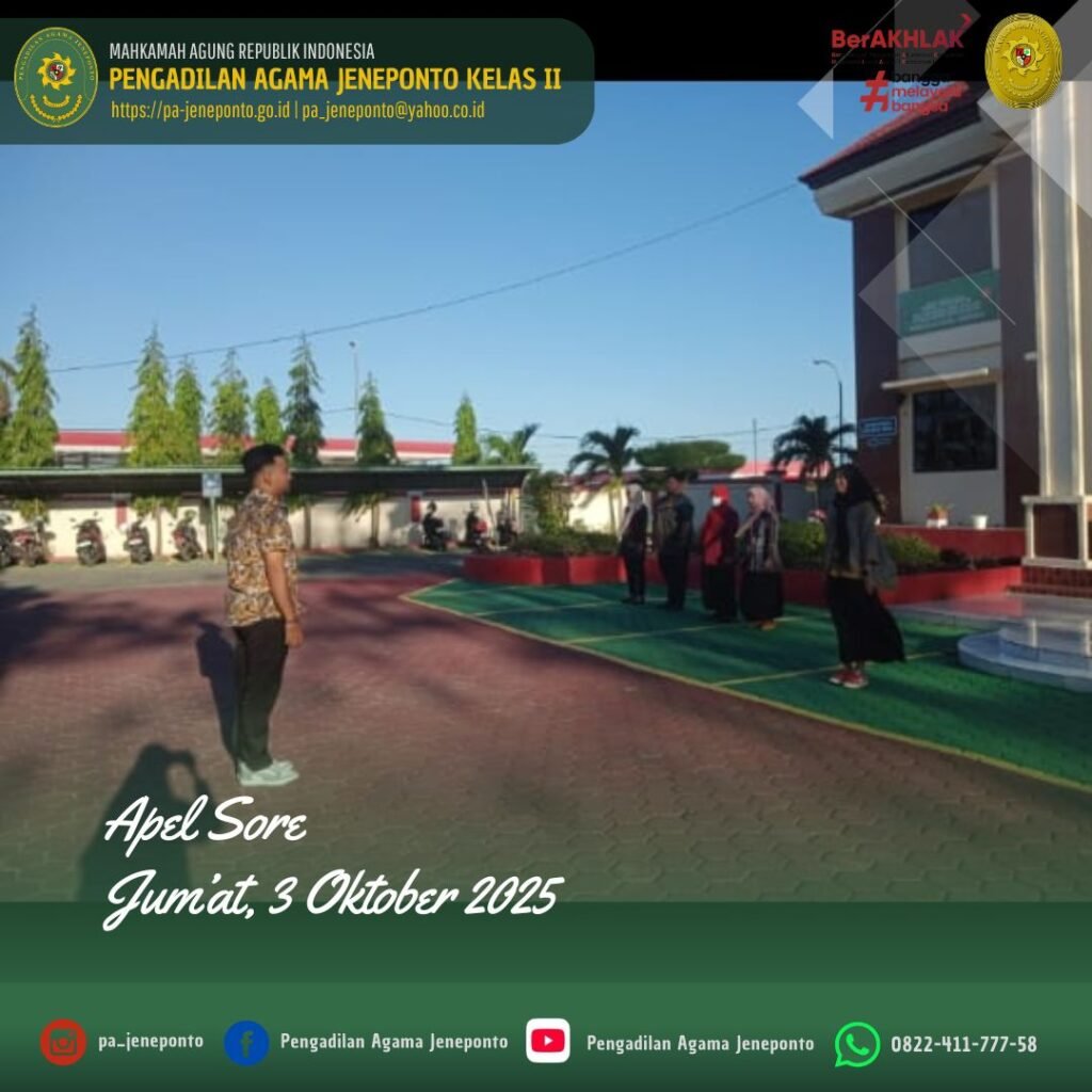 Apel Pulang hari Jum’at Sore, dilaksanakan di Halaman Kantor Pengadilan Agama Jeneponto, yang bertindak sebagai pembina Apel, Marwani R, S.H., Hakim Pengadilan Agama Jeneponto, serta Pemimpin Apel Muh. Fahrul Rozy, S.H., Peserta Apel sore Ketua, Wakil, Hakim, Sekretaris, seluruh Pejabat Struktural dan Fungsional serta PPPK, dan CPNS Pengadilan Agama Jeneponto, beserta siswa PKL, dalam kesempatan tersebut Beliau menyampaikan selamat berakhir pekan dan berkumpul bersama keluarga.