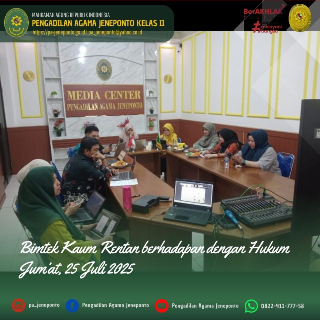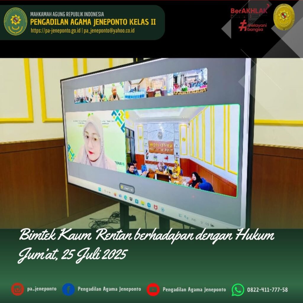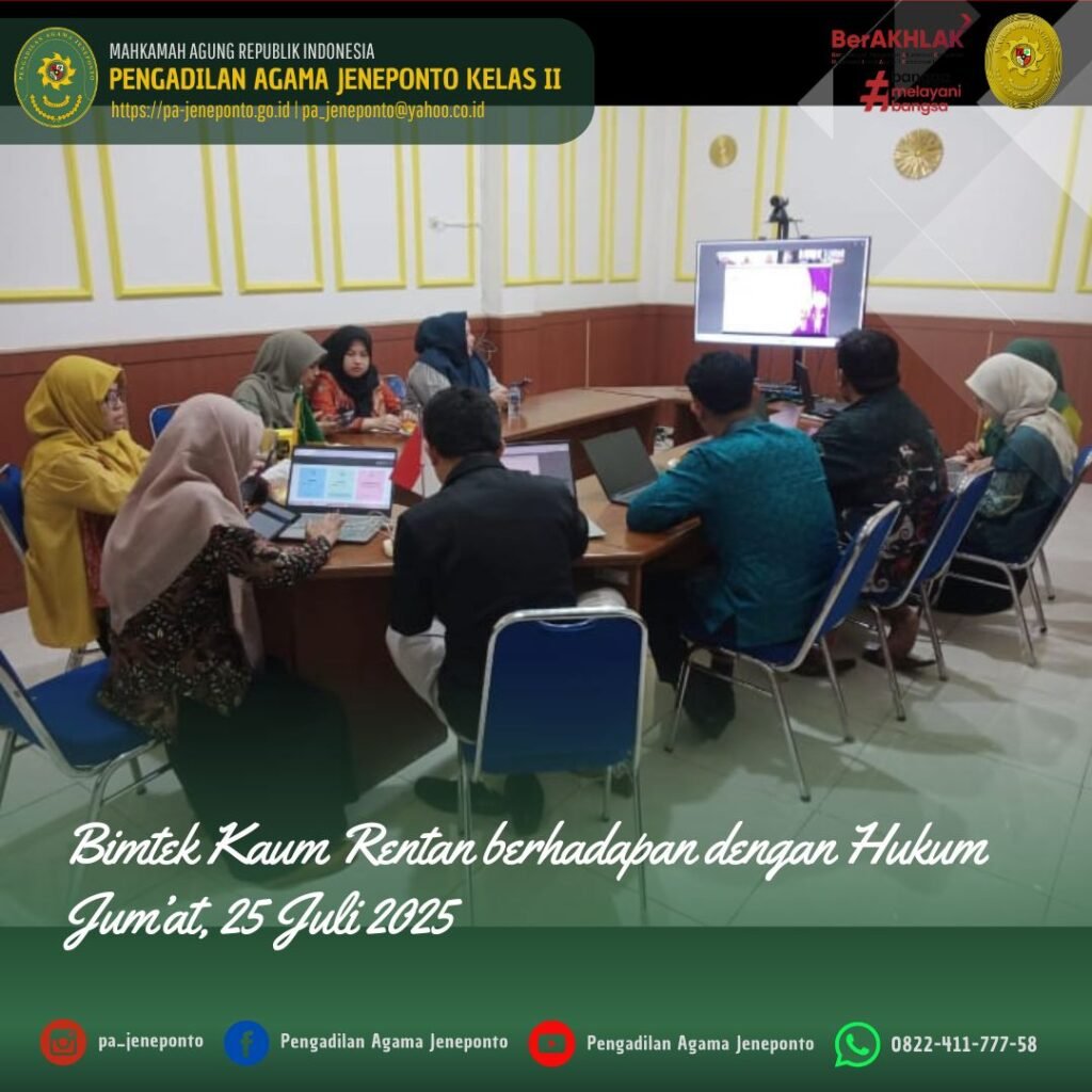 Jum’at pagi pukul 08.00 s.d. selesai, bertempat di Ruang Aula / Sidang Utama Pengadilan Agama Jeneponto, Ketua, Wakil, Hakim, Panitera, Sekretaris, Panitera Muda Hukum, Panitera Muda Gugatan, Panitera Muda Permohonan, dan Panitera Pengganti mengikuti Zoom Meeting dengan Materi “Perlindungan Hak Asasi Manusia dalam Hukum Keluarga “.