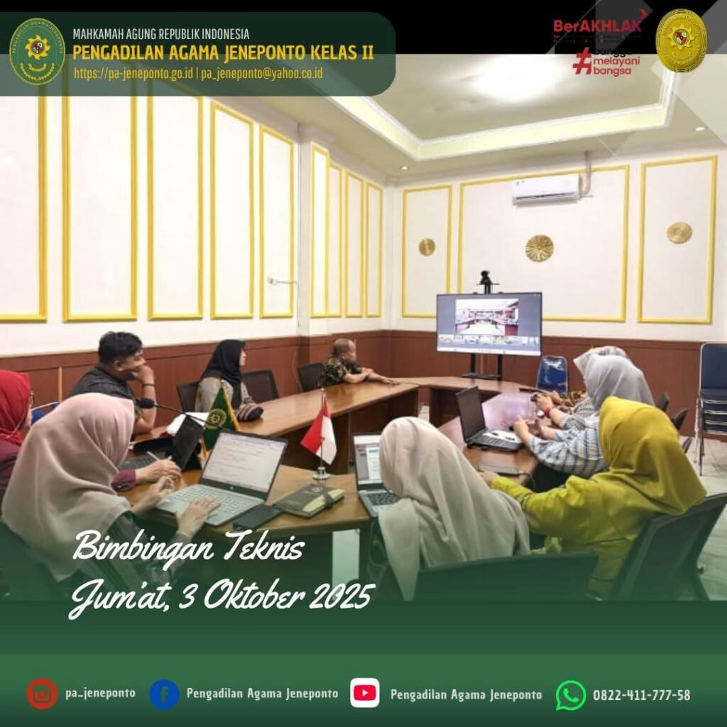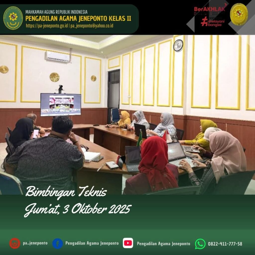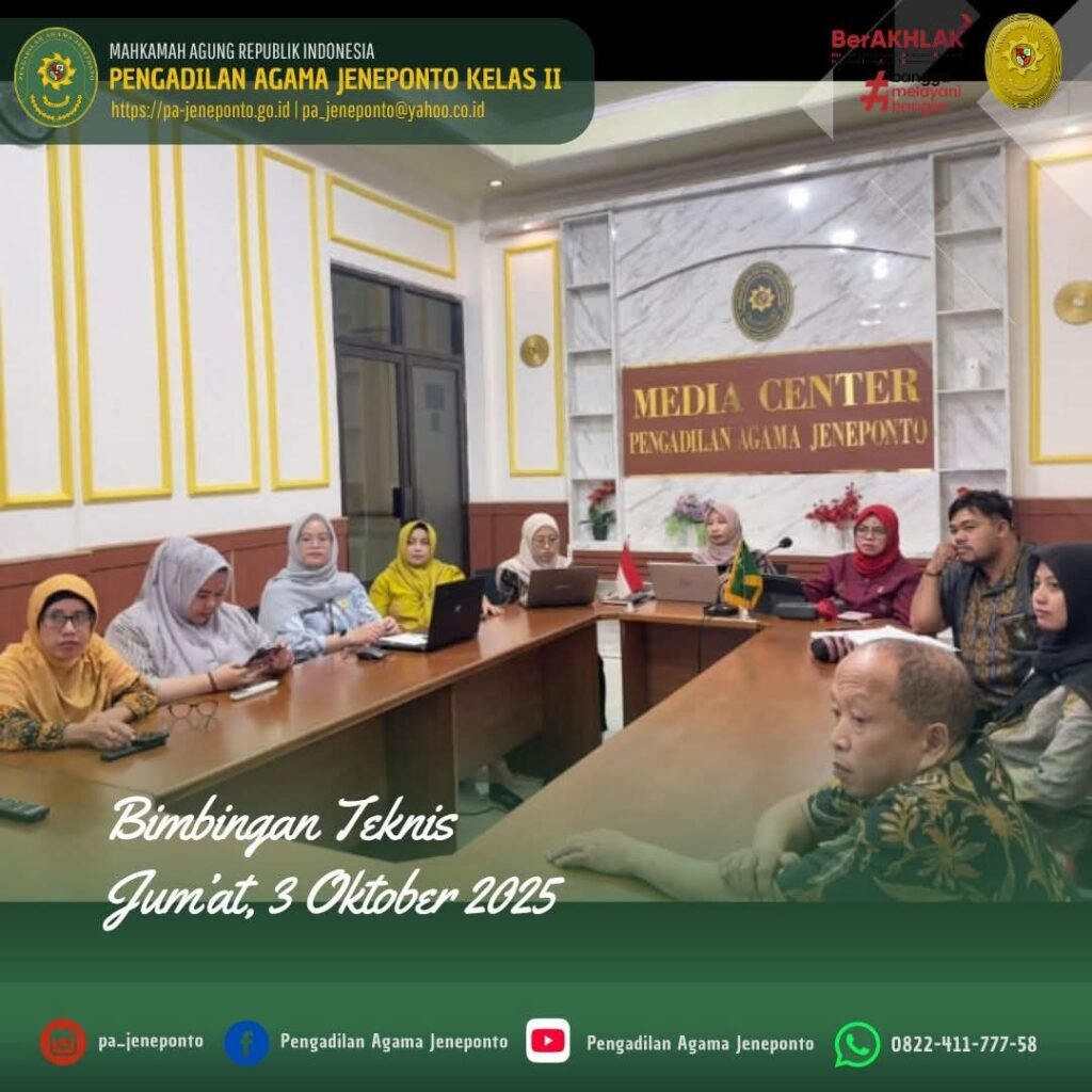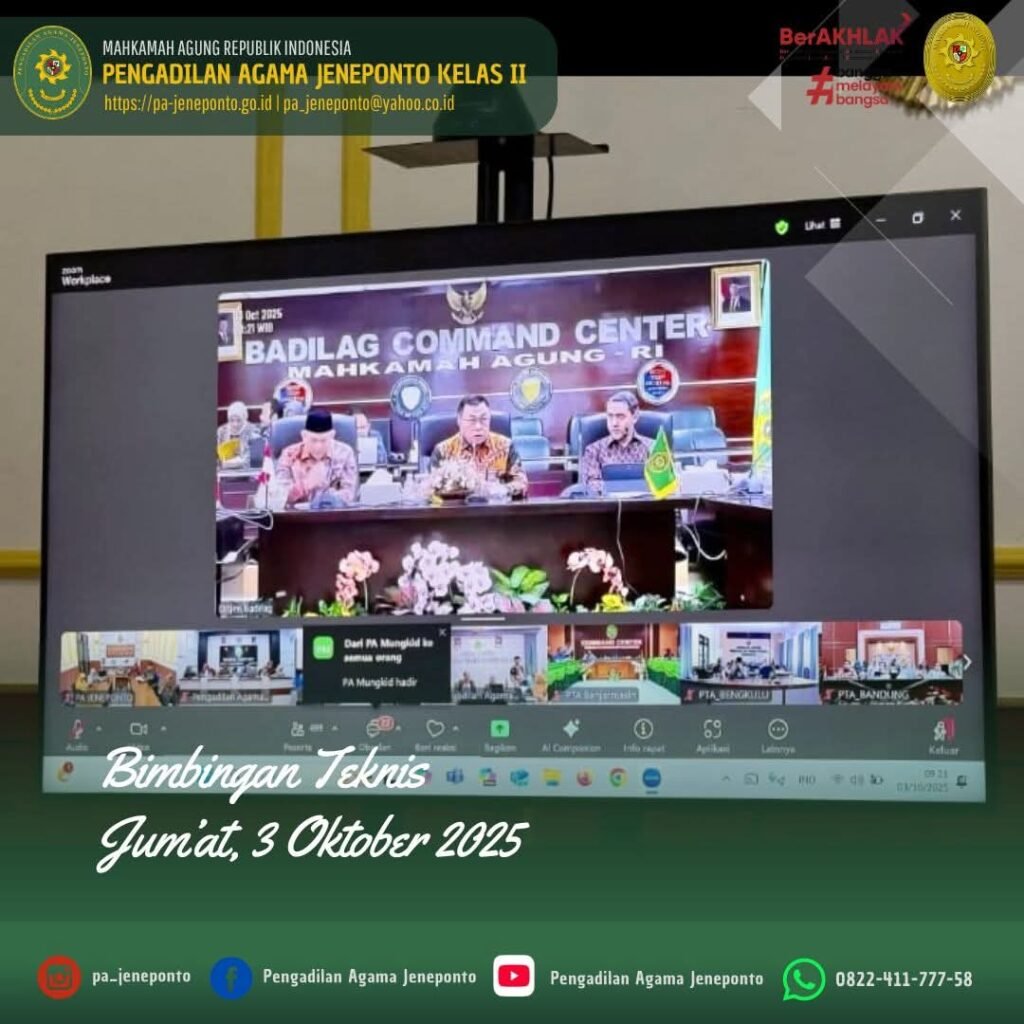 Jum’at pagi pukul 08.00 s.d. selesai, bertempat di Ruang Media Center Pengadilan Agama Jeneponto, dihadiri oleh Ketua, Wakil Ketua, Hakim, Panitera Muda Hukum, Panitera Muda Permohonan dan Pegawai PPPK mengikuti Zoom Meeting Bimbingan Teknis Peningkatan Kompetensi Mediator di Lingkungan Peradilan Agama Secara Daring.