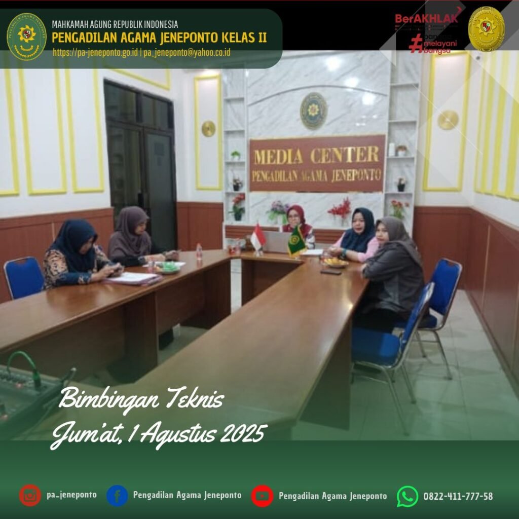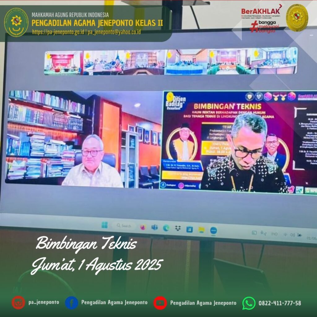 Jum’at pagi pukul 08.00 s.d. selesai, bertempat di Ruang Media Center Pengadilan Agama Jeneponto,, Wakil Ketua, Panitera Muda Hukum, Panitera Muda Permohonan, dan Panitera Pengganti mengikuti Zoom Meeting dengan Materi “Problematika Kaum Rentan Berhadapan dengan Hukum di Lingkungan Peradilan Agama”.
