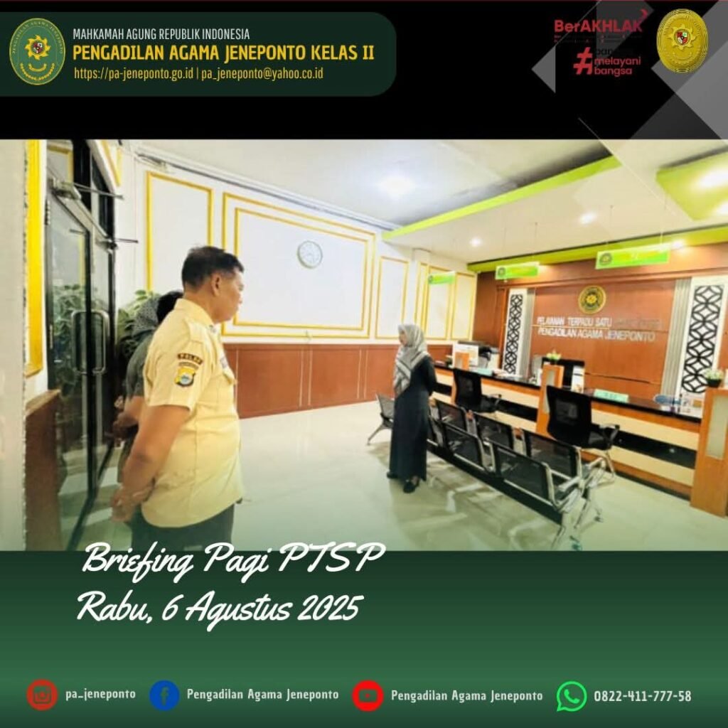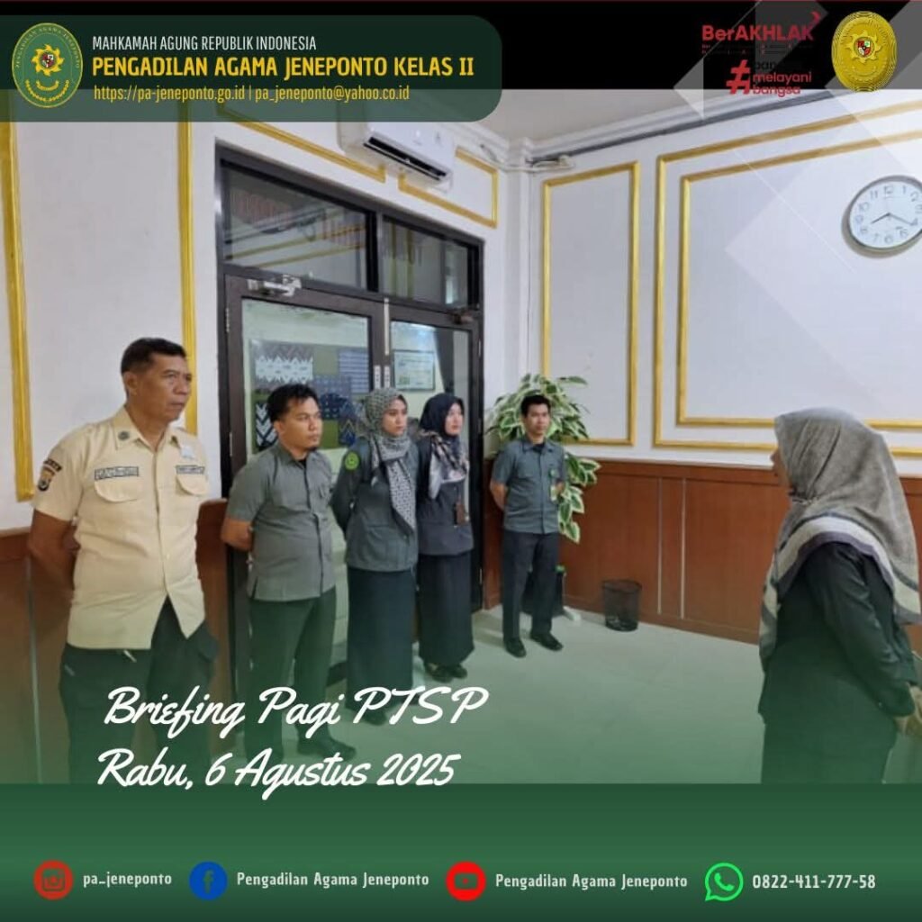 Rabu pagi awali Briefing, bertempat di Ruang PTSP Pengadilan Agama Jeneponto, dipimpin oleh Fadilah, S.Ag.,M.H., Ketua Pengadilan Agama Jeneponto Beliau menyampaikan beberapa hal.