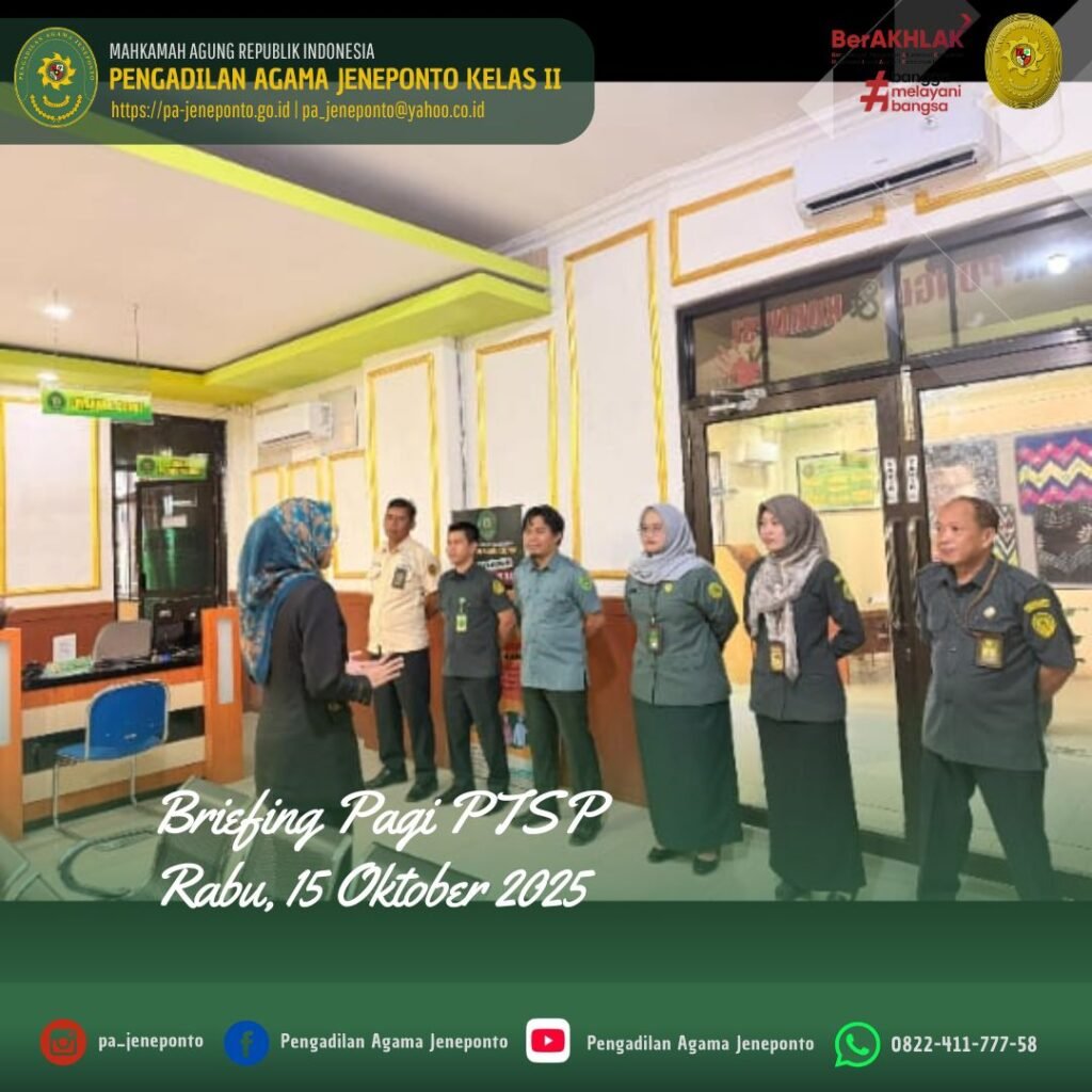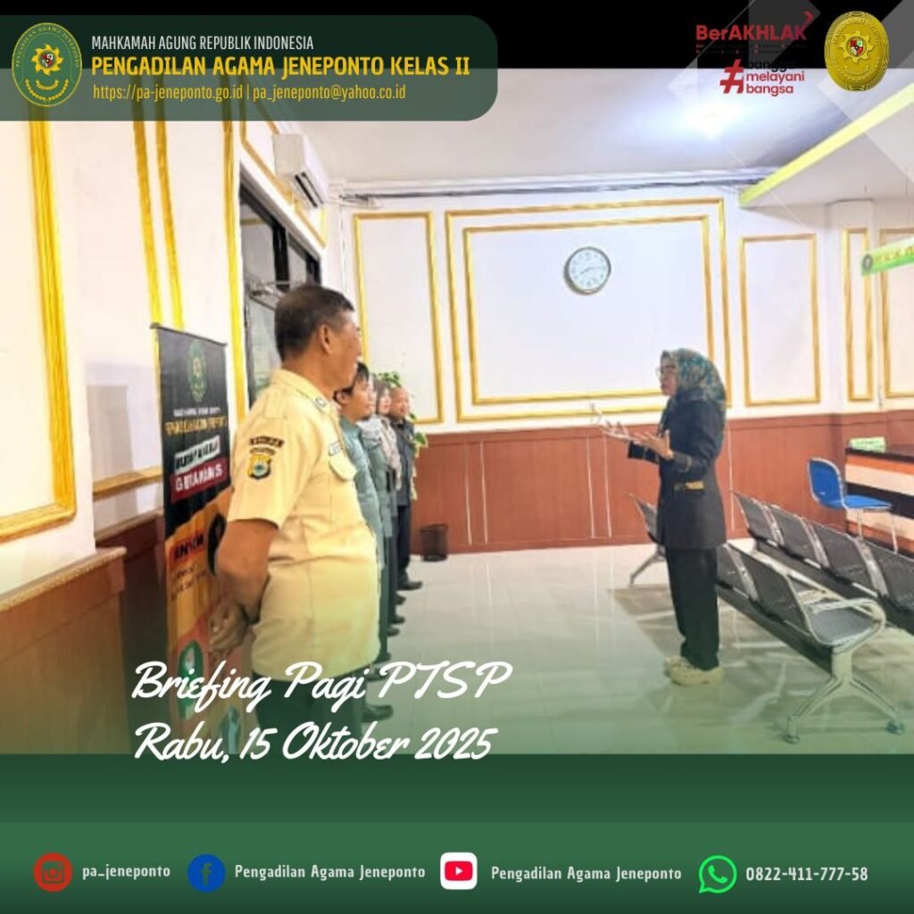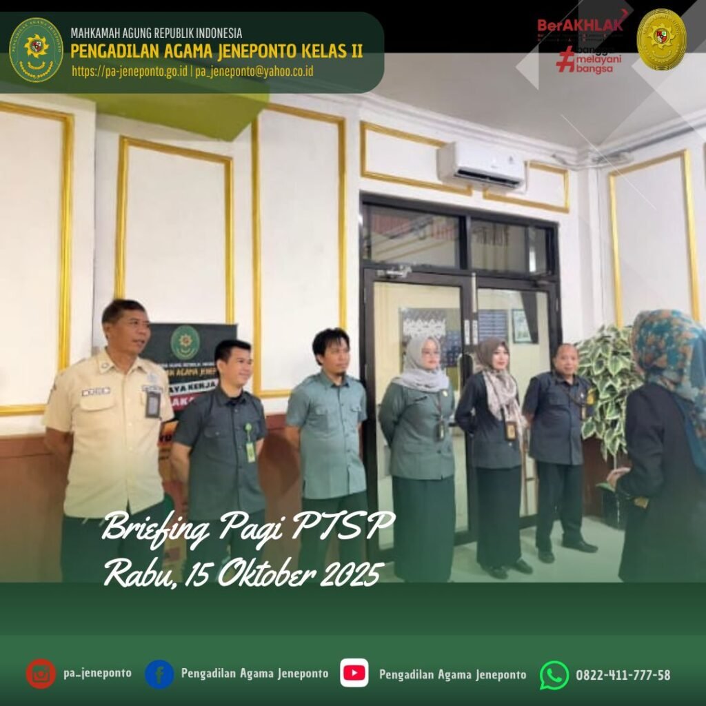 Rabu pagi awali Briefing, bertempat di Ruang PTSP Pengadilan Agama Jeneponto, dipimpin oleh Ibu Suryani, S.E., S.H., Kasubbag. Umum dan Keuangan Pengadilan Agama Jeneponto, Beliau menyampaikan terima kasih kepada seluruh petugas PTSP yang sudah hadir tepat waktu dan siap melayani. Beliau mengingatkan kembali bahwa PTSP adalah wajah dari Pengadilan Agama, maka dari itu, sikap ramah, sigap, dan profesional harus selalu kita jaga, tetap semangat dalam melayani masyarakat dan laksanakan tugas dengan penuh keikhlasan, menjaga integritas, dan disiplin.