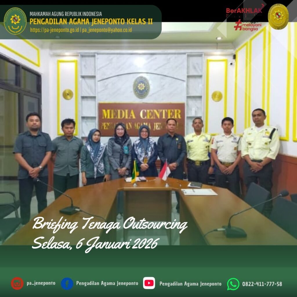 Kami berharap seluruh tenaga outsourcing dapat meningkatkan kinerja, disiplin, dan profesionalisme demi mendukung pelayanan prima kepada masyarakat. Keberadaan seluruh tenaga outsourcing sangat penting dalam mendukung kelancaran tugas dan citra Pengadilan Agama Jeneponto.