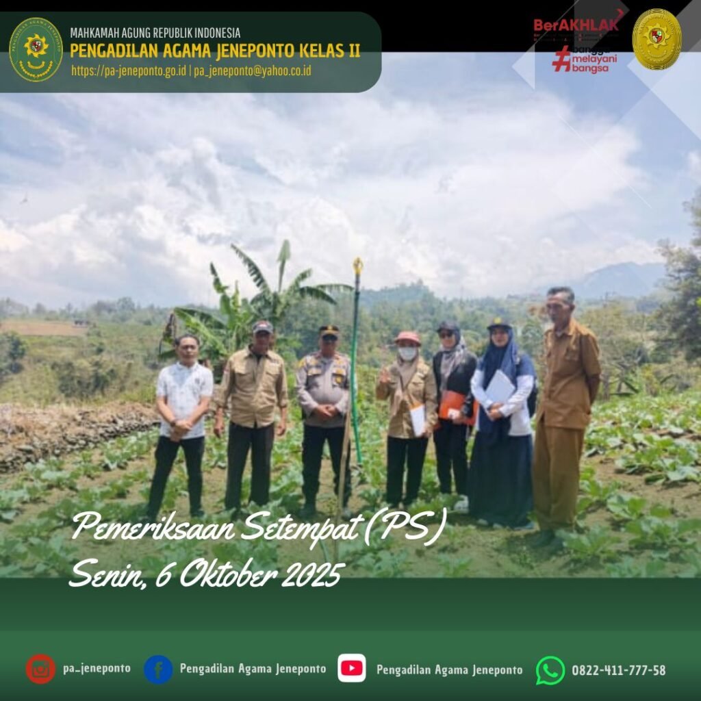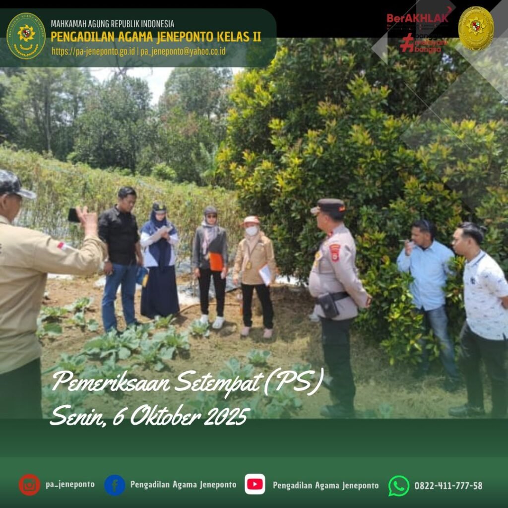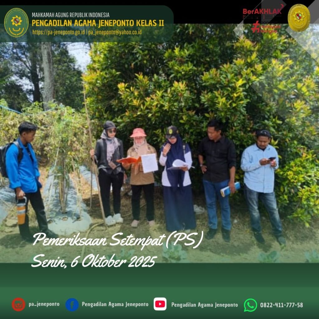 Pengadilan Agama Jeneponto melaksanakan kegiatan Pemeriksaan Setempat pada hari Senin, 6 Oktober 2025. Kegiatan Pemeriksaan Setempat tersebut dilakukan untuk Buka Sidang Destence (Pemeriksaan Setempat) di Dusun Balla Soba, Desa Loka, Kecamatan Rumbia, Kabupaten Jeneponto, dari perkara Cerai Talak Nomor 280/Pdt.G/2025/PA.Jnp, yang diajukan di Pengadilan Agama Jeneponto. Selain untuk Buka Sidang, dilakukan juga pengecekan objek Rekonvensi mahar terhutang yg terletak di Dusun Balla Soba, Desa Loka, Kecamatan Rumbia, Kabupaten Jeneponto.