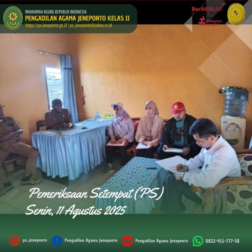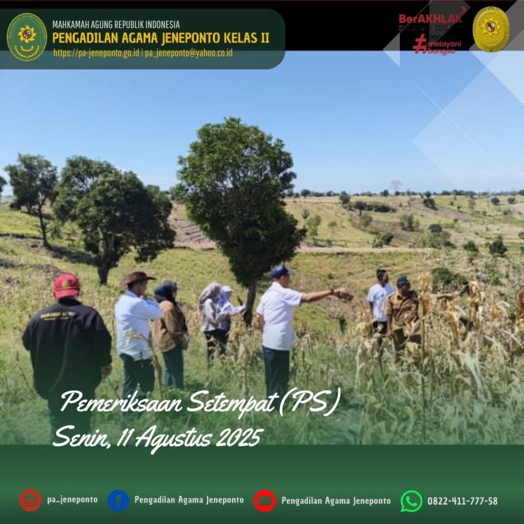 Pengadilan Agama Jeneponto melaksanakan kegiatan Pemeriksaan Setempat pada hari Senin, 11 Agustus 2025. Kegiatan Pemeriksaan Setempat tersebut dilakukan untuk Buka Sidang Descente (Pemeriksaan Setempat) di Kantor Desa Tanammawang, Kecamatan Bontoramba, Kabupaten Jeneponto, dari perkara Cerai Gugat Nomor 220/Pdt.G/2025/PA.Jnp, yang diajukan di Pengadilan Agama Jeneponto. Sidang dibuka di Desa Tanammawang, Kecamatan Bontoramba, Kabupaten Jeneponto sekitar pukul 10.00 WITA lebih selanjutnya ke lokasi objek tanah kebun mahar utk diadakan pengukuran setelah diadakan pengukuran sidang ditutup oleh ketua Majelis sekitar pukul 11.00 WITA lebih di tempat objek tanah kebun yang telah diukur, dan pengukuran dibantu oleh Patta Jalo dan Fahrul Rozy. Tim yang berangkat dari Pengadilan Agama Jeneponto terdiri dari Fadilah, S.Ag., M.H, (Ketua Majelis), didampingi Muhammad Arif, S.H., dan Ulin Nadya Rif’atur Rohmah, S.H., (Hakim Anggota), Muhyiddin, S.H.I.,M.H., (Panitera Pengganti), dihadiri pihak Penggungat dan Tergugat serta didampingi Kepala Dusun I atas nama Buhani, Pemeriksaan Setempat tersebut dilaksanakan di Desa Tanammawang, Kecamatan Bontoramba, Kabupaten Jeneponto, sebelum memeriksa lokasi objek, Tim dari Pengadilan Agama Jeneponto menemui Kepala Desa, dan jajarannya serta aparat keamanan, dan para pihak, terlebih dahulu untuk menyampaikan maksud kedatangan Tim Pengadilan Agama Jeneponto serta berbicara mengenai kondisi lapangan. Pemeriksaan setempat berlangsung dengan tertib tanpa kendala, Majelis Hakim Pengadilan Agama Jeneponto menegaskan bahwa proses hukum harus tetap dijalankan dengan transparan dan berdasarkan prinsip keadilan. Pengadilan Agama Jeneponto berharap bahwa proses ini dapat berjalan dengan lancar dan sesuai dengan ketentuan hukum yang berlaku.
