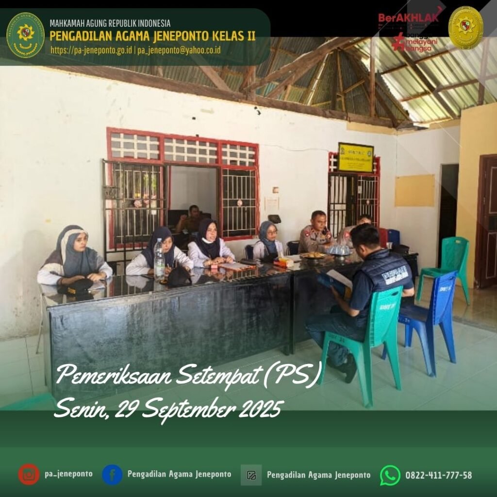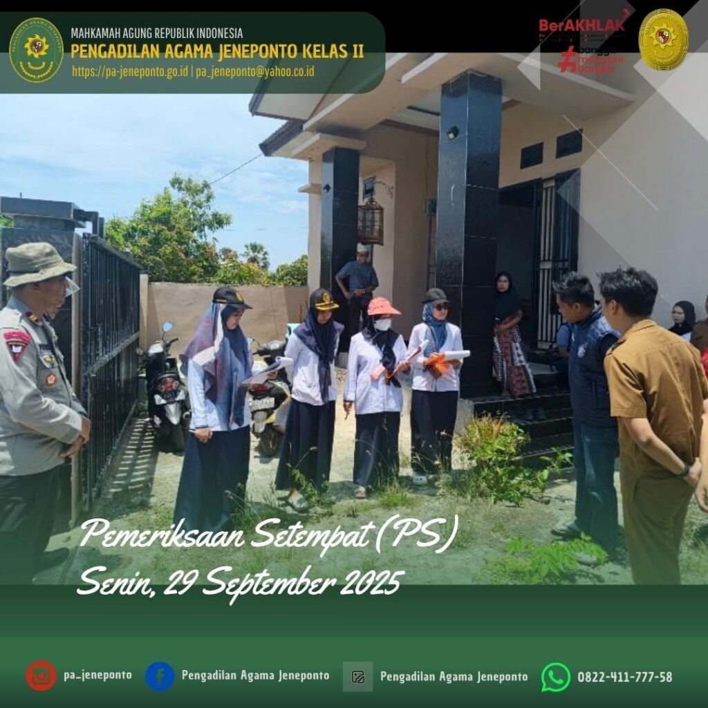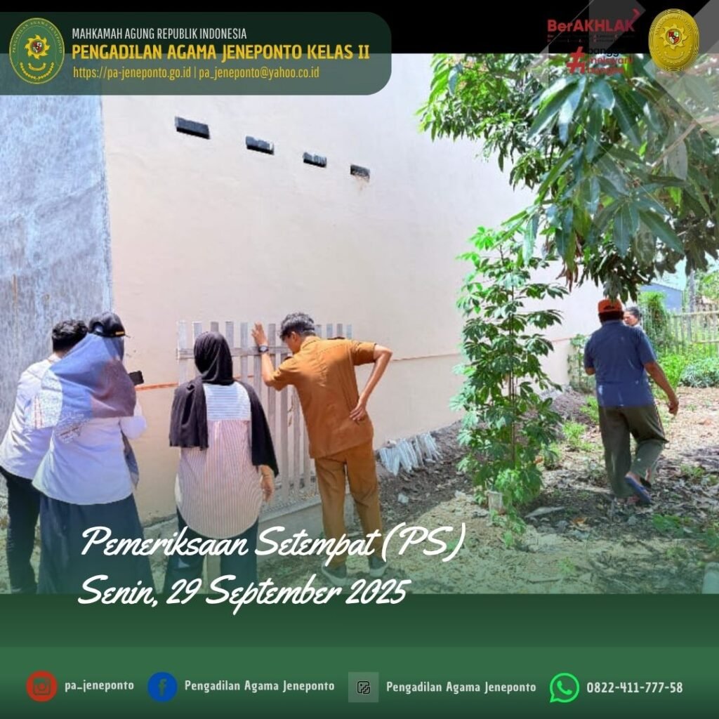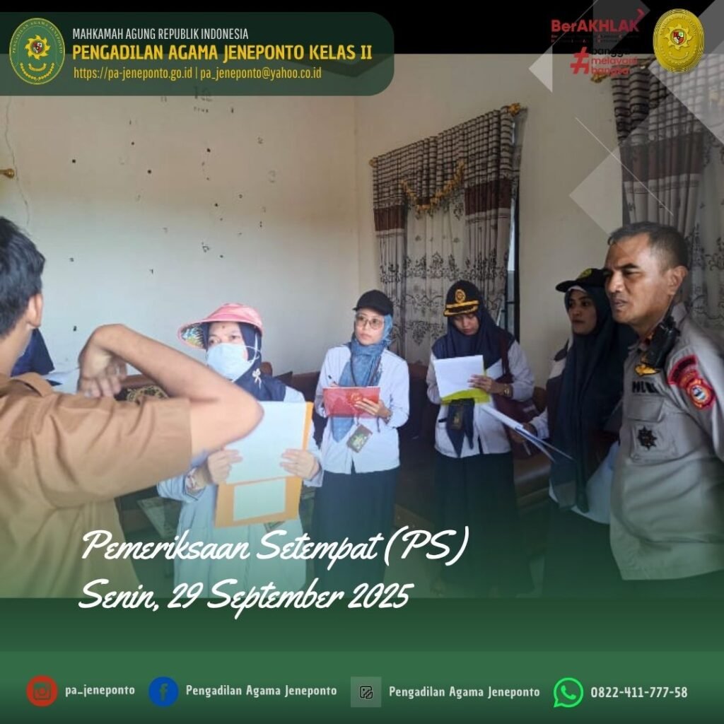 Pengadilan Agama Jeneponto melaksanakan kegiatan Pemeriksaan Setempat pada hari Senin, 29 September 2025. Kegiatan Pemeriksaan Setempat tersebut dilakukan untuk Buka Sidang Destence (Pemeriksaan Setempat) di Dusun Kampung Beru Desa Balang Loe Kecamatan Tarowang, Kabupaten Jeneponto, dari perkara Cerai Talak Nomor 280/Pdt.G/2025/PA.Jnp, yang diajukan di Pengadilan Agama Jeneponto. Selain untuk Buka Sidang, dilakukan juga pengecekan objek sengketa di Dusun Kampung Beru Desa Balang Loe Kecamatan Tarowang, Kabupaten Jeneponto. Tim yang berangkat dari Pengadilan Agama Jeneponto terdiri dari Ruhana Faried, S.H.I.,M.H.I., (Ketua Majelis), didampingi Marwani R, S.H., dan Ulin Nadya Rif’atur Rohmah, S.H., (Hakim Anggota), Andi Ilham Nur Putri, S.H., (Panitera Pengganti), Ardhayani Arja., (Jurusita Pengganti), Pemeriksaan Setempat tersebut dilaksanakan di Dusun Kampung Beru Desa Balang Loe Kecamatan Tarowang, Kabupaten Jeneponto, sebelum memeriksa lokasi objek, Tim dari Pengadilan Agama Jeneponto ke Kantor Desa menemui Arismunandar Asmar (Kepala Desa), dan jajarannya serta aparat keamanan, dan para pihak, terlebih dahulu untuk menyampaikan maksud kedatangan Tim Pengadilan Agama Jeneponto serta berbicara mengenai kondisi lapangan. Pemeriksaan setempat berlangsung dengan tertib tanpa kendala, Majelis Hakim Pengadilan Agama Jeneponto menegaskan bahwa proses hukum harus tetap dijalankan dengan transparan dan berdasarkan prinsip keadilan. Pengadilan Agama Jeneponto berharap bahwa proses ini dapat berjalan dengan lancar dan sesuai dengan ketentuan hukum yang berlaku.