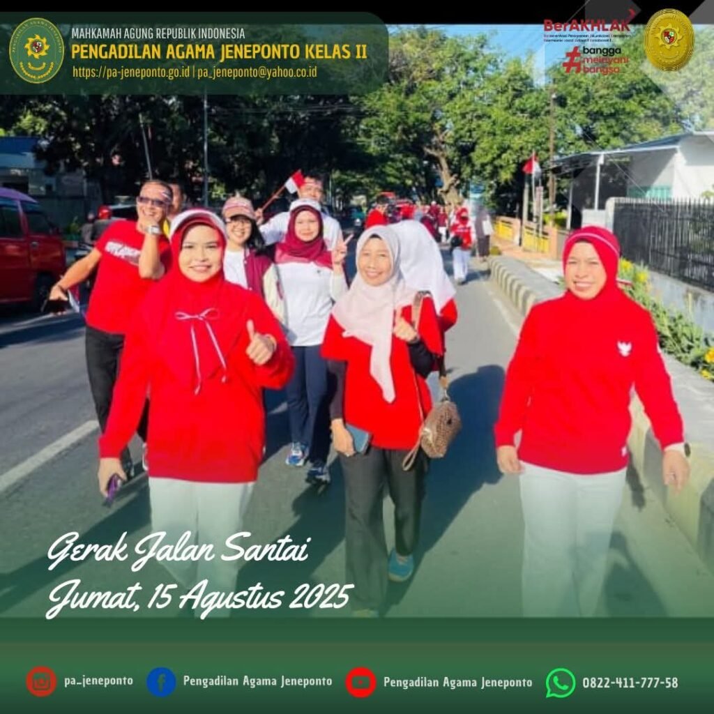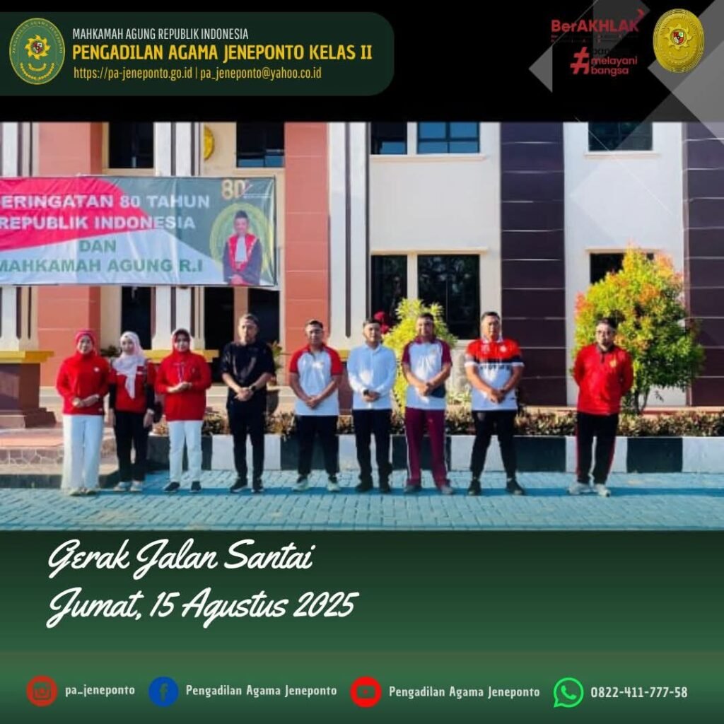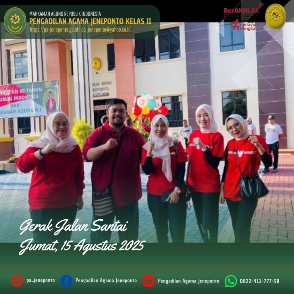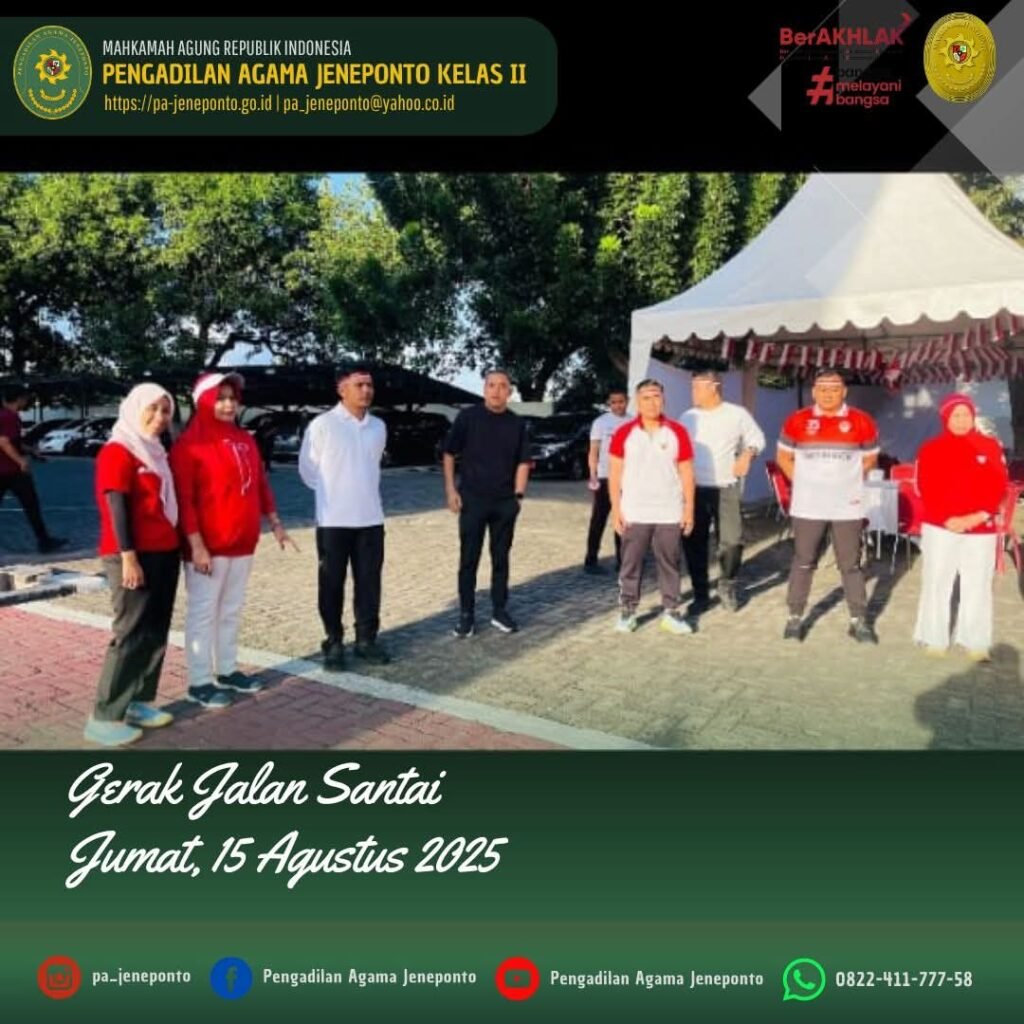 Jum’at pagi, bertempat di Pengadilan Negeri Jeneponto, Fadilah, S.Ag.,M.H., Ketua Pengadilan Agama Jeneponto memenuhi Undangan Gerak Jalan Santai, dalam rangka HUT RI & HUT Mahkamah Agung RI ke 80, dihadiri oleh Ketua Pengadilan Negeri, Bupati dan Wakil Bupati Jeneponto, Kapolres Jeneponto, Dandim Jeneponto, dan Perwakilan Kajari Jeneponto.