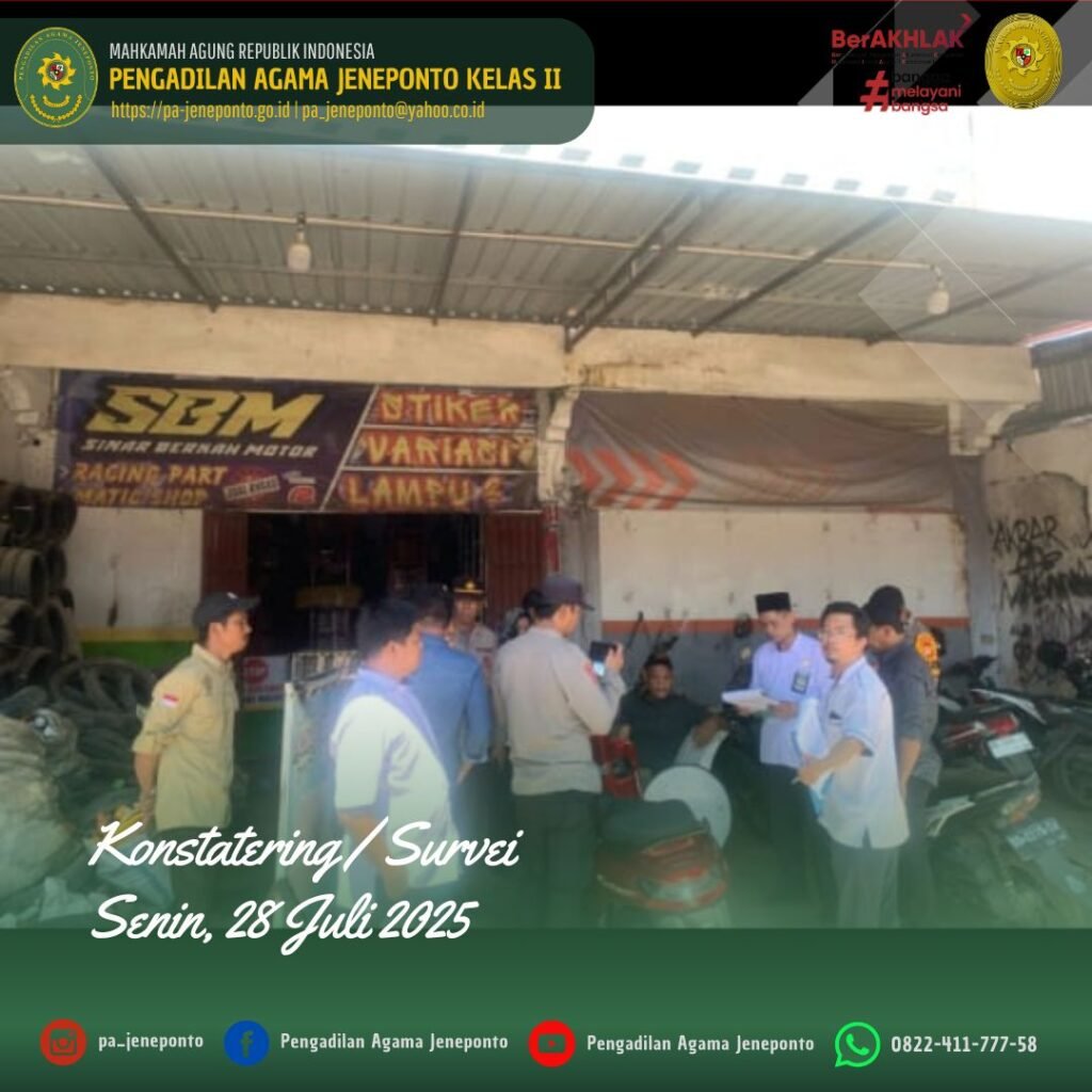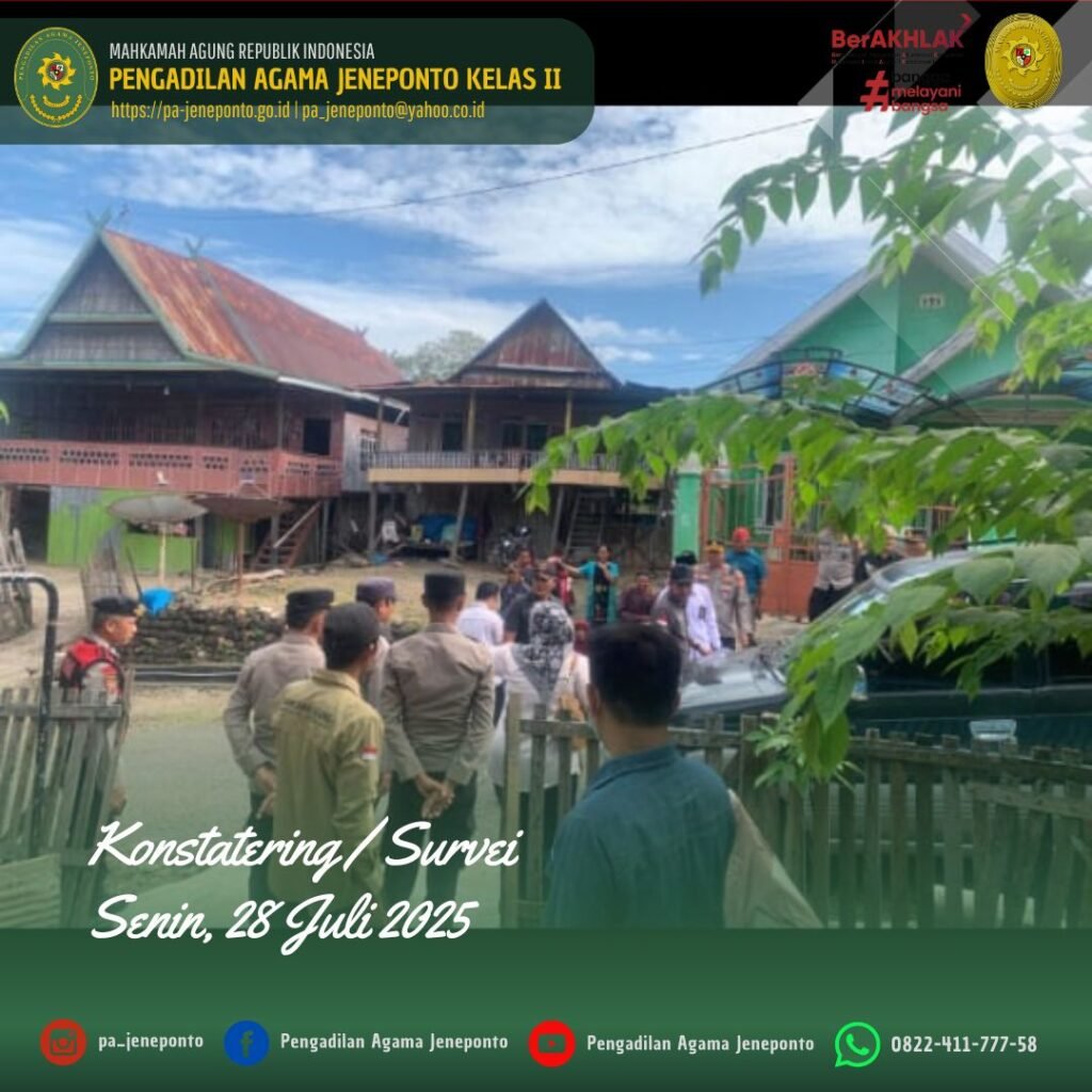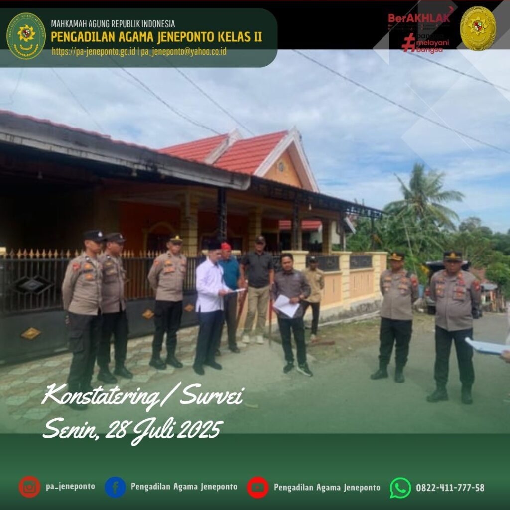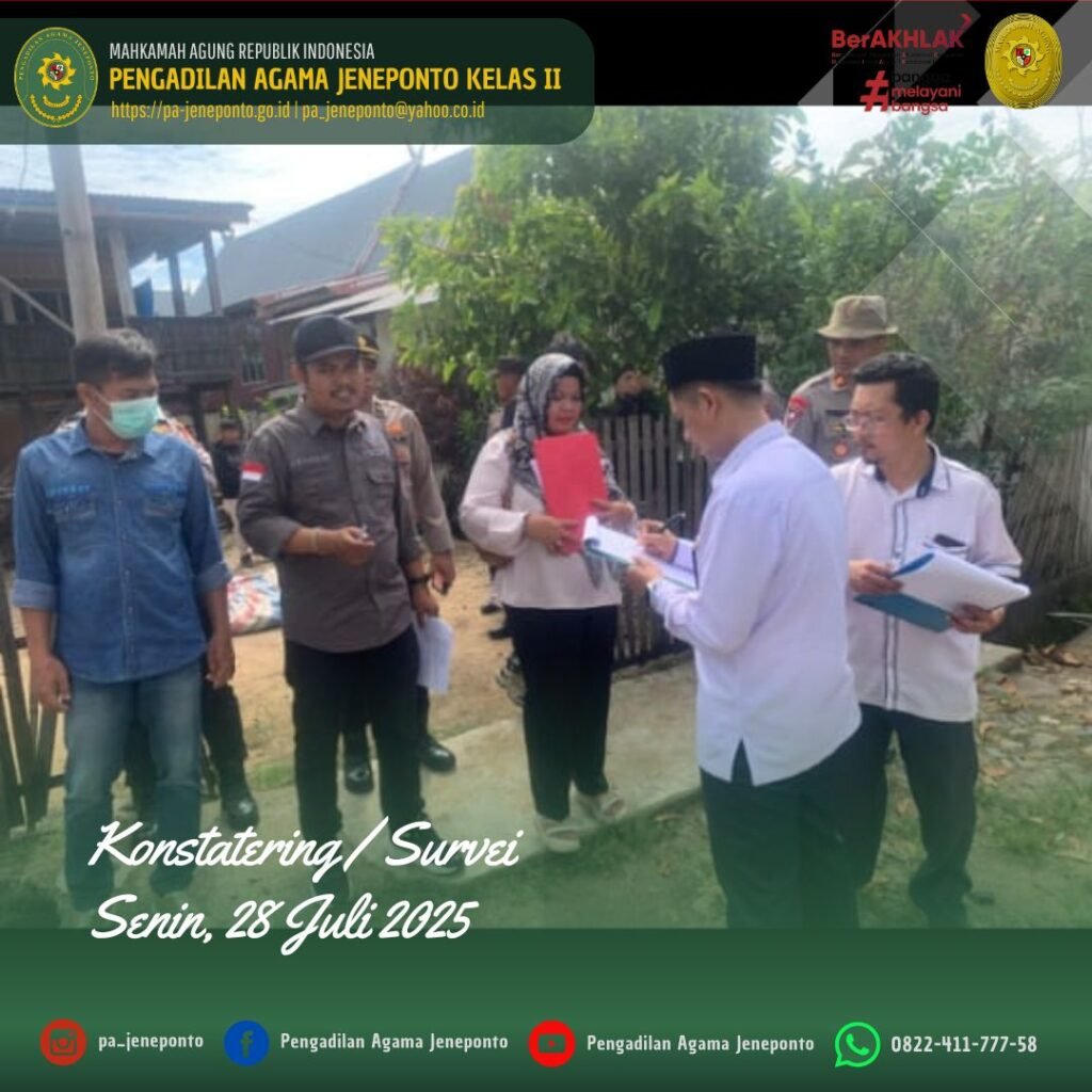 Pengadilan Agama Jeneponto melaksanakan kegiatan Konstatering pada hari Senin, 28 Juli 2025. Kegiatan Konstatering/Survei untuk Persiapan Eksekusi tersebut dilakukan di Kelurahan Empoang, Kecamatan Binamu, Kabupaten Jeneponto dan di Desa Camba-Camba, Kecamatan Batang, Kabupaten Jeneponto, dari perkara Harta Bersama Nomor 194/Pdt.G/2023/PA.Jnp tanggal 21 September 2023 jo putusan Pengadilan Tinggi Agama Makassar Nomor 143/Pdt.G/2023/ PTA.Mks tanggal 27 Desember 2023 jo putusan Mahkamah Agung RI Nomor yang telah berkekuatan hukum tetap pada tanggal 29 Agustus 2024. Tim yang berangkat dari Pengadilan Agama Jeneponto terdiri dari Muhyiddin, S.H.I., (Panitera), Muhammad Iskandar Zulkarnain, (Panitera Muda Gugatan), Muh. Nurul Ulum, S.Sy, Ahmad B, S.H, dan Fahrul Rosy, SH., didampingi pihak kepolisan Polres Jeneponto sebagai Pengamanan dan didampingi aparat Kelurahan, serta Penggugat dan Tergugat.