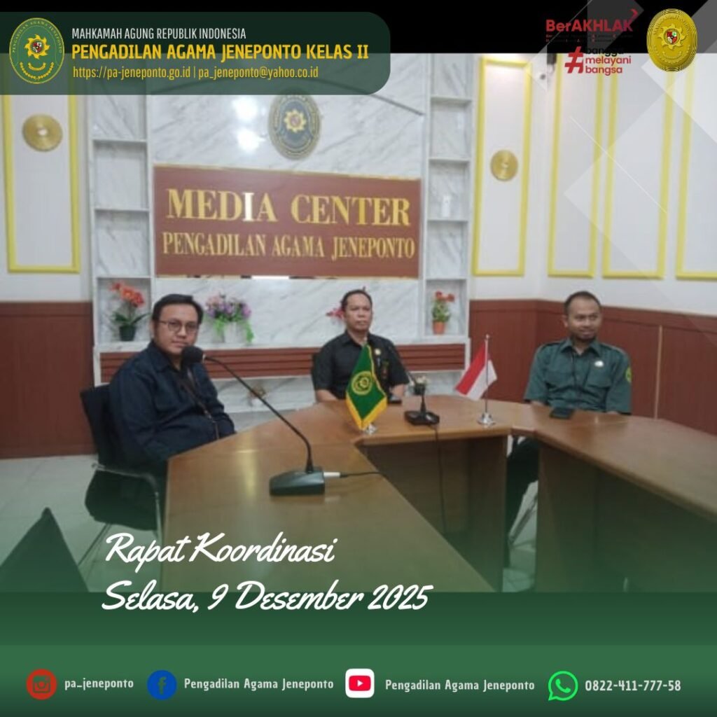 Selasa 09.00 Wita s.d. selesai, bertempat di Media Center Pengadilan Agama Jeneponto, Bapak H.Abdul Muiz, S.H.I.,M.H.I., Sekretaris Pengadilan Agama Jeneponto, Bapak Hendra Faisal Sanuddin, S.H., Kasubag. PTIP Pengadilan Agama Jeneponto, dan Bapak Ikhwan Triantoro, S.T., CPNS Teknisi Sarana dan Prasarana Pengadilan Agama Jeneponto, memenuhi Undangan Rapat Koordinasi Penyelesaian Pagu Tahun Anggaran 2025, secara daring.
