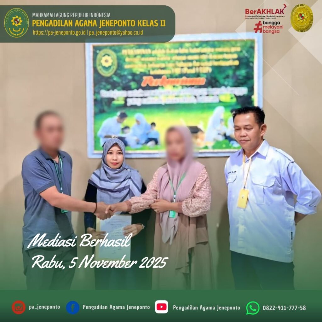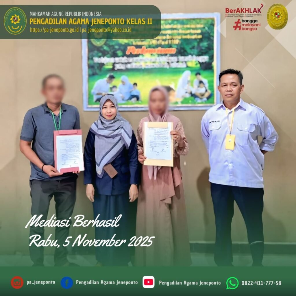 Rabu, 5 November 2025, Ketua Pengadilan Agama Jeneponto Fadilah, S.Ag., M.H., selaku mediator berhasil memediasi Penggugat dan Tergugat sehingga Penggugat dan Tergugat sepakat untuk rukun kembali dan Penggugat akan mencabut perkaranya (Cerai Gugat) Nomor 410/Pdt.G/2025/PA.Jnp.