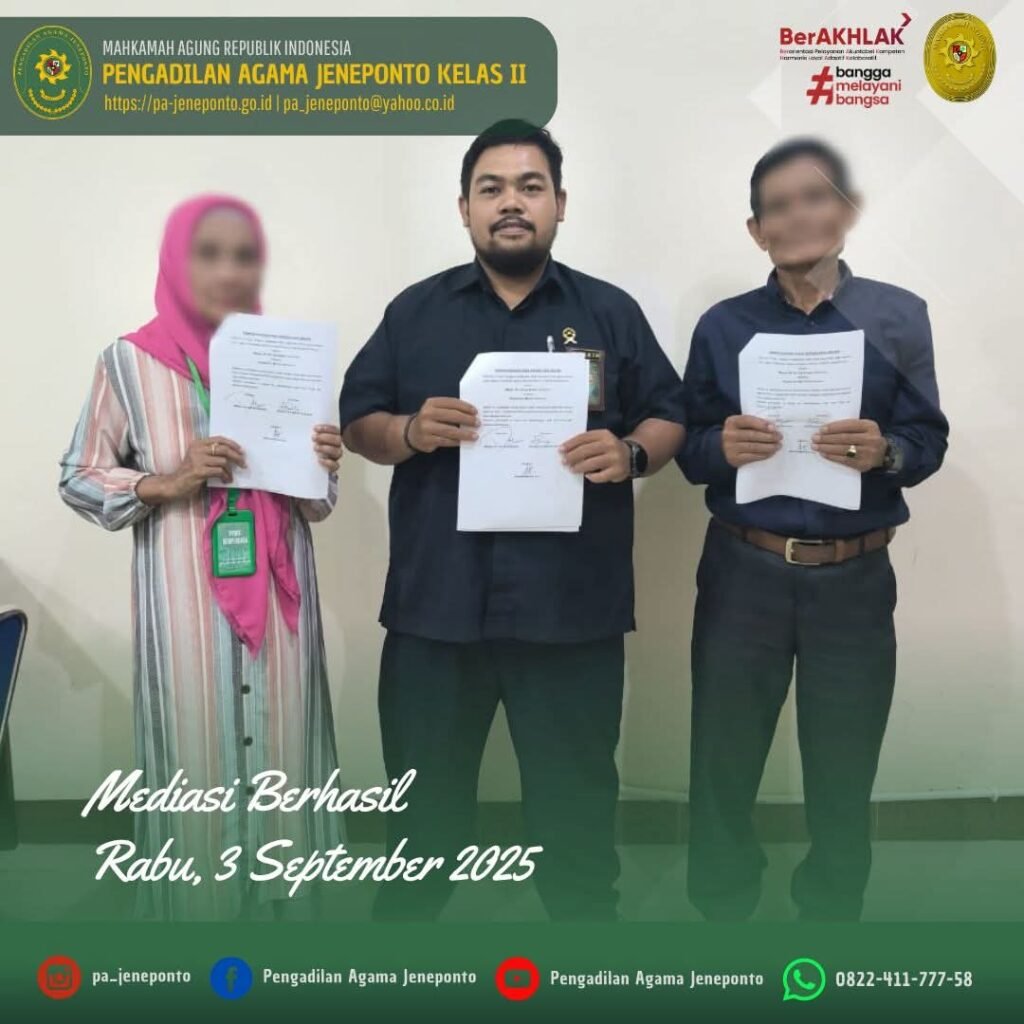 Dalam suasana penuh keikhlasan dan kesadaran, kedua belah pihak akhirnya merajut kembali ikatan rumah tangga yang sempat terurai. Muhammad Arif, S.H. selaku mediator yang ditunjuk oleh Ketua Majelis dalam perkara Cerai Talak Nomor 319/Pdt.G/2025/PA.Jnp, mereka sepakat untuk menangguhkan perceraian, memilih rujuk, serta melanjutkan biduk rumah tangga dengan tekad menjaga kasih sayang dan kedamaian. Dengan tercapainya kesepakatan luhur ini, mediasi dinyatakan berhasil dengan harapan rumah tangga mereka senantiasa diliputi mawaddah, rahmah, dan sakinah.