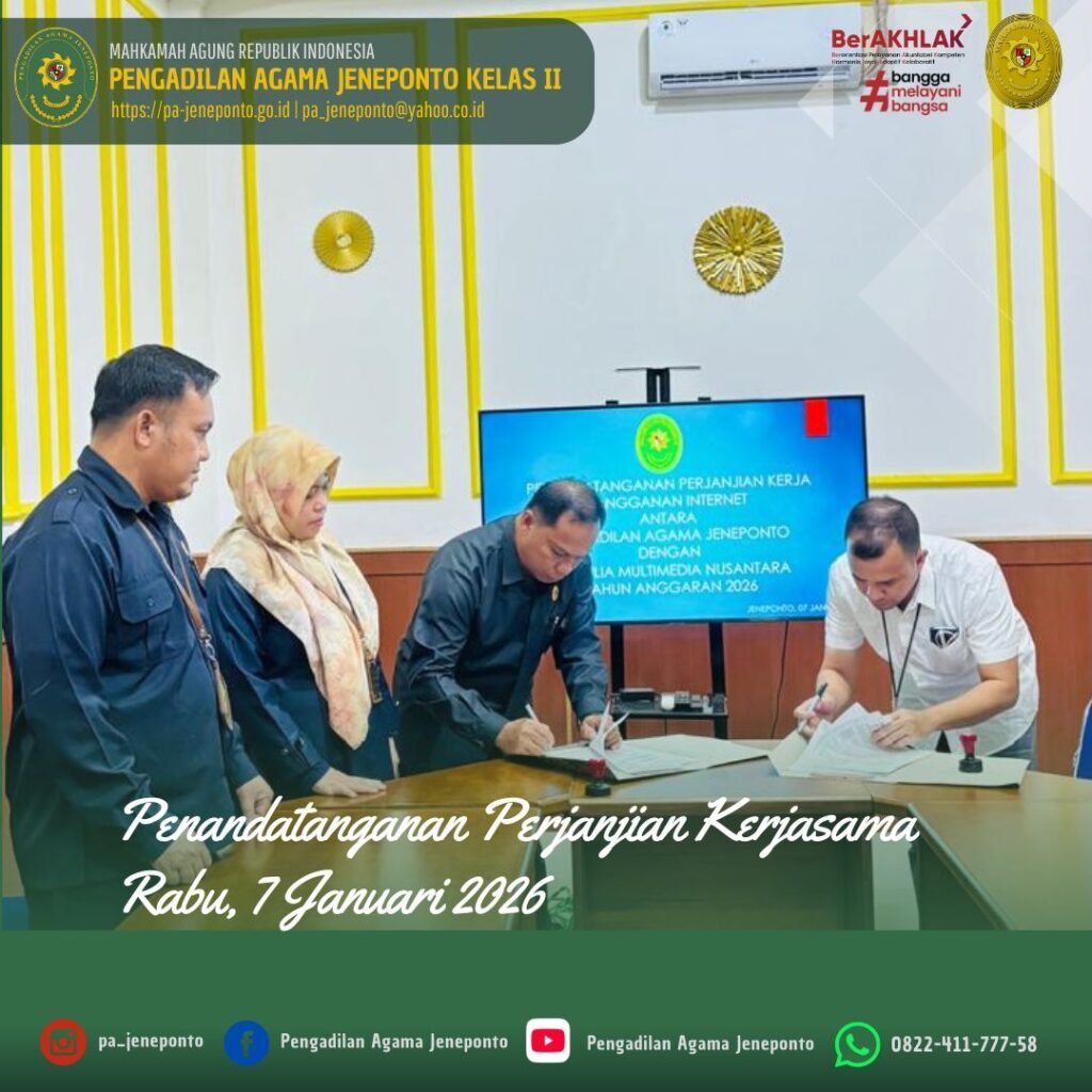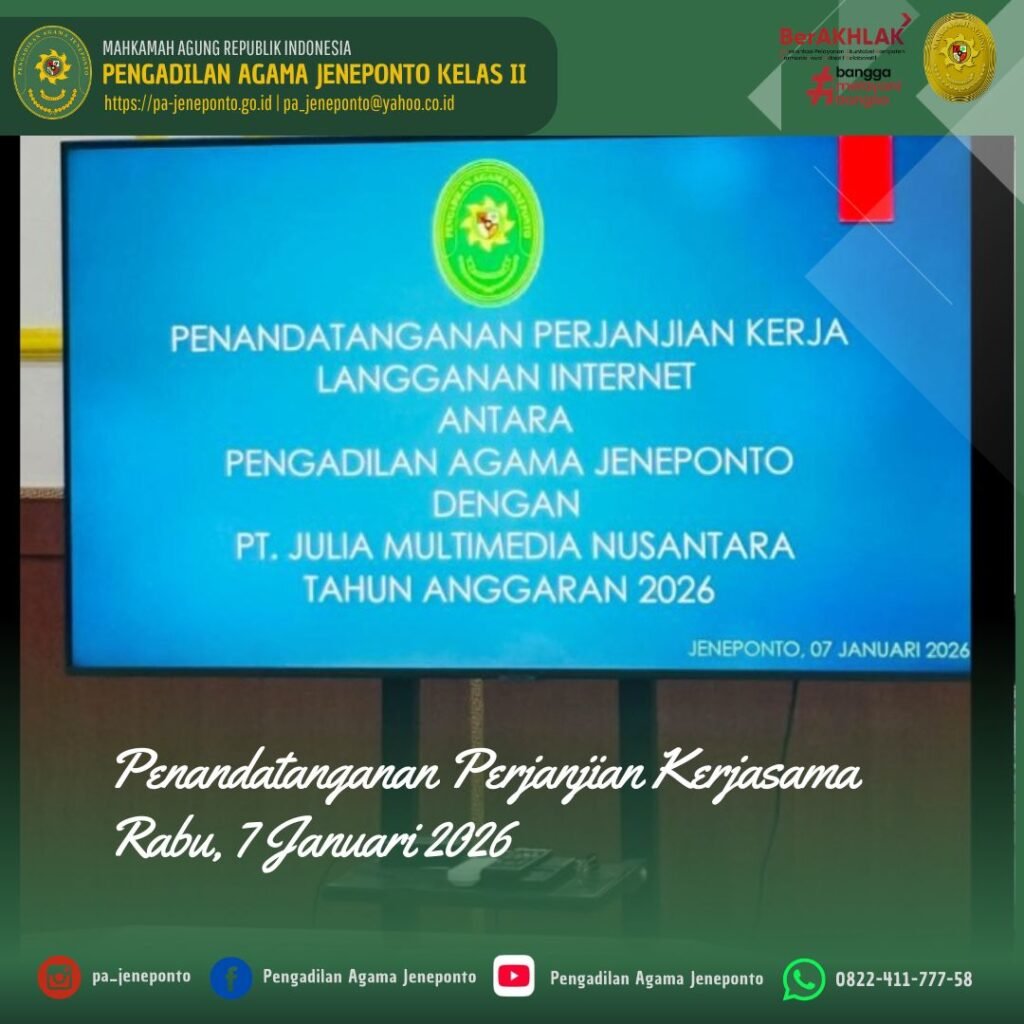Rabu pagi, 11.00 Wita s.d. selesai, bertempat di Media Center Pengadilan Agama Jeneponto, Wakil Ketua, Sekretaris dan Kasubag. PTIP Pengadilan Agama Jeneponto, melaksanakan kegiatan Penandatanganan Perjanjian Kerja Sama Langganan Internet antara Pengadilan Agama Jeneponto dengan PT. Julia Multimedia Nusantara Tahun Anggaran 2026 sebagai bentuk komitmen dalam penyediaan layanan jaringan internet yang andal dan berkesinambungan. Kegiatan ini bertujuan untuk mendukung kelancaran pelayanan administrasi dan peningkatan kualitas layanan berbasis teknologi informasi di lingkungan Pengadilan Agama Jeneponto.