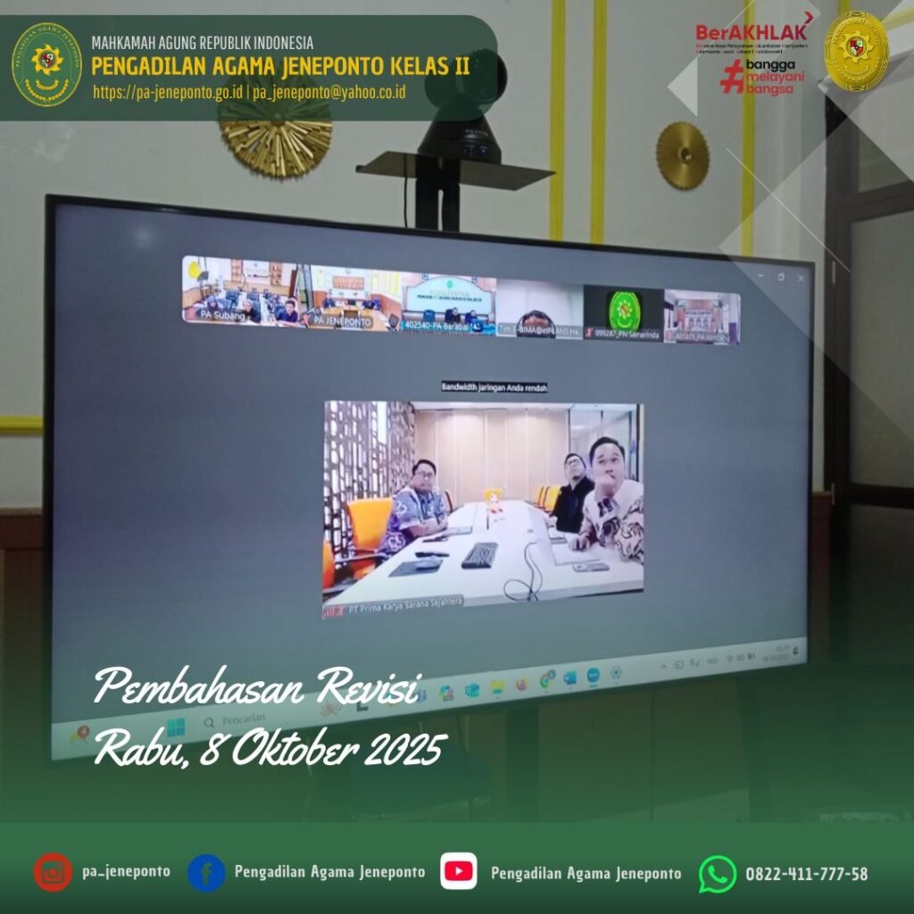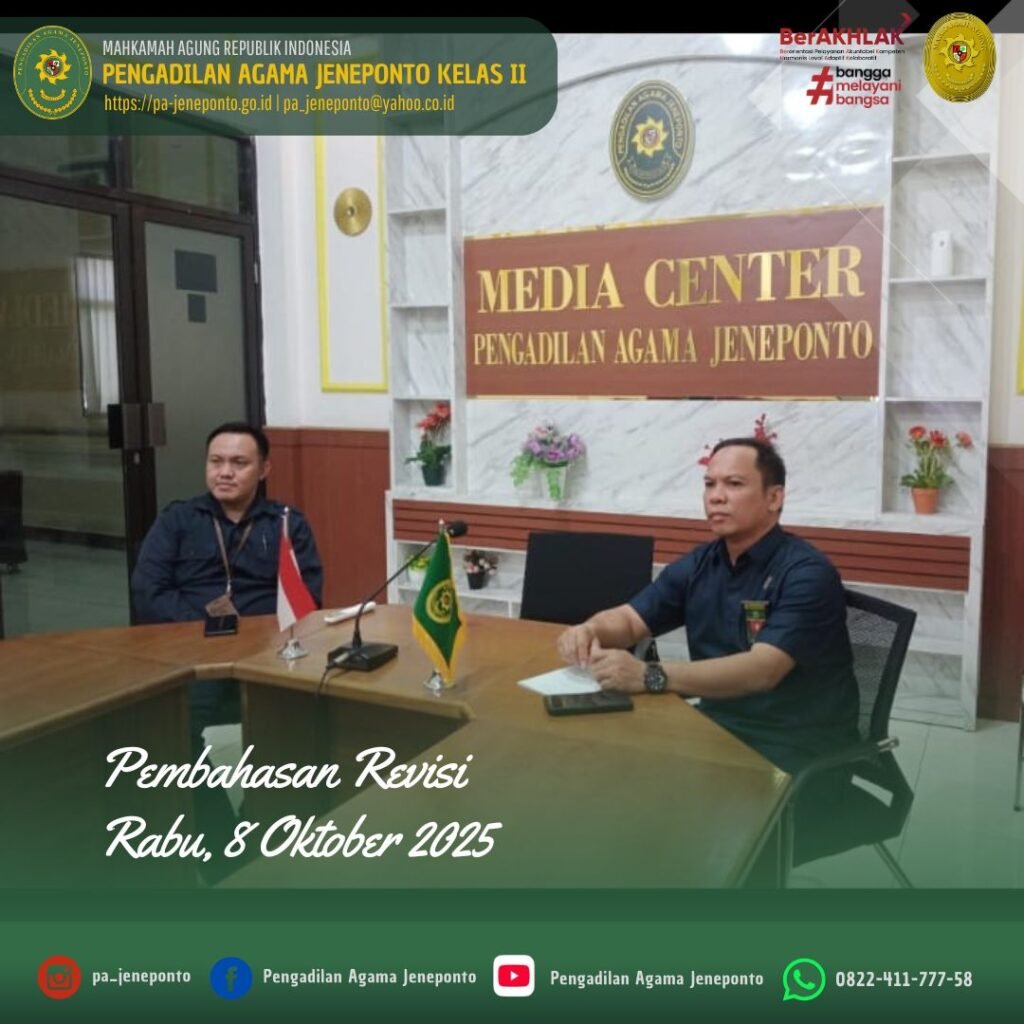 Rabu siang pukul 13.30 s.d. selesai, bertempat di Media Center Pengadilan Agama Jeneponto, Sekretaris Pengadilan Agama Jeneponto, H.Abdul Muiz, S.H.I.,M.H., dan Kasubag. PTIP Pengadilan Agama Jeneponto, Hendra Faisal Sanuddin, S.H., memenuhi Undangan Pembahasan Revisi, secara daring.