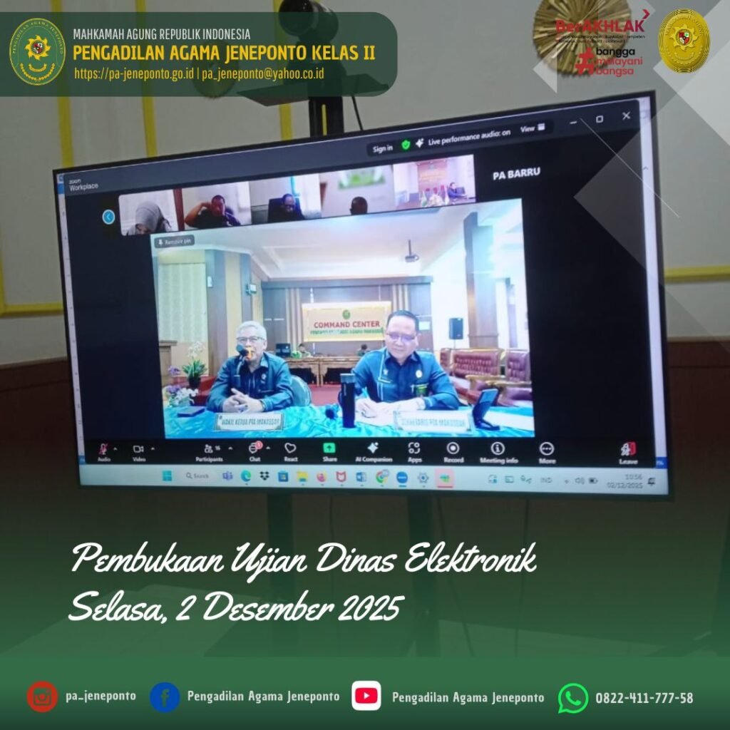 Selasa 08.00 Wita s.d. selesai, bertempat di Media Center Pengadilan Agama Jeneponto, Bapak H.Abdul Muiz, S.H.I.,M.H.I., Sekretaris Pengadilan Agama Jeneponto, mengikuti zoom dengan topik Pengarahan dan Pembukaan Ujian Dinas Elektronik Tahap 1 dan 2.