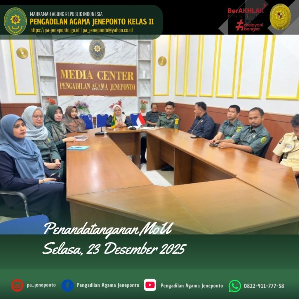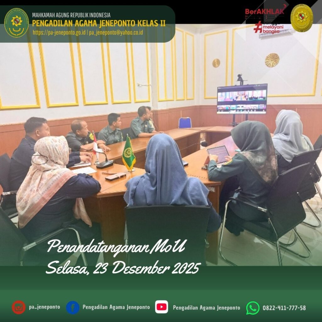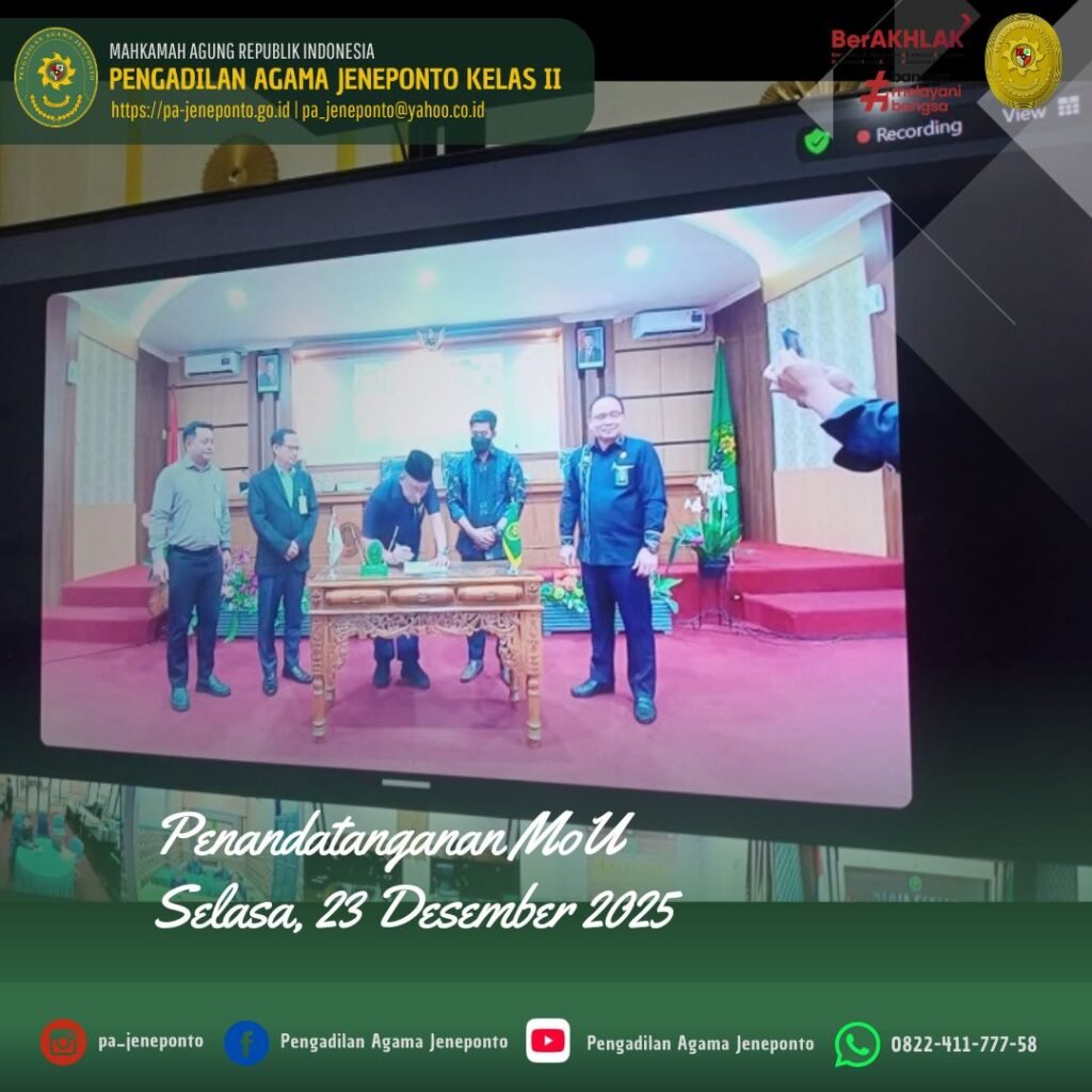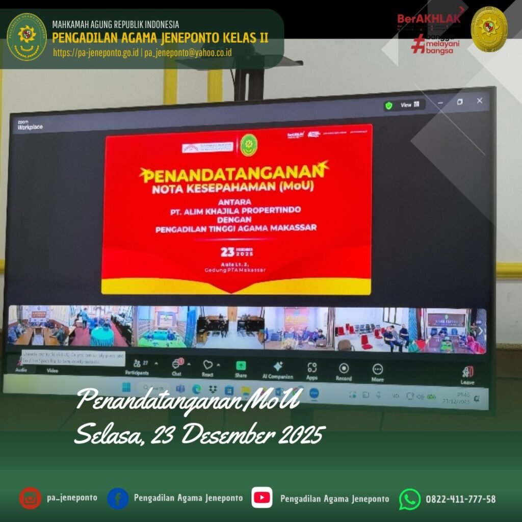 Selasa pagi, jam 09.00 Wita s.d. selesai, bertempat di Media Center Pengadilan Agama Jeneponto, Wakil Ketua, Panitera, seluruh Pejabat Struktural dan Fungsional serta PPPK, dan CPNS Pengadilan Agama Jeneponto, memenuhi Undangan Penandatanganan Nota Kesepahaman (MoU) PT Alim Khajila Properindo dengan Pengadilan Tinggi Agama Makassar, secara daring.