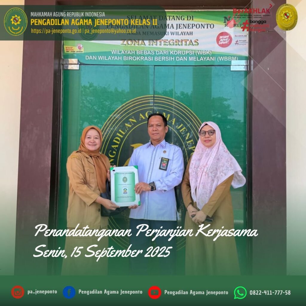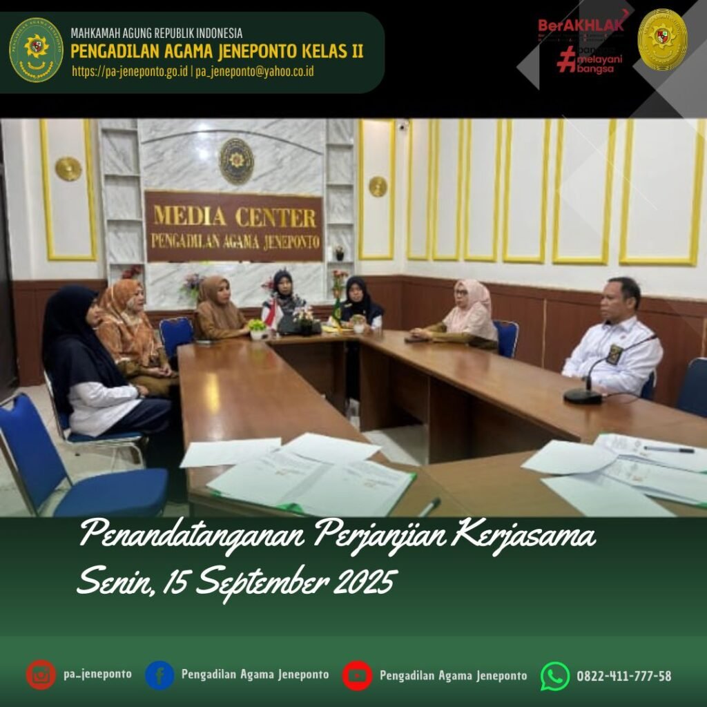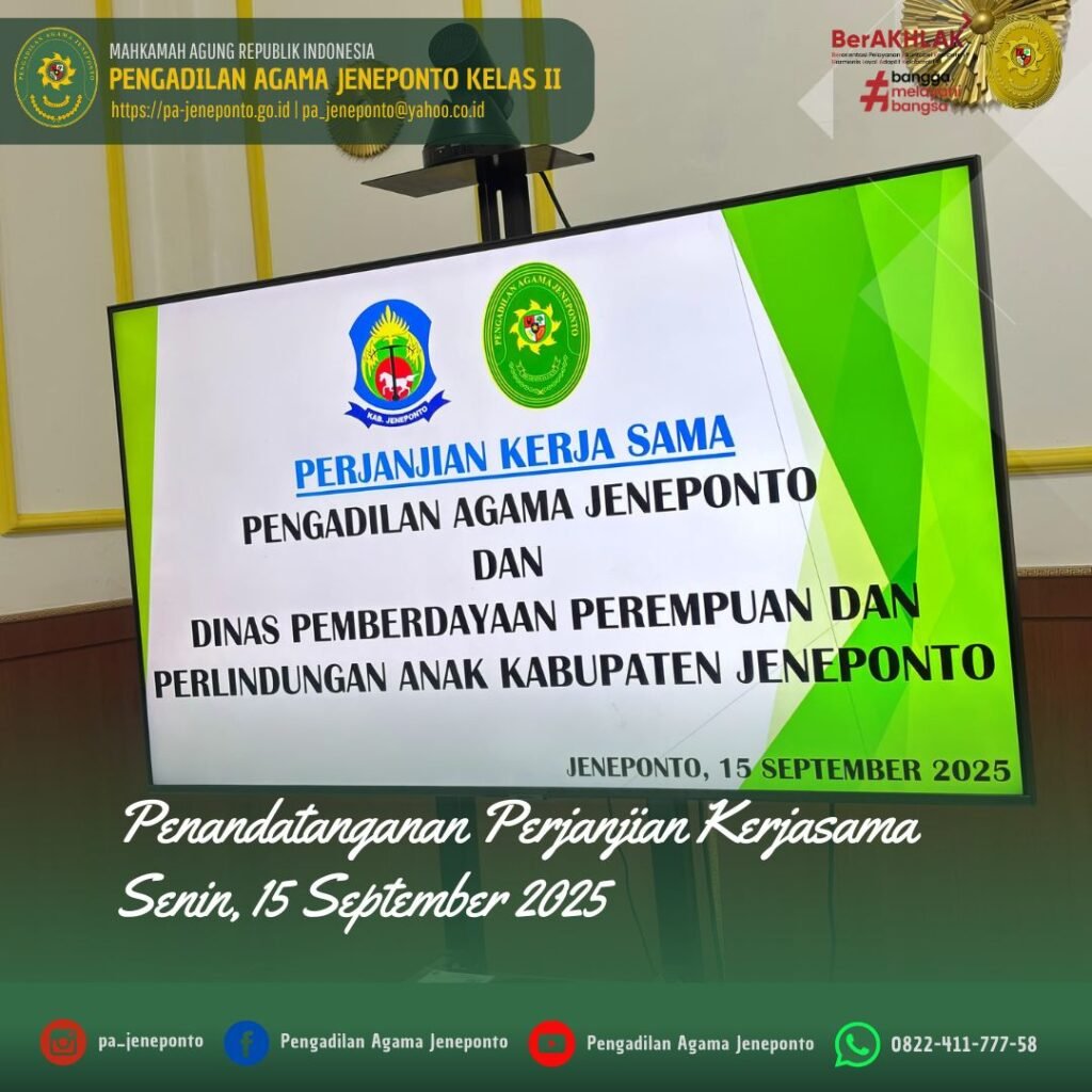 Senin pagi, bertempat di Ruang Media Center Pengadilan Agama Jeneponto dilaksanakan Penandatanganan Perjanjian Kerjasama Antara Pengadilan Agama Jeneponto dengan Dinas Pemberdayaan Perempuan dan Perlindungan Anak Kabupaten Jeneponto, dalam hal ini ditandatangani Ketua Pengadilan Agama Jeneponto Ibu Fadilah, S.Ag.,M.H., dengan Kepala Dinas Pemberdayaan Perempuan dan Perlindungan Anak Kabupaten Jeneponto, disaksikan oleh Wakil Ketua Pengadilan Agama Jeneponto Ibu Ruhana Faried, S.H.I.,M.H.I., dan Sekretaris Pengadilan Agama Jeneponto Bapak H.Abdul Muiz, S.H.I., M.H., Panitera Pengganti Pengadilan Agama Jeneponto Ibu Andi Ilham Nur Putri, S.H.