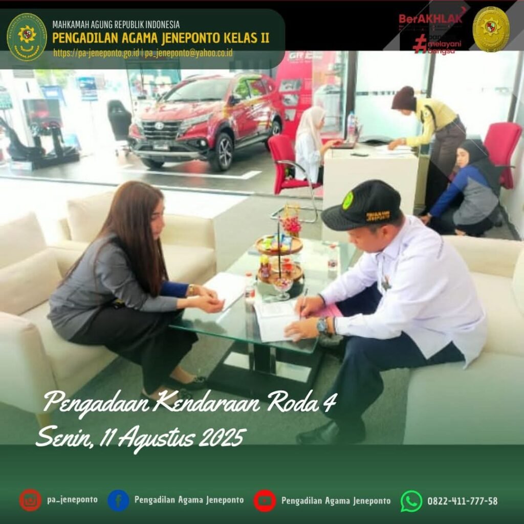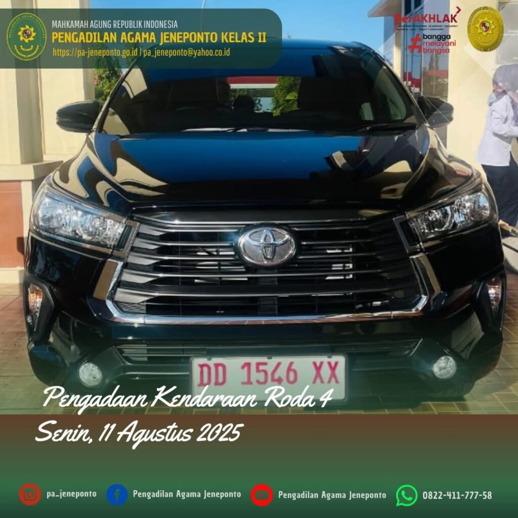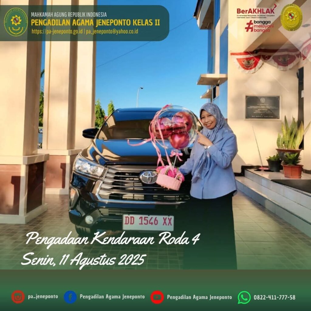 Alhamdulillah Pengadilan Agama Jeneponto akhirnya merealisasikan Belanja Modal Tahun 2025 berupa Pengadaan Kendaraan Roda 4 merk Toyota New Kijang Innova, segenap warga Pengadilan Agama Jeneponto merasa bersyukur atas tibanya kendaraan baru tersebut di Teras depan Kantor Pengadilan Agama Jeneponto yang sebelumnya pak Sekretaris Pengadilan Agama Jeneponto H.Abdul Muiz, S.H.I.,M.H. melakukan serah terima di Kantor Toyota Makassar Cabang Urip Sumoharjo yang didampingi oleh PPNPN Pengadilan Agama Jeneponto Muh. Nurul Ulum.