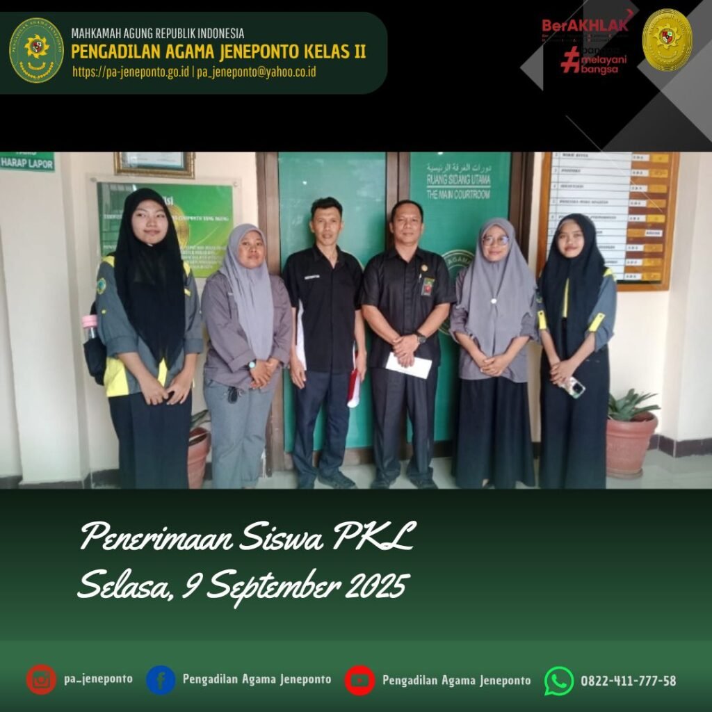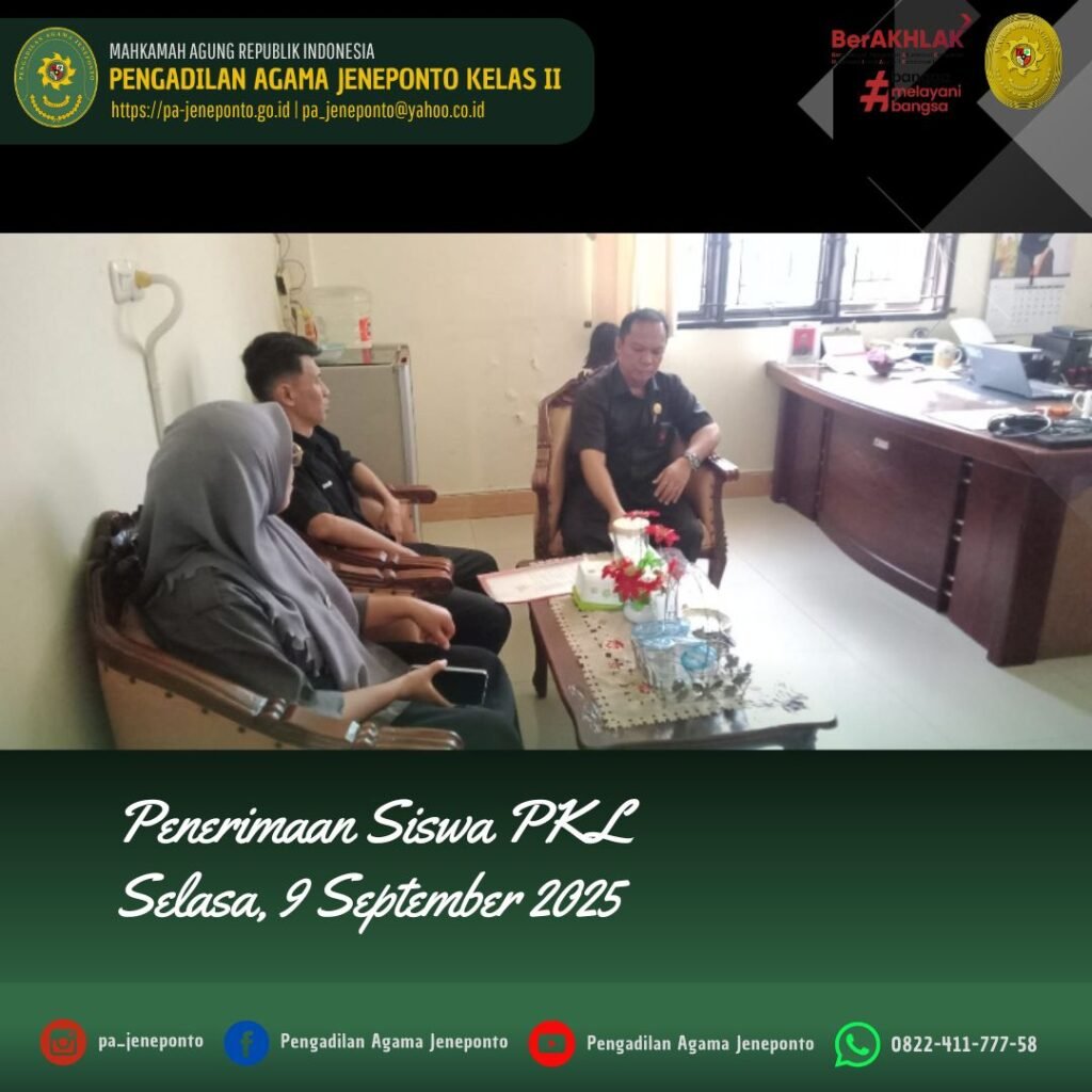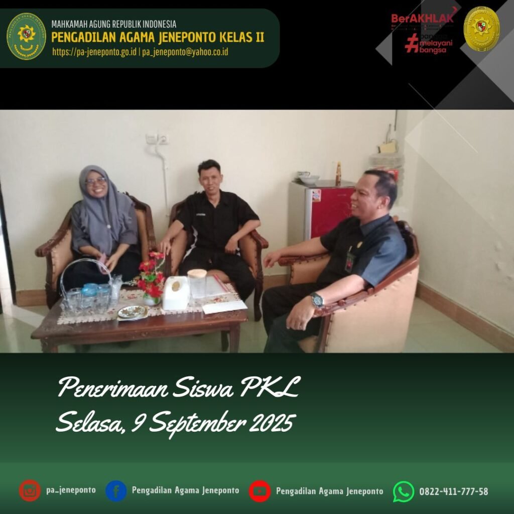 Sekretaris Pengadilan Agama Jeneponto H.Abdul Muiz, S.H.,M.H. menerima Guru Pembimbing dan Siswa SMK Negeri 3 Jeneponto, para siswa PKL ini yang berjumlah 2 (dua) orang akan melaksanakan Praktek Kerja Lapangan (PKL) di Kantor Pengadilan Agama Jeneponto terhitung mulai hari Rabu, 10 September 2025.