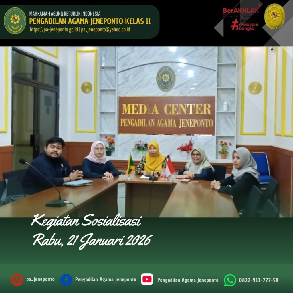 Rabu pagi, jam 08.00 Wita s.d. selesai, bertempat di Media Center Pengadilan Agama Jeneponto, Ketua, Wakil Ketua, serta Hakim Pengadilan Agama Jeneponto, memenuhi Undangan mengikuti kegiatan Penguatan Literasi Perencanaan dan Pengelolaan Keuangan sesuai Kode Etik dan Pedoman Perilaku Hakim, yang dilaksanakan secara daring via zoom.