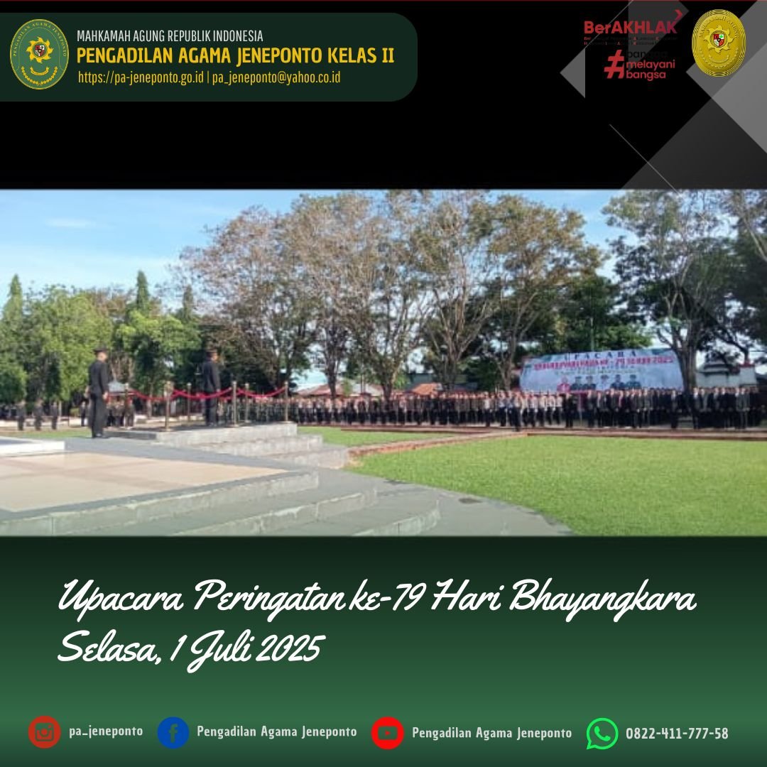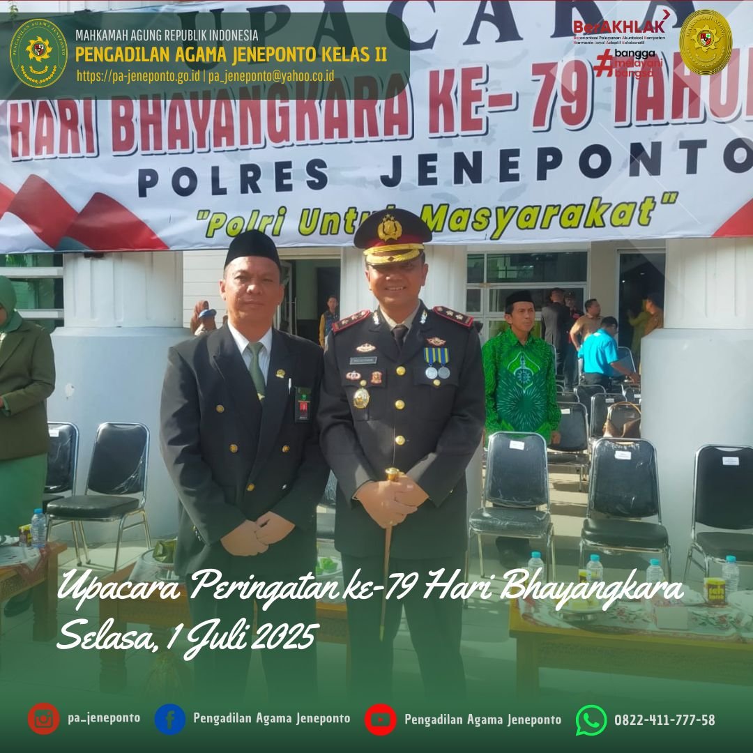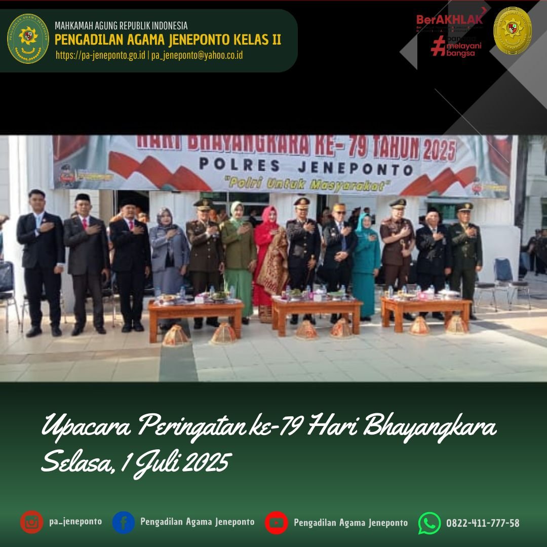 Selasa pagi, pukul 08.00 Wita, Sekretaris Pengadilan Agama Jeneponto Bapak H. Abdul Muiz, S.H.I., M.H., mengikuti Upacara HUT ke 79 Bhayangkara Tahun 2025, bertempat di Halaman Kantor Bupati Jeneponto, dengan Tema “POLRI untuk Masyarakat”.