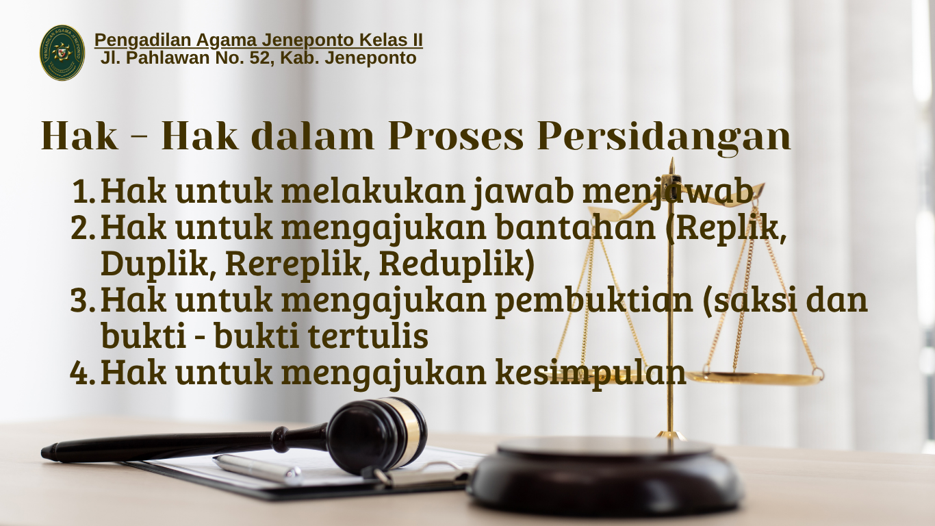 Masyarakat yang mempunyai permasalahan atau sengketa mengenai sesuatu yang berkaitan dengan wewenang Pengadilan Agama, dapat mengajukan gugatan atau permohonan ke Pengadilan Agama Jeneponto Kelas II