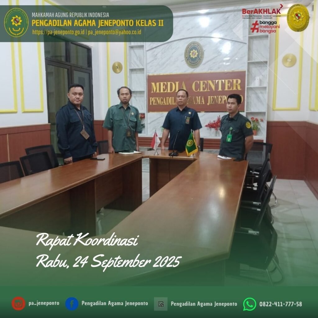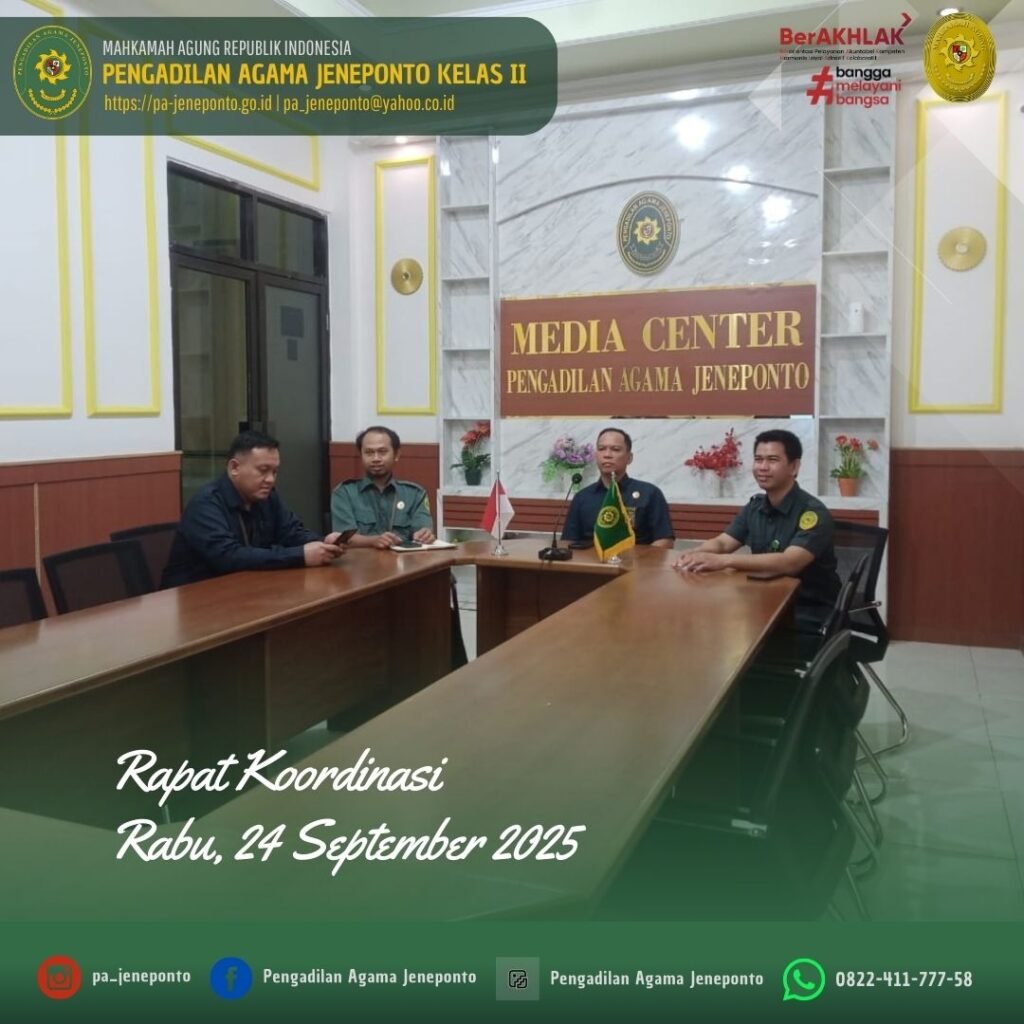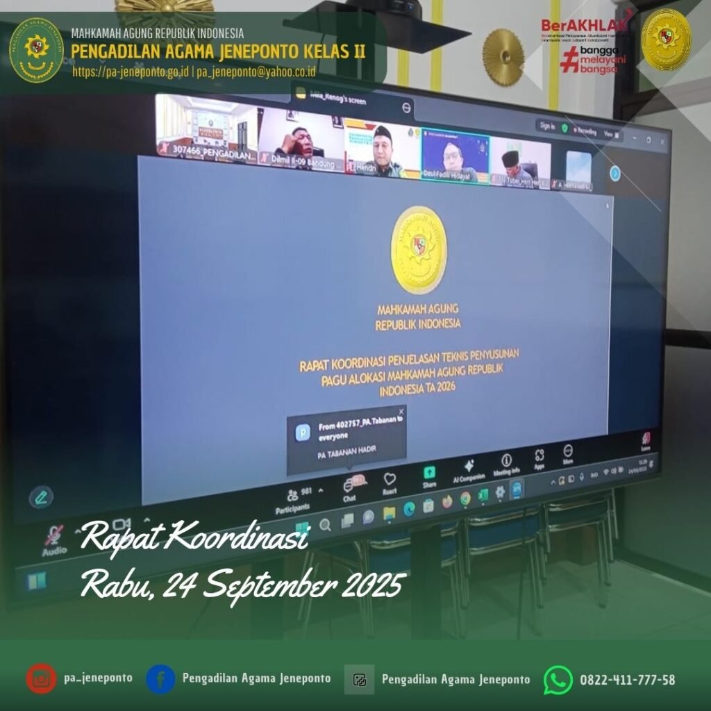 Kamis siang pukul 13.30 s.d. selesai, bertempat di Media Center Pengadilan Agama Jeneponto, Sekretaris Pengadilan Agama Jeneponto, H.Abdul Muiz, S.H.I.,M.H., dan Kasubag. PTIP Hendra Faisal Sanuddin, S.H., serta Muh. Ikhwan Triantoro, S.T., Teknisi Sarana dan Prasarana, Muhammad Yunus Marthan PPPK Pengadilan Agama Jeneponto, memenuhi Undangan Rapat Koordinasi dalam rangka Persiapan dan Penyempurnaan penyusunan RKA-K/L Pagu Alokasi TA. 2026.