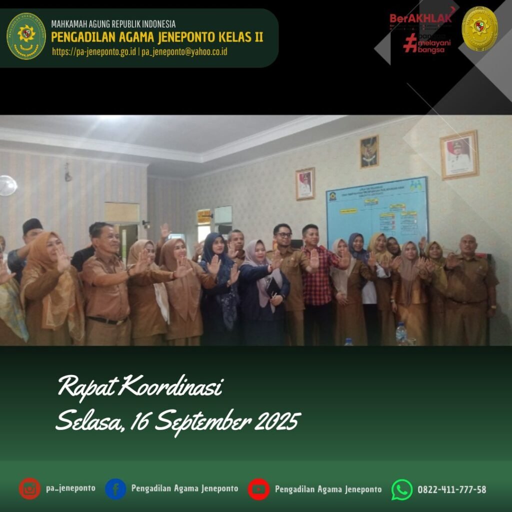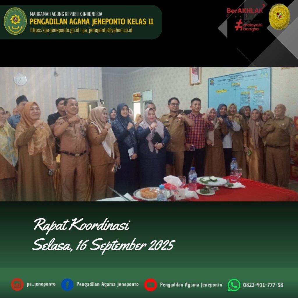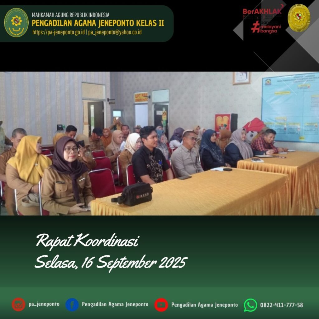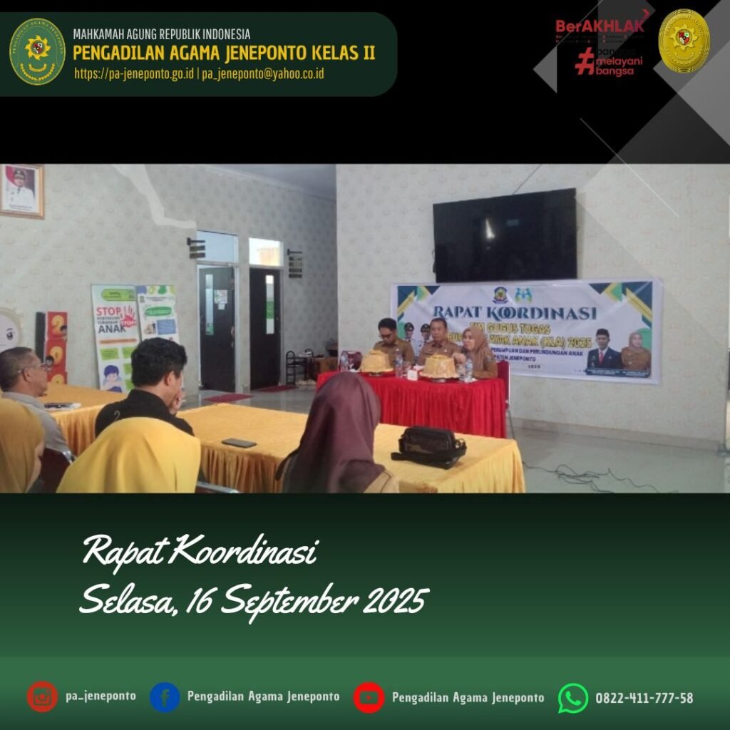 Selasa pagi, pukul 08.30 sampai selesai bertempat di Aula Dinas Pemberdayaan Perempuan dan Perlindungan Kabupaten Jeneponto, Ibu Ardhayani Arja, S.H.I., Panitera Muda Permohonan dan Ibu Andi Ilham Nur Putri, S.H. Panitera Pengganti Pengadilan Agama Jeneponto memenuhi undangan dalam Rapat Koordinasi Tim Gugus Tugas Kabupaten Layak Anak (KLA) Tahun 2025 pada Sub Kegiatan Koordinasi dan Sinkronisasi Pelembagaan Pemenuhan Hak Anak Kewenangan Kabupaten/Kota Tahun 2025.
