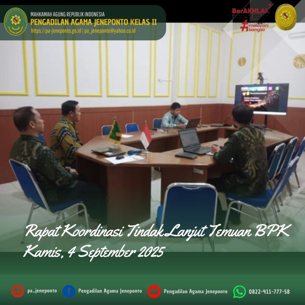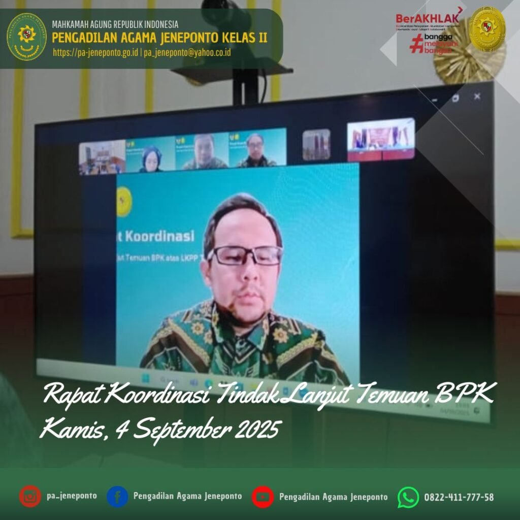Kamis pagi pukul 09.00 s.d. selesai, bertempat di Media Center Pengadilan Agama Jeneponto, Sekretaris Pengadilan Agama Jeneponto, H.Abdul Muiz, S.H.I.,M.H., dan Kasubag. PTIP Hendra Faizal Sanudin, S.H., serta Muh. Ikhwan Triantoro, S.T., Teknisi Sarana dan Prasarana, memenuhi Undangan Rapat Koordinasi Tindak Lanjut Temuan BPK atas LKPP Tahun 2024, dalam kegiatan ini dititik beratkan pada temuan atas terdapatnya permasalahan data aset yang perlu dilakukan verifikasi dan konfirmasi.