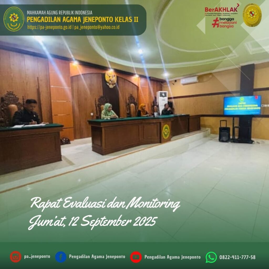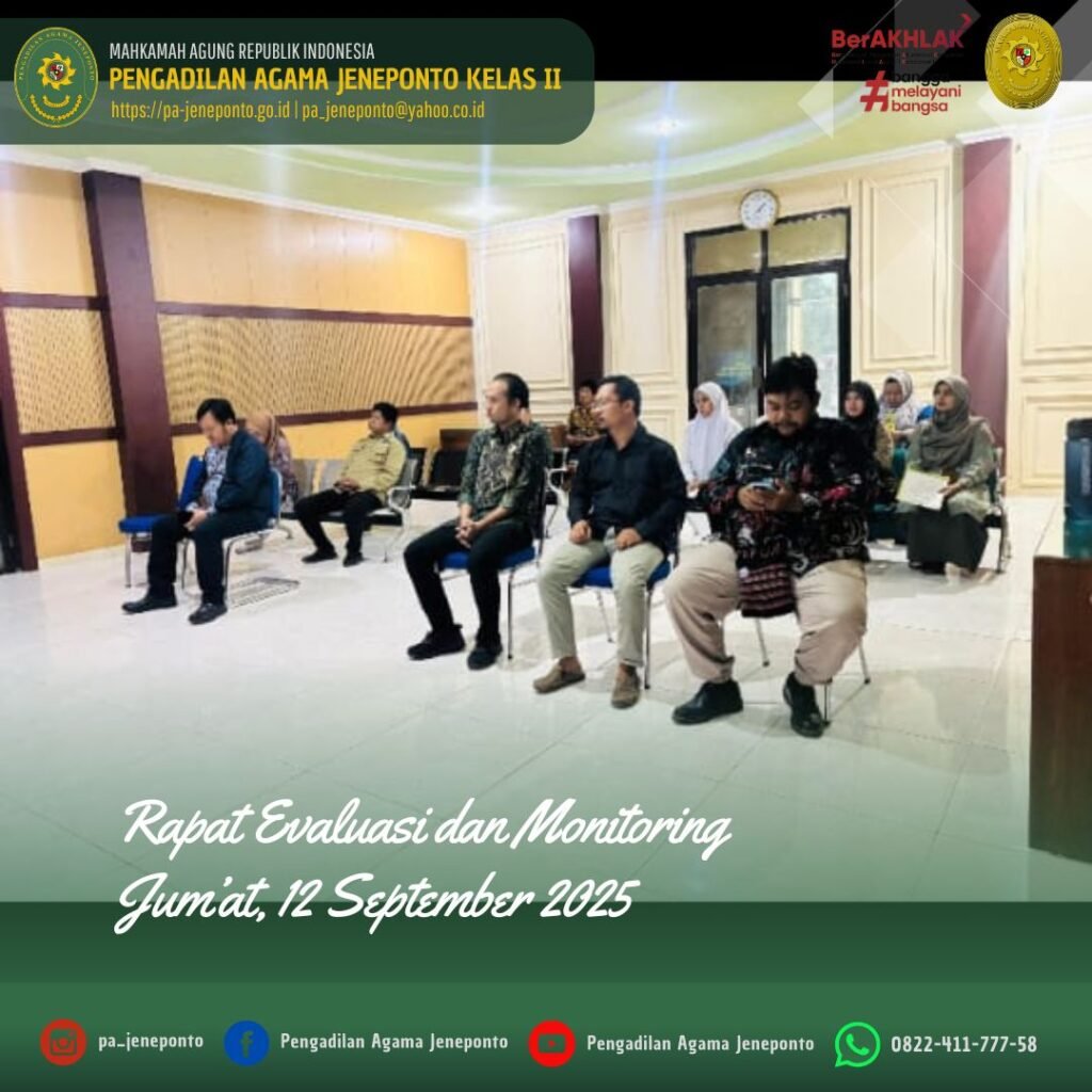 Jum’at siang pukul 14.00 s.d. 15.00 Wita, Bertempat di Ruang Aula / Sidang Utama Pengadilan Agama Jeneponto, dilaksanakan Rapat Evaluasi dan Monitoring oleh Pimpinan Pengadilan Agama Jeneponto dihadiri unsur pimpinan yaitu Ketua, Wakil Ketua, Hakim, Panitera dan Sekretaris Pengadilan Agama Jeneponto, Pejabat Struktural, Fungsional serta PPPK Pengadilan Agama Jeneponto.