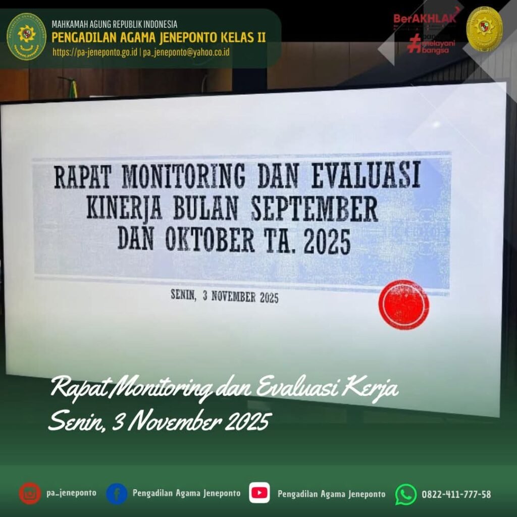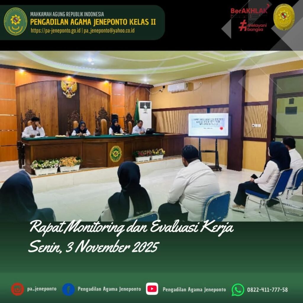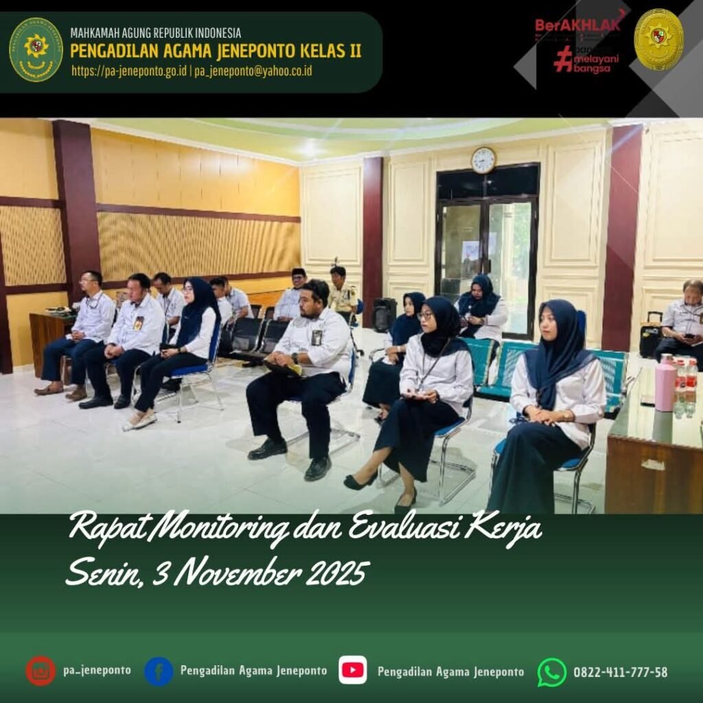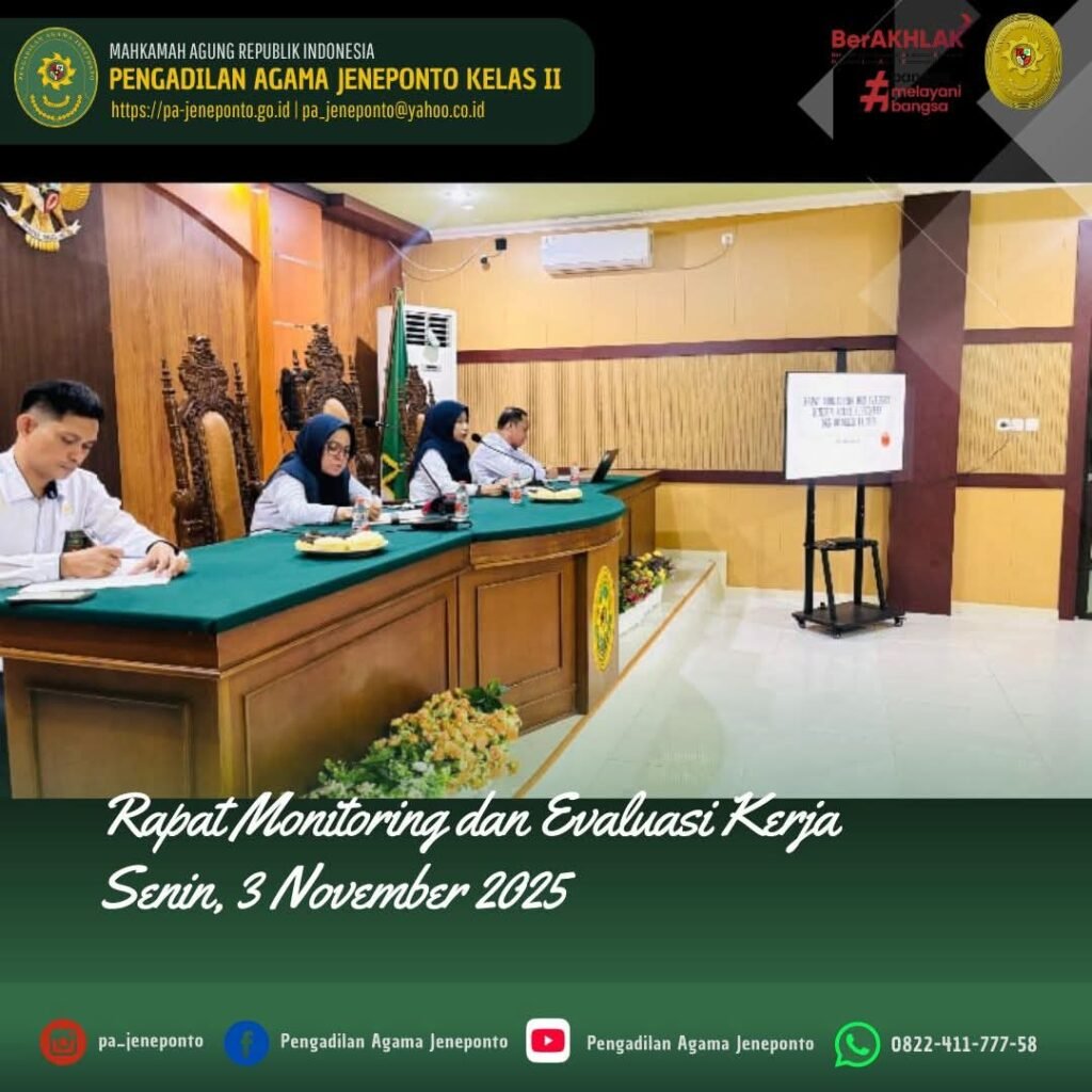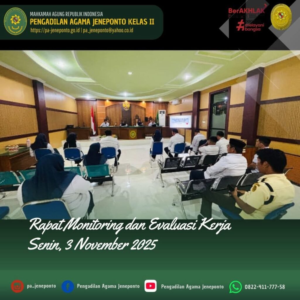 Senin pagi pukul 08.30 s.d. 12.00 Wita, Bertempat di Ruang Aula / Sidang Utama Pengadilan Agama Jeneponto, dilaksanakan Rapat Evaluasi dan Monitoring oleh Pimpinan Pengadilan Agama Jeneponto dihadiri unsur pimpinan yaitu Ketua, Wakil Ketua, Hakim, Panitera dan Sekretaris Pengadilan Agama Jeneponto, Pejabat Struktural, Fungsional serta PPPK Pengadilan Agama Jeneponto.