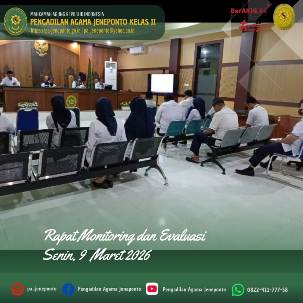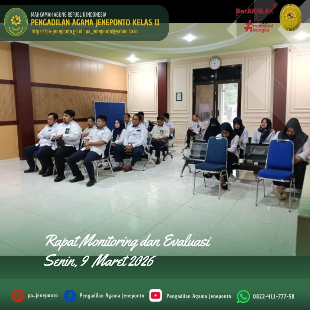 Senin pagi pukul 08.30 s.d. 11.00 Wita, Bertempat di Ruang Aula / Sidang Utama Pengadilan Agama Jeneponto, dilaksanakan Rapat Monitoring dan Evaluasi pada bulan Januari dan Februari tahun 2026, oleh Pimpinan Pengadilan Agama Jeneponto dihadiri unsur pimpinan yaitu Ketua, Wakil Ketua, Hakim, Panitera dan Sekretaris Pengadilan Agama Jeneponto, Pejabat Struktural, Fungsional serta PPPK Pengadilan Agama Jeneponto.
