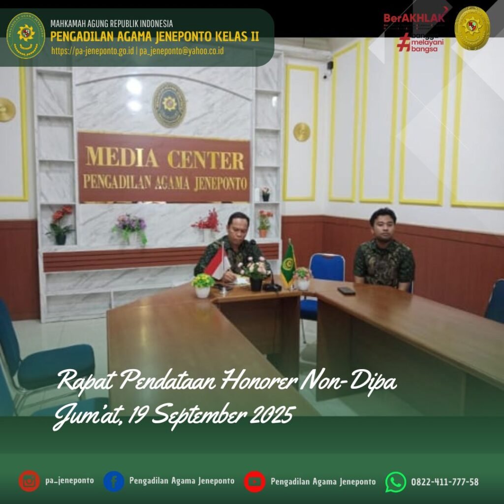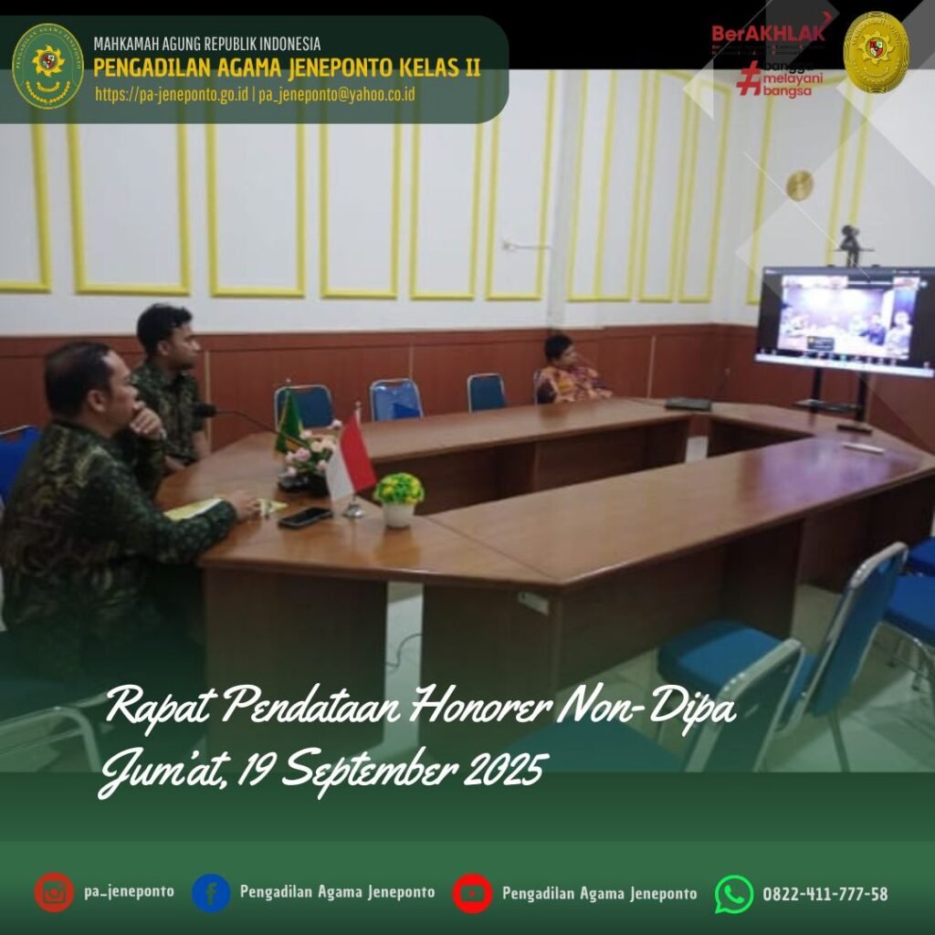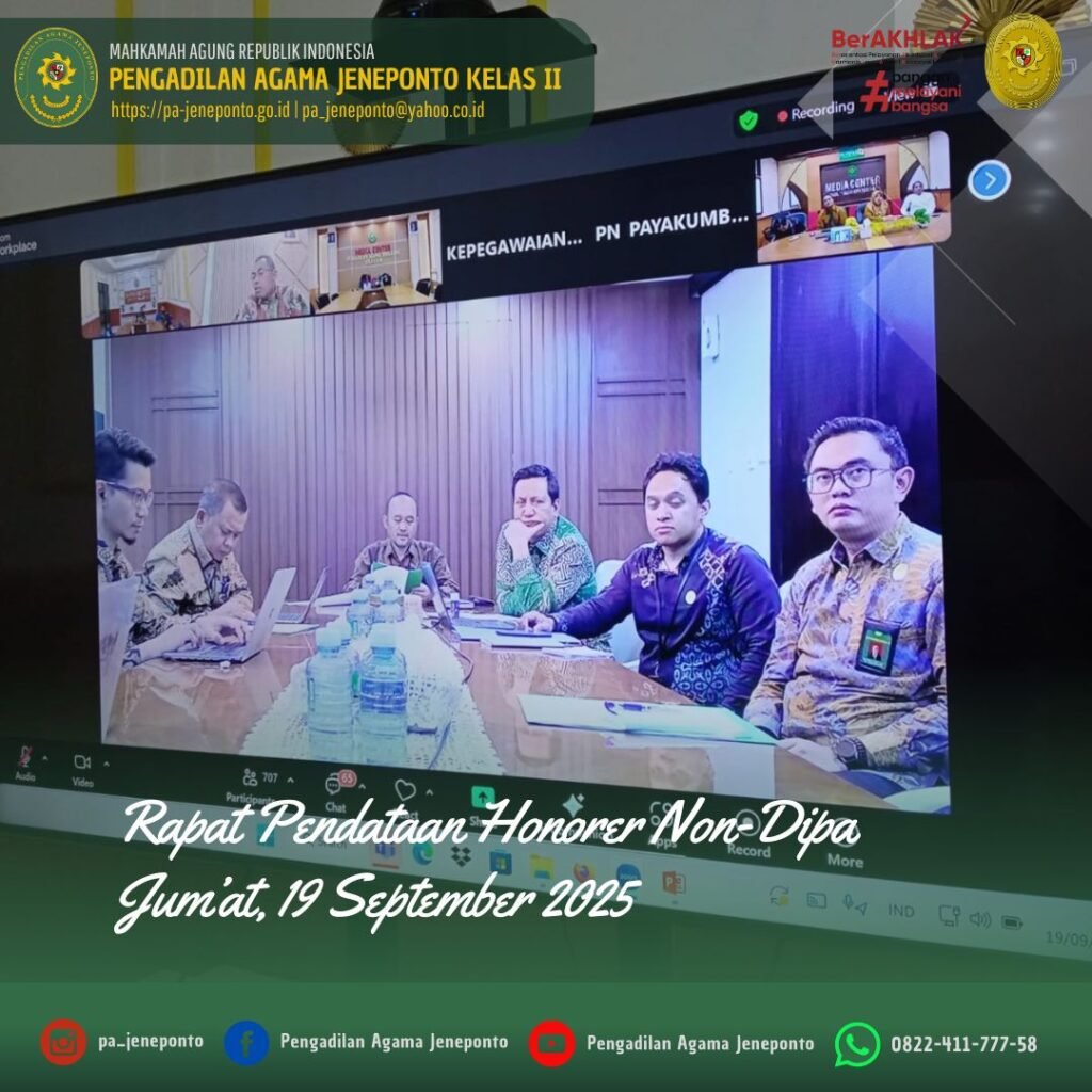 Jum’at siang 15.00, bertempat di Media Center Pengadilan Agama Jeneponto, H.Abdul Muiz, S.H.I.,M.H., Sekretaris Pengadilan Agama Jeneponto mengikuti Zoom Meeting dengan Agenda “Rapat Pendataan Honorer” secara Daring.