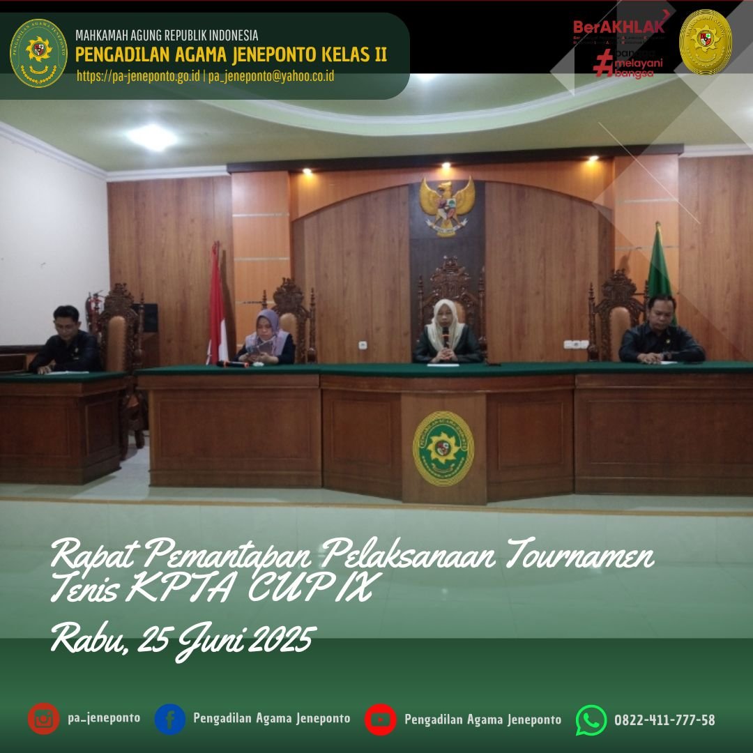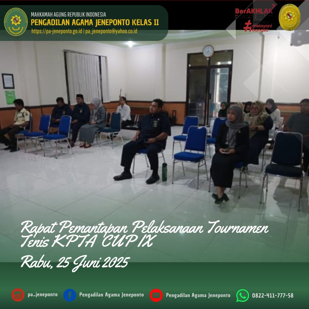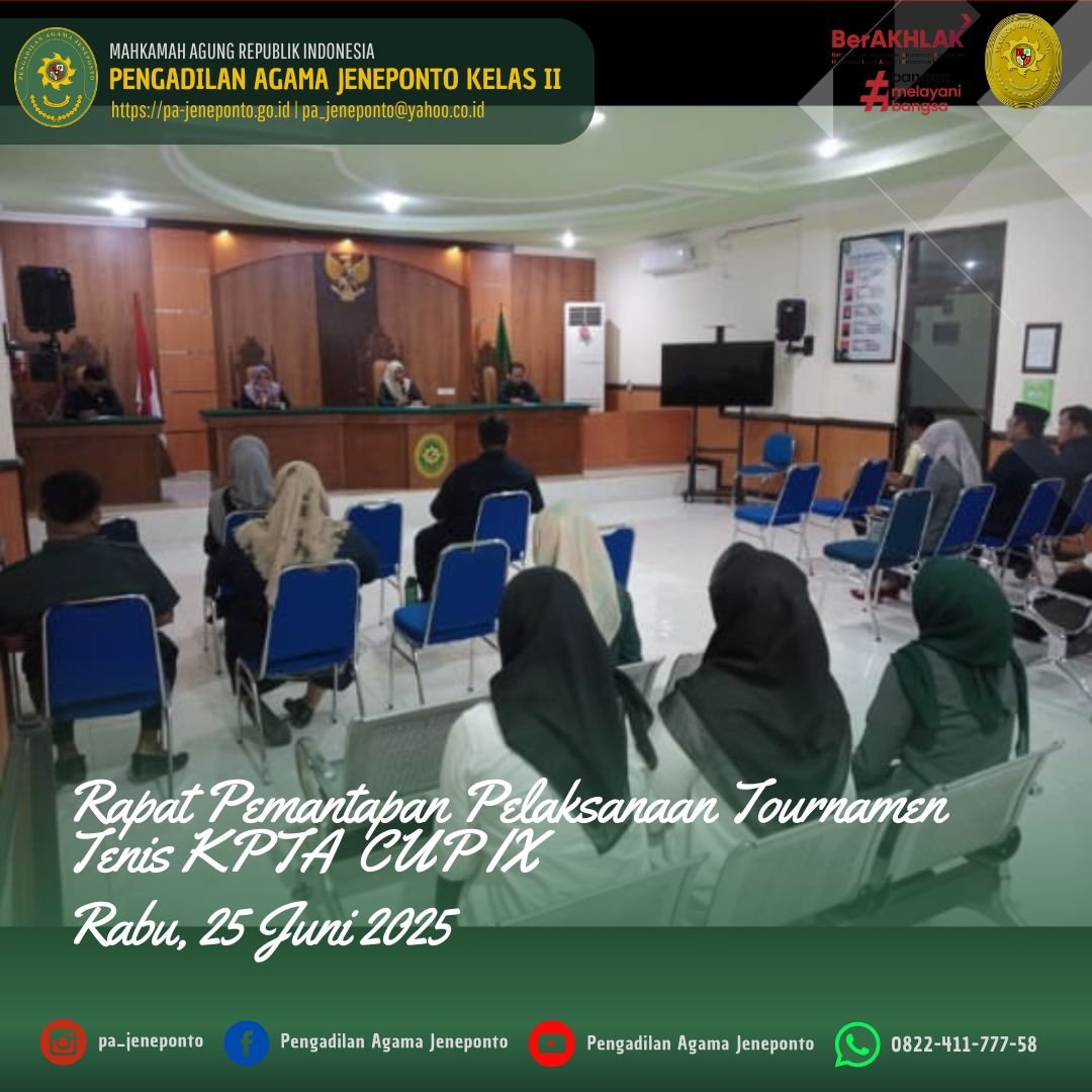 Rabu pagi pukul 08.00 s.d. 10.00 Wita, Bertempat di Ruang Aula / Sidang Utama Pengadilan Agama Jeneponto, dilaksanakan Rapat Pemantapan Persiapan Pemberangkatan Pembukaan dan Turnamen Tenis KPTA CUP IX di Kabupaten Pangkep pada tanggal 26-29 Juni 2025, oleh Pimpinan Pengadilan Agama Jeneponto dihadiri unsur pimpinan yaitu Ketua, Wakil Ketua, Hakim, Panitera dan Sekretaris Pengadilan Agama Jeneponto, Pejabat Struktural, Fungsional serta PPNPN dan CPNS Pengadilan Agama Jeneponto.