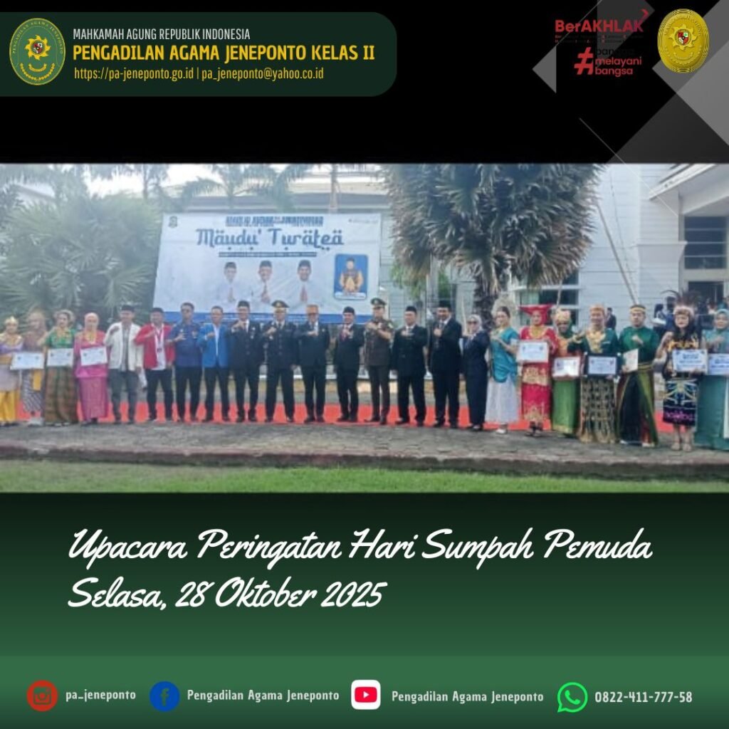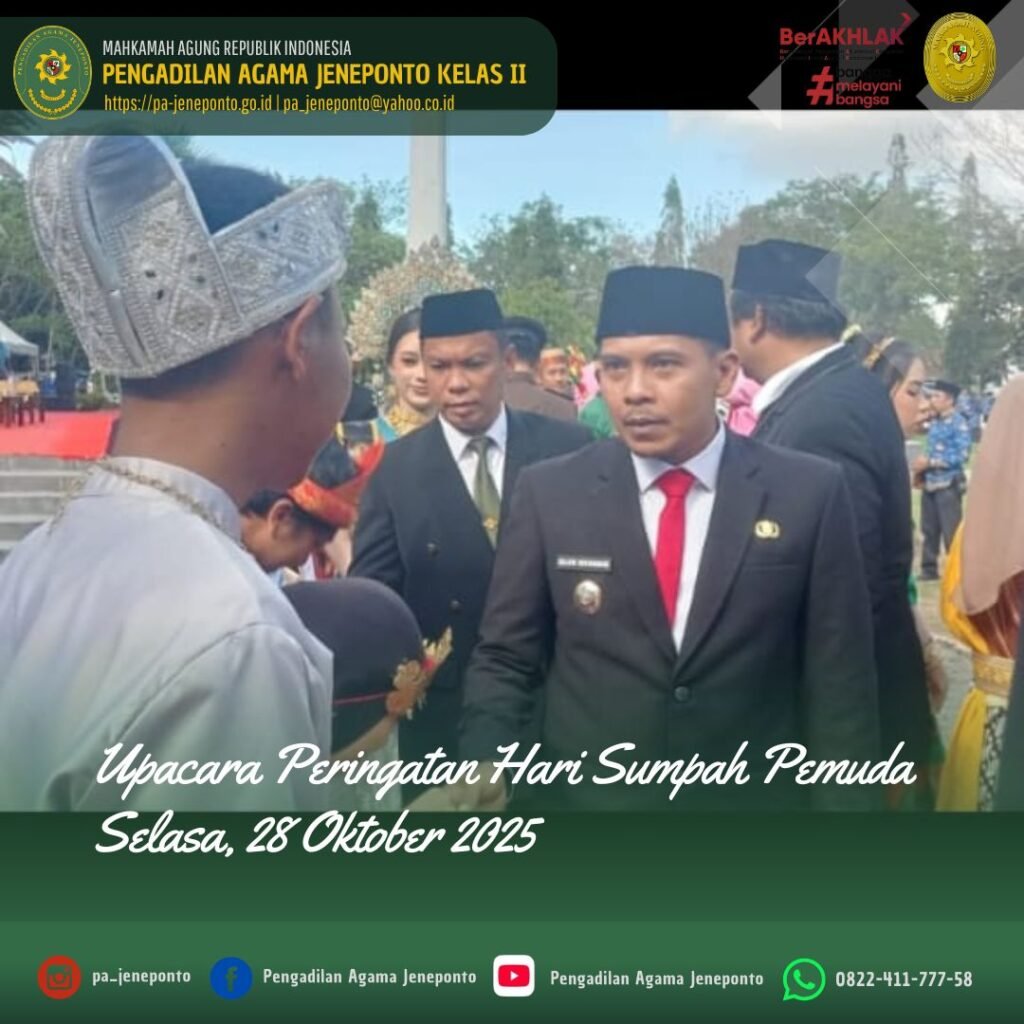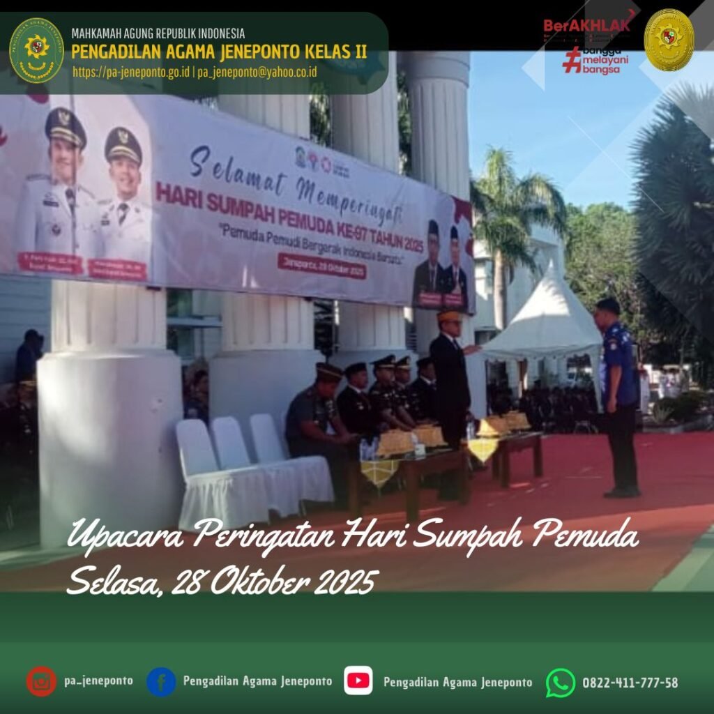 Selasa pagi, pukul 08.00 sampai selesai bertempat di Halaman Depan Kantor Bupati Jeneponto, Bapak H.Abdul Muiz, S.H.I.,M.H.I., Sekretaris Pengadilan Agama Jeneponto, memenuhi Undangan Upacara Peringatan Hari Sumpah Pemuda ke-97 Tahun 2025 dengan tema “Pemuda Pemudi Bergerak Indonesia Bersatu”.