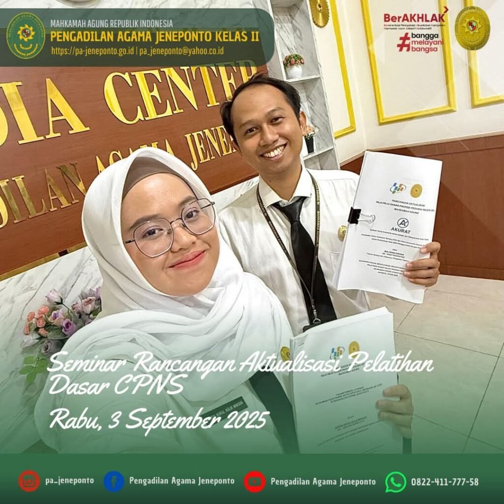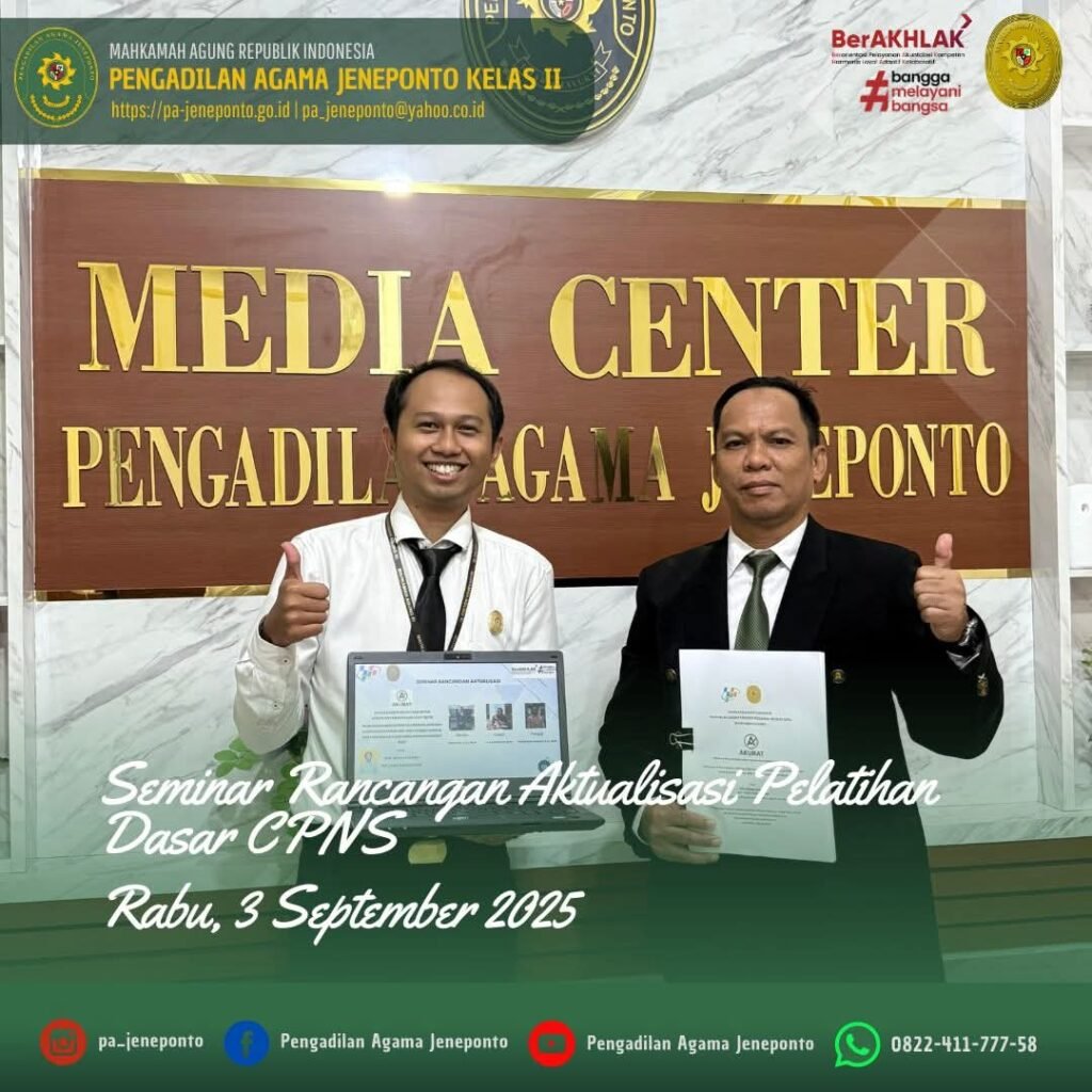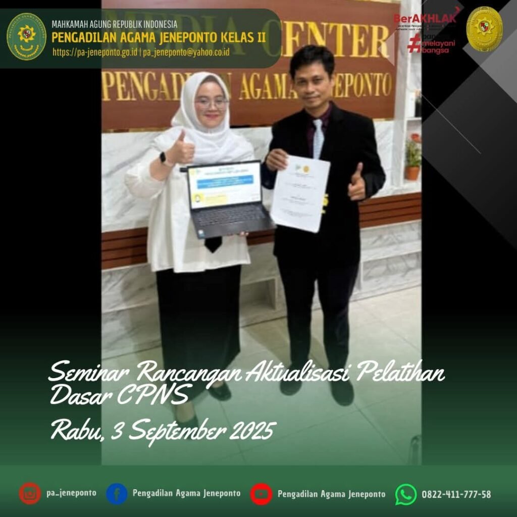 Seminar Rancangan Aktualisasi ini bertujuan untuk menyampaikan ide dan gagasan peserta, memperoleh masukan, serta menyempurnakan rancangan yang telah disusun, sehingga dapat diimplementasikan dengan baik di Pengadilan Agama Jeneponto.